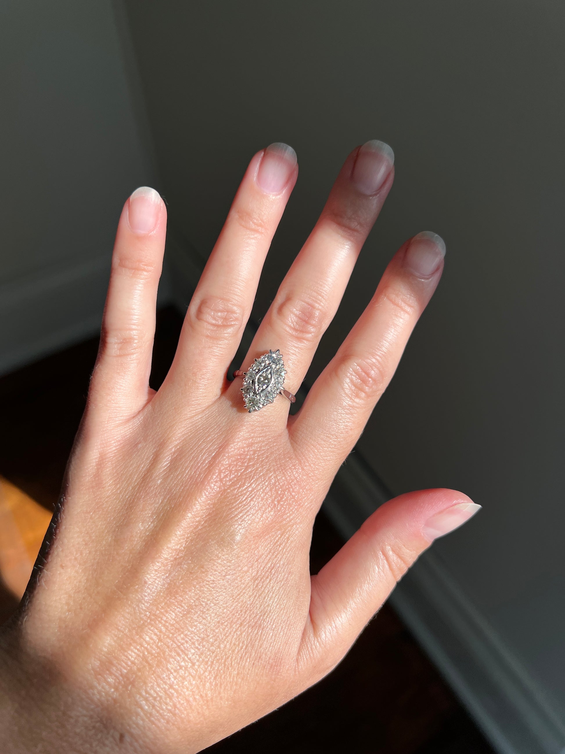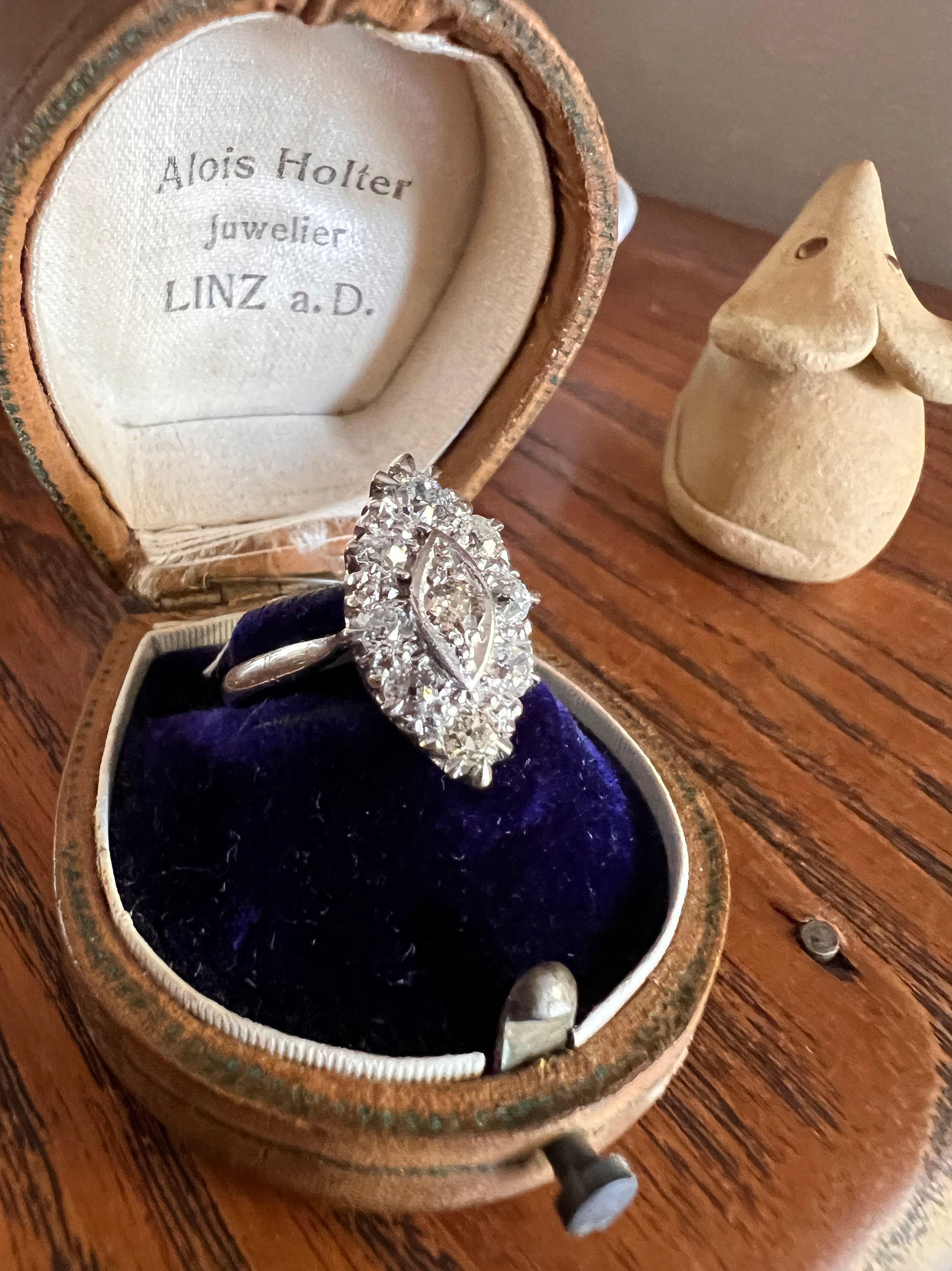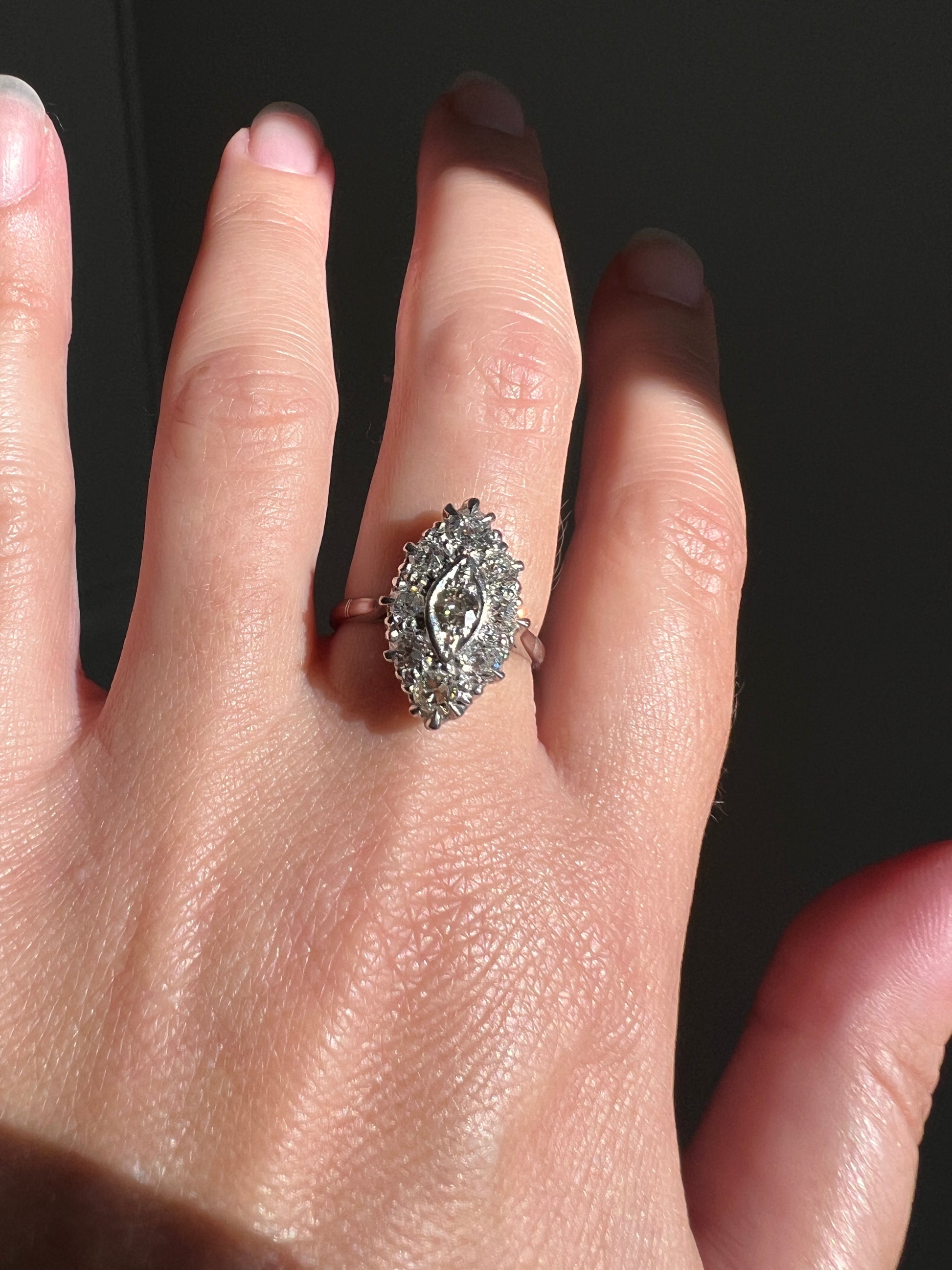 Antique 1.1 Carat 9 Old Mine Cut DIAMOND Navette Marquise RING 18k White Gold PLATINUM