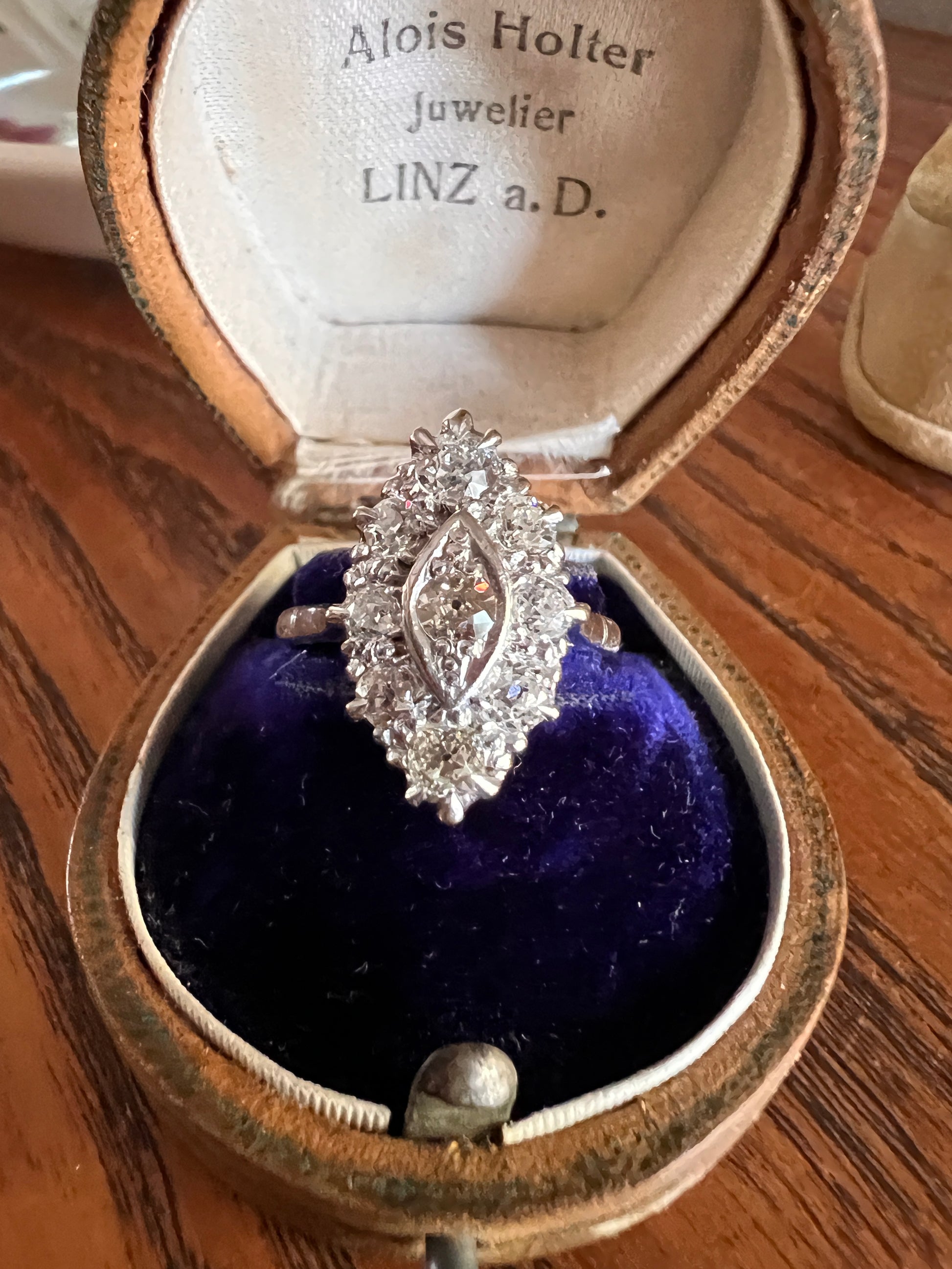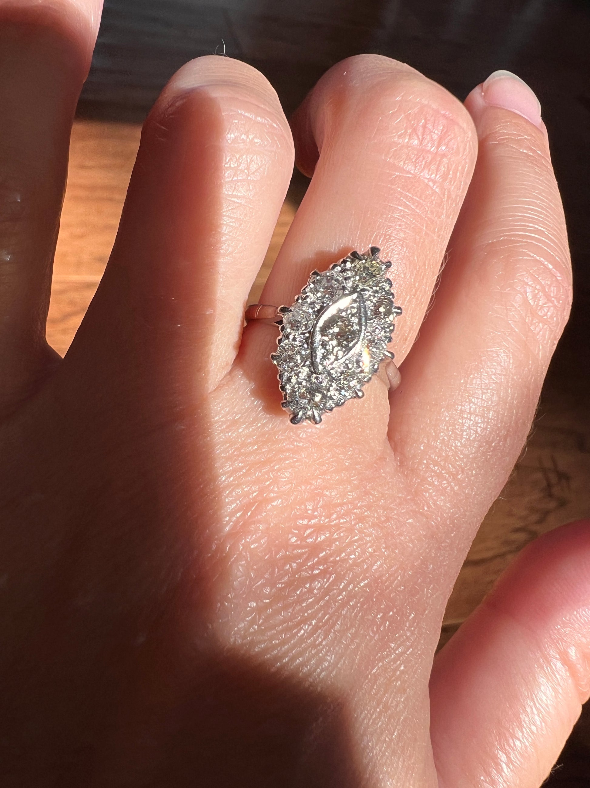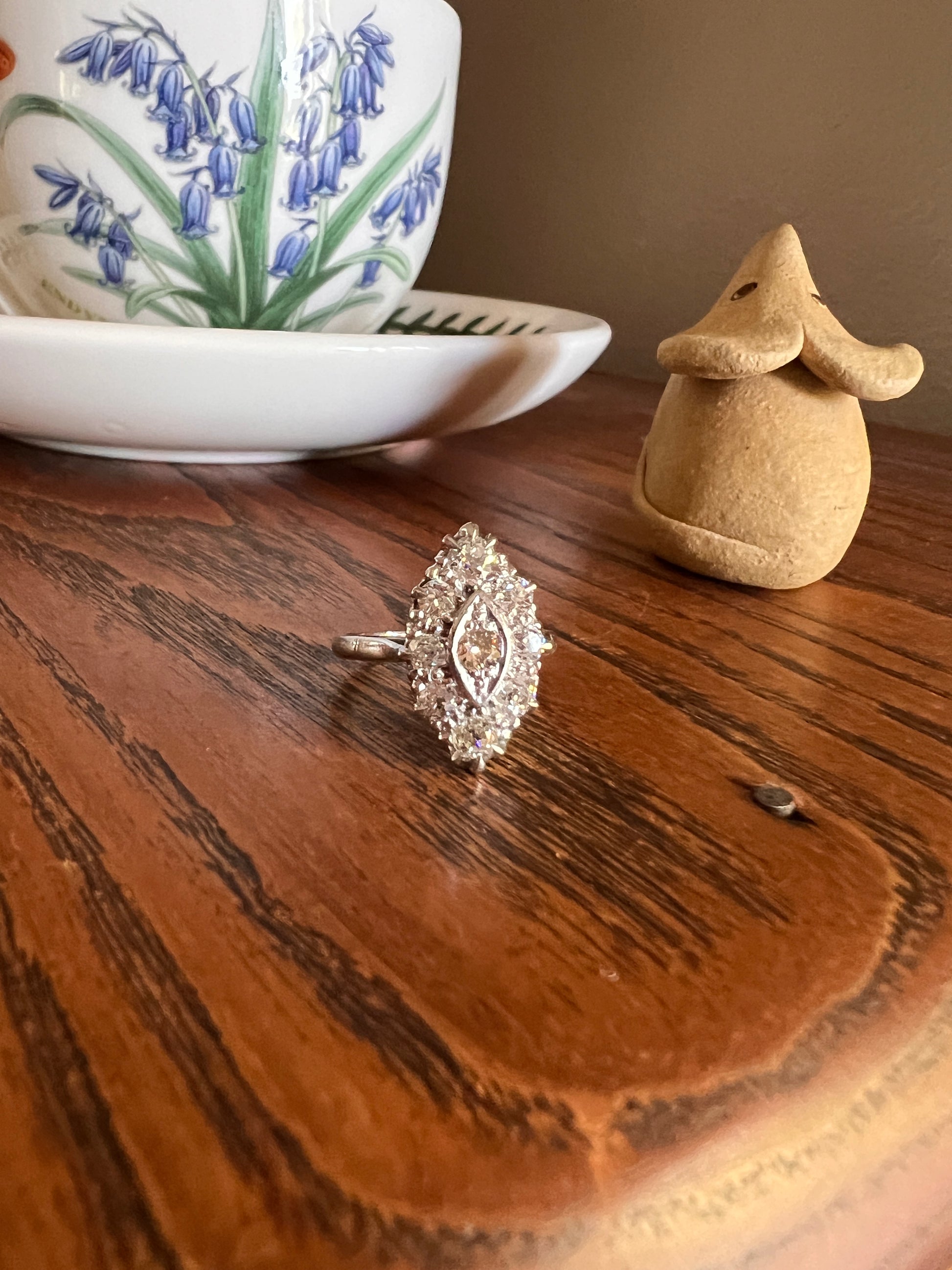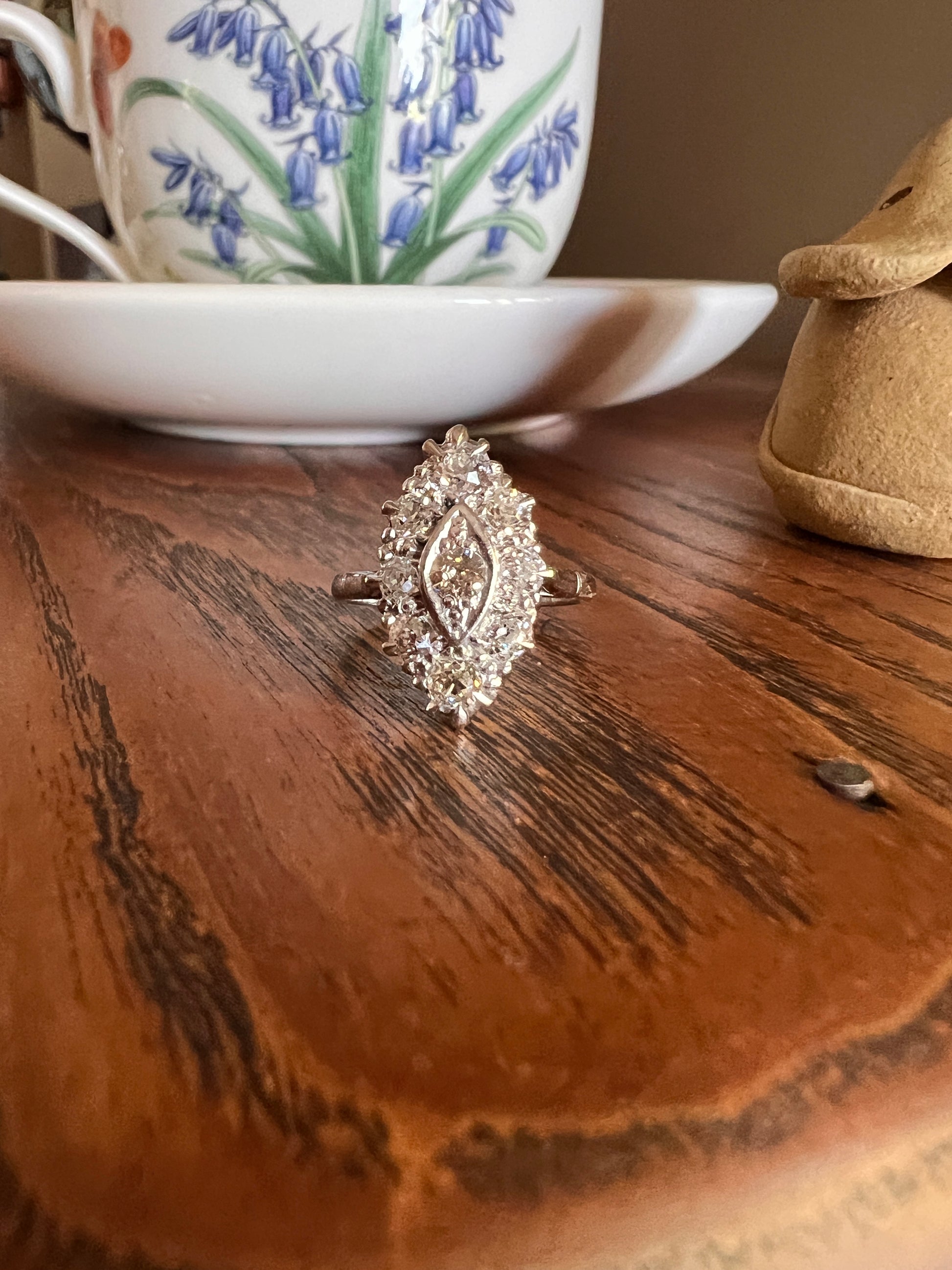 Antique 1.1 Carat 9 Old Mine Cut DIAMOND Navette Marquise RING 18k White Gold PLATINUM