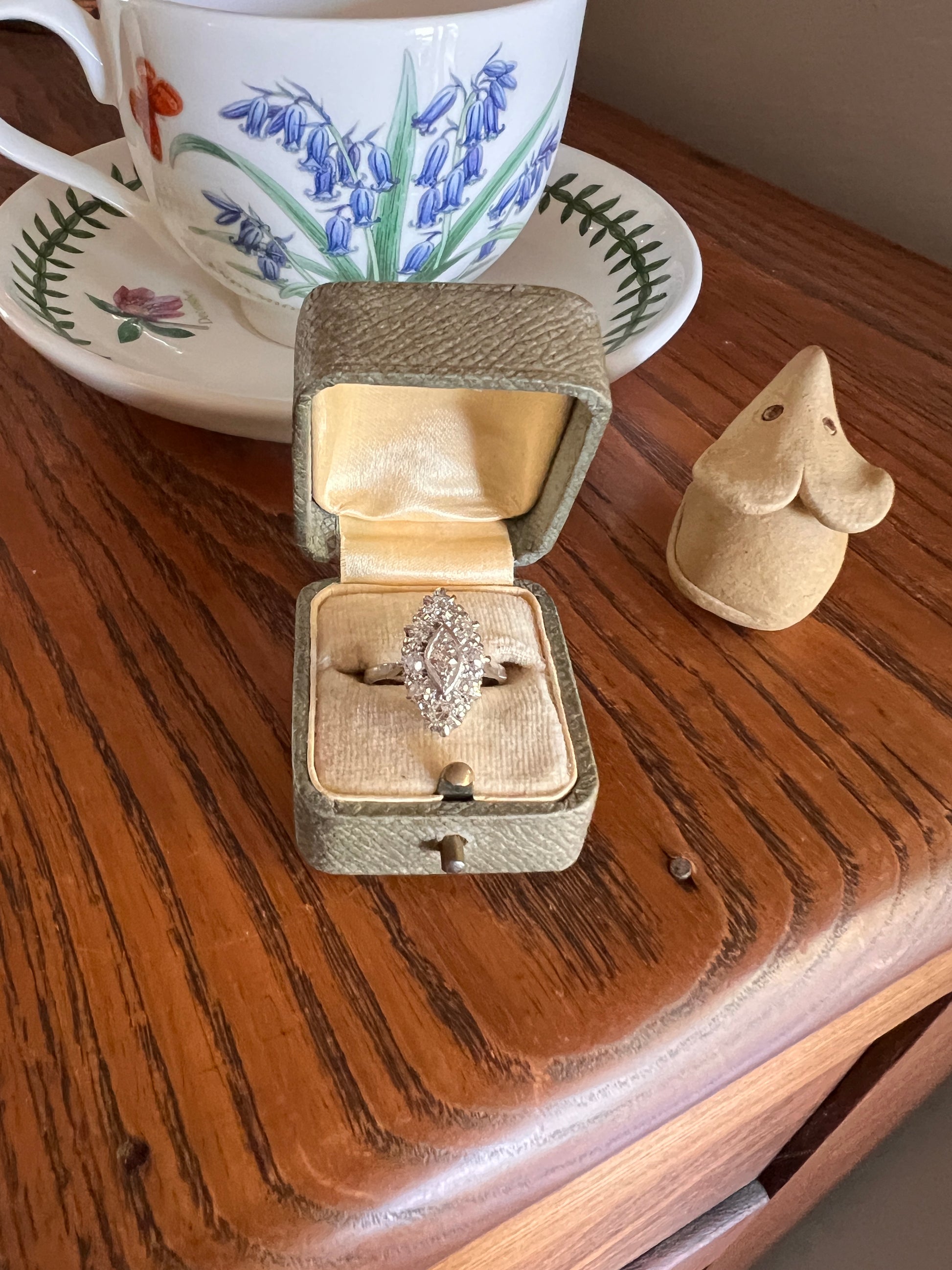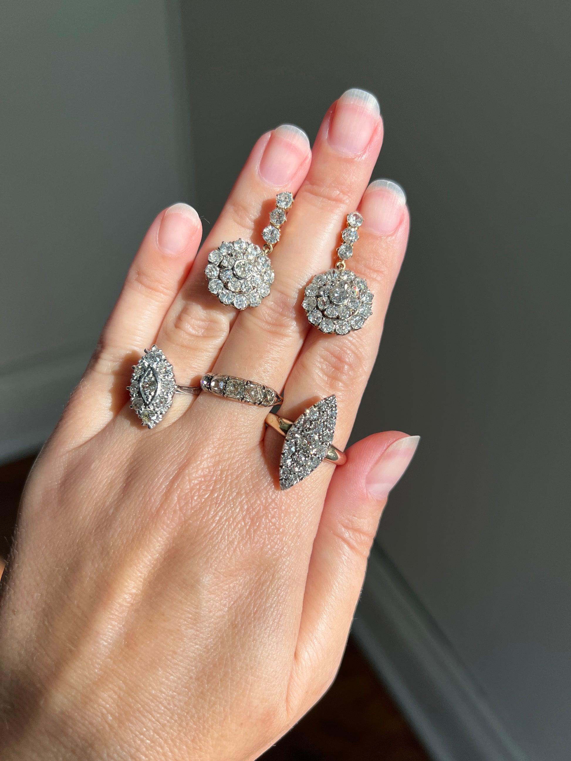 Those that follow me I'm sure see my weakness for diamond clusters and navettes are a personal fav - I love their drama! Here is another chunky antique one set with 9 diamonds totaling 1.1 carats for a beautiful sparkle. This piece is crafted in 18k gold and platinum. Sturdy gallery gives the the ring face a bit of a lift to prop the piece beautifully off the finger for additional attention grabbing. As an added benefit, this one is ready for regular wear as the pointed talon prongs have lots of length to hold the diamonds securely.