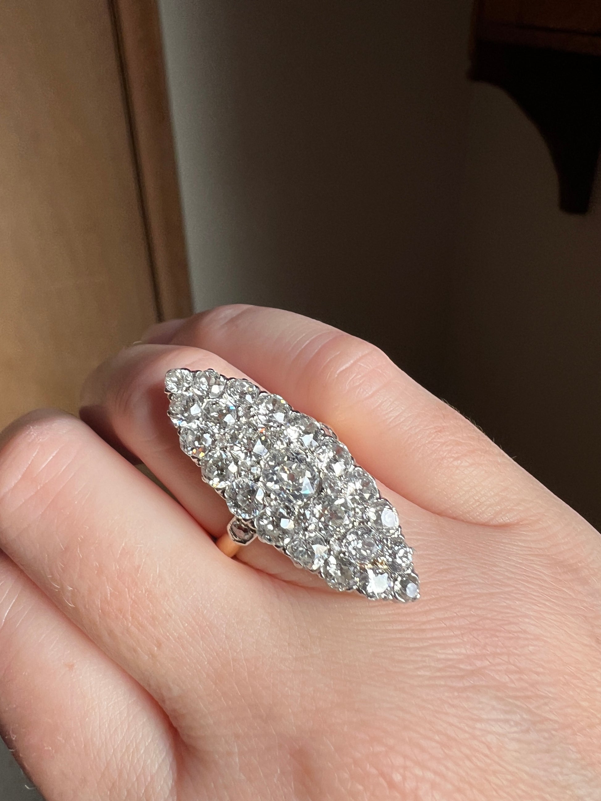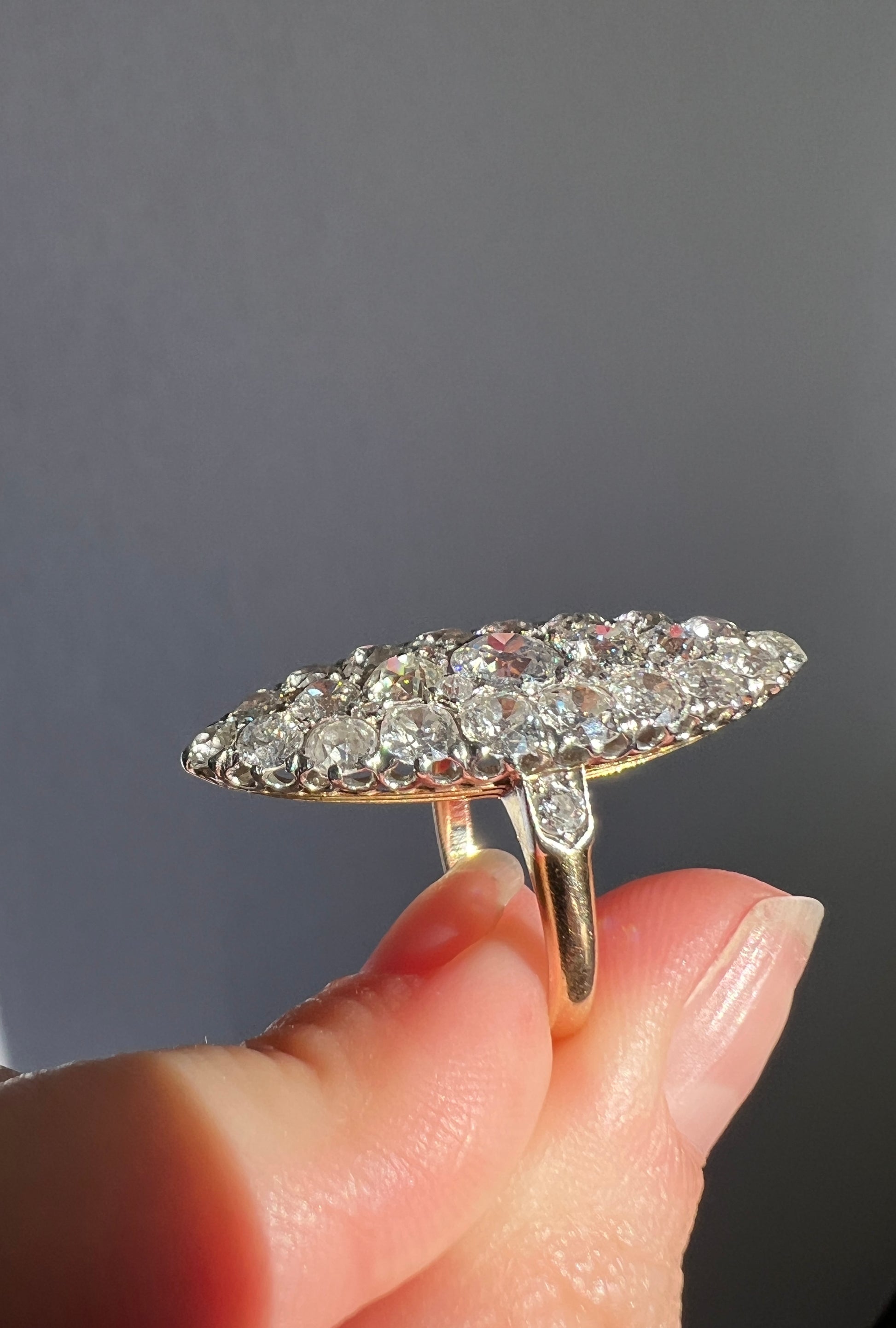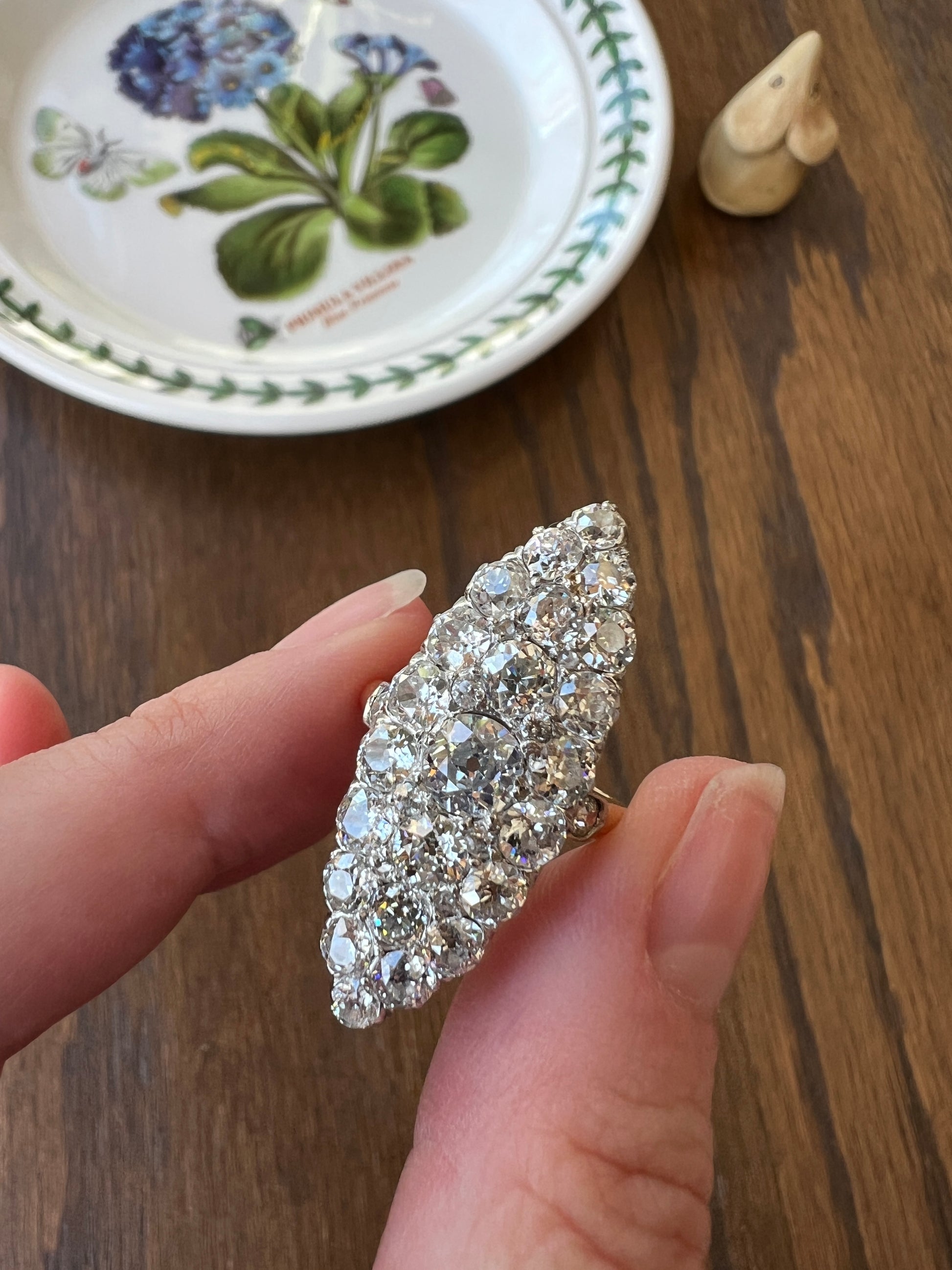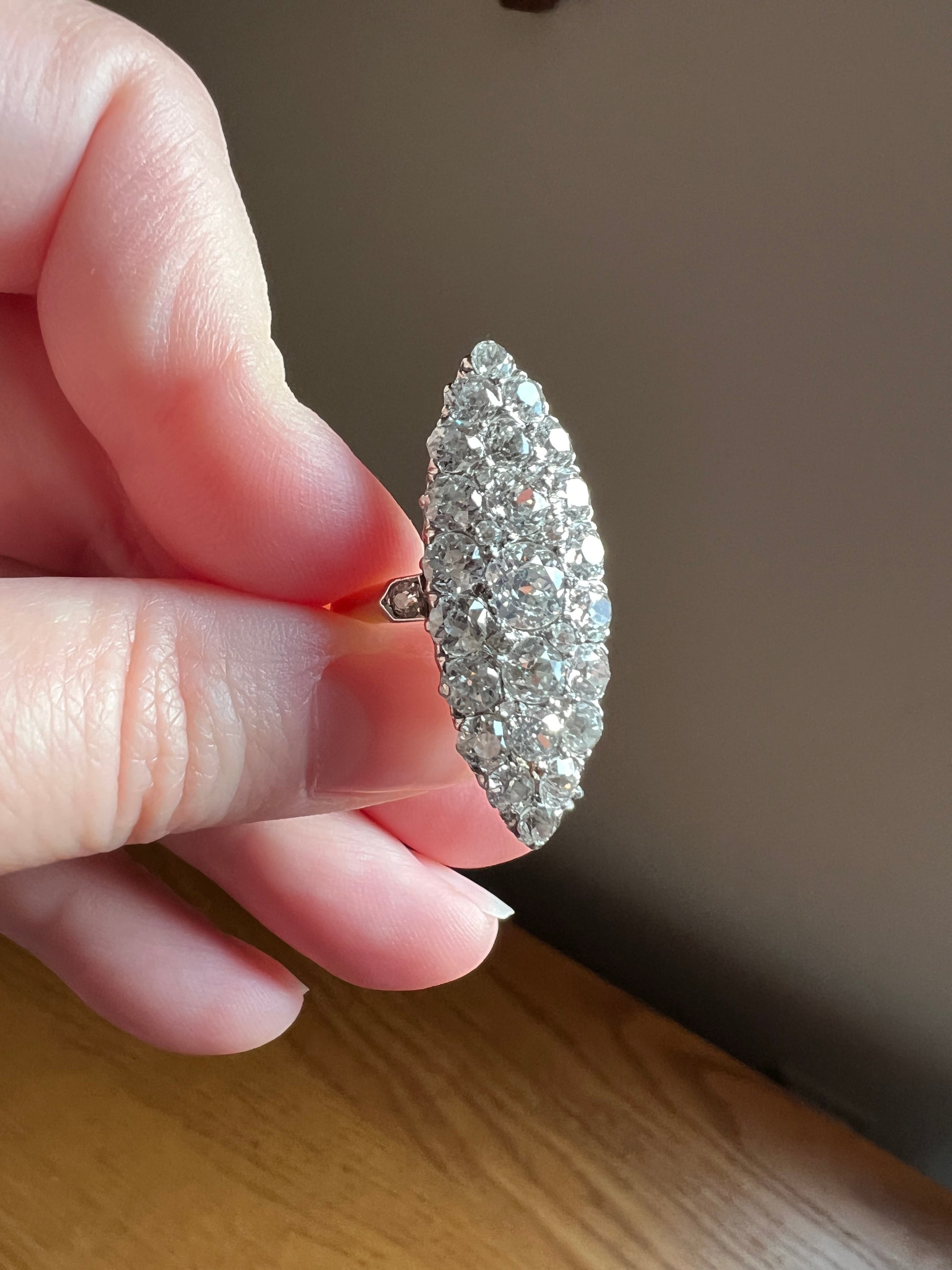 ANTIQUE 5.5 Carat 33 Old Mine Cut DIAMOND Navette XL Cluster Ring 18k Gold Platinum French Belle Epoque