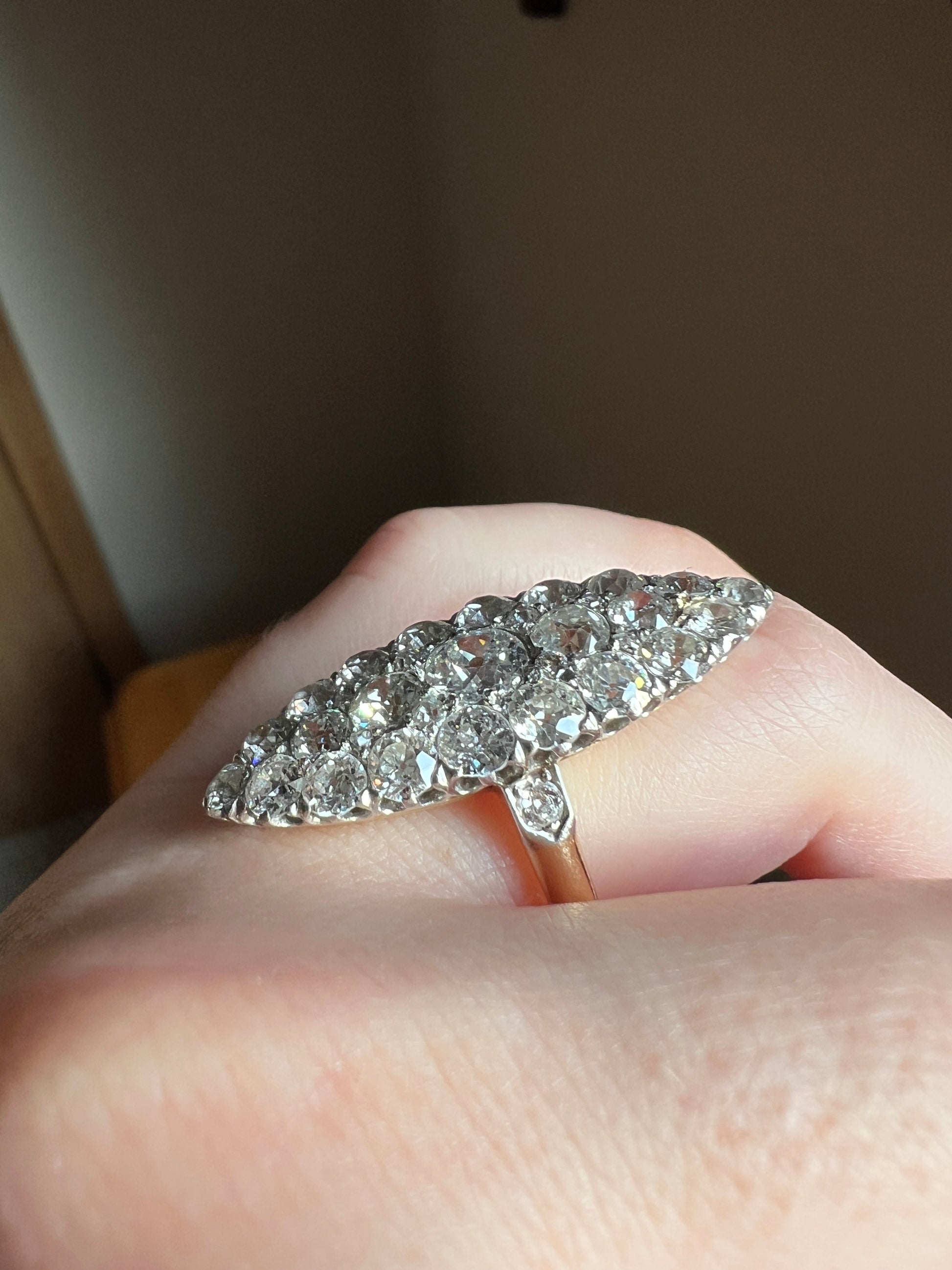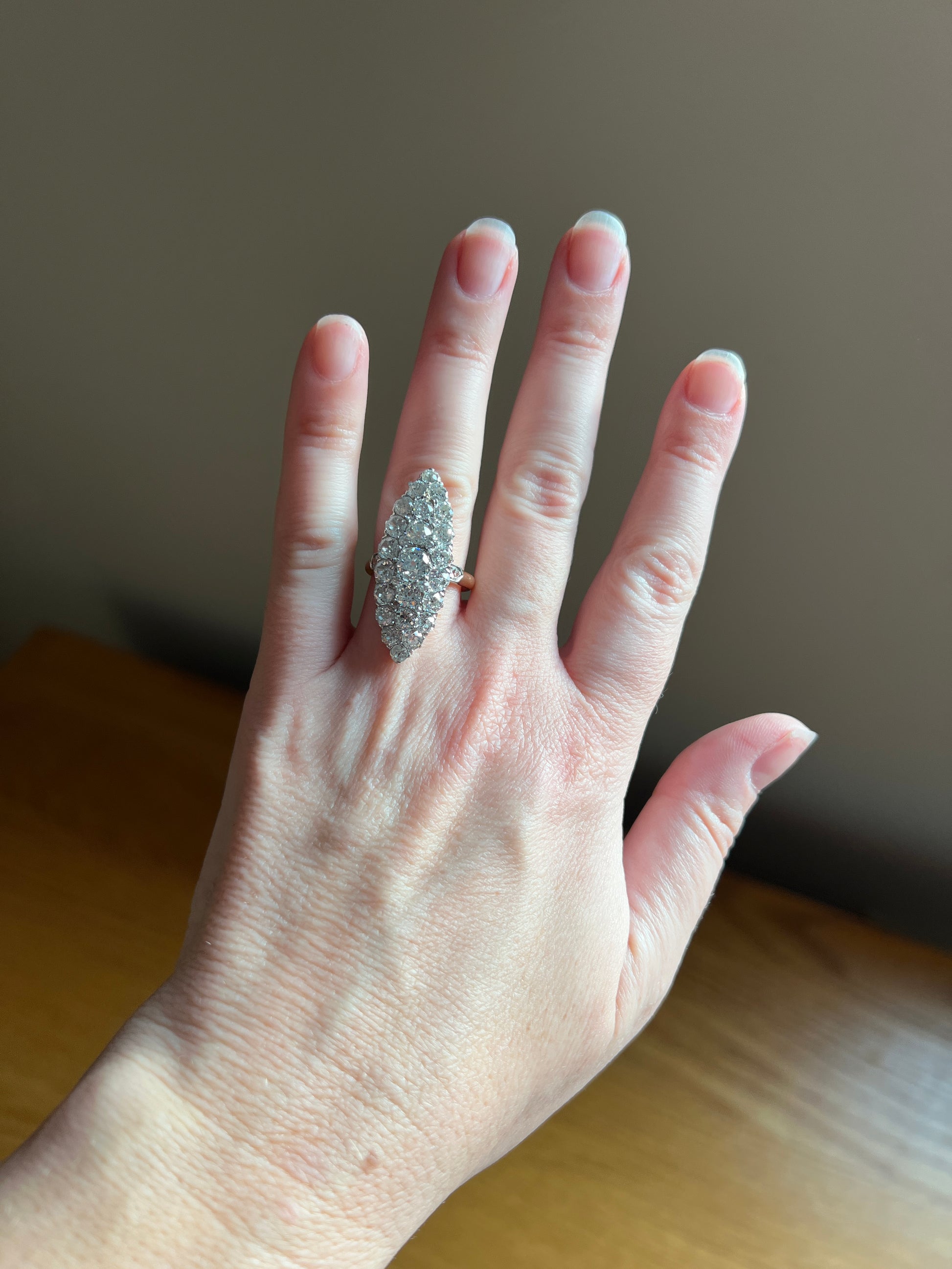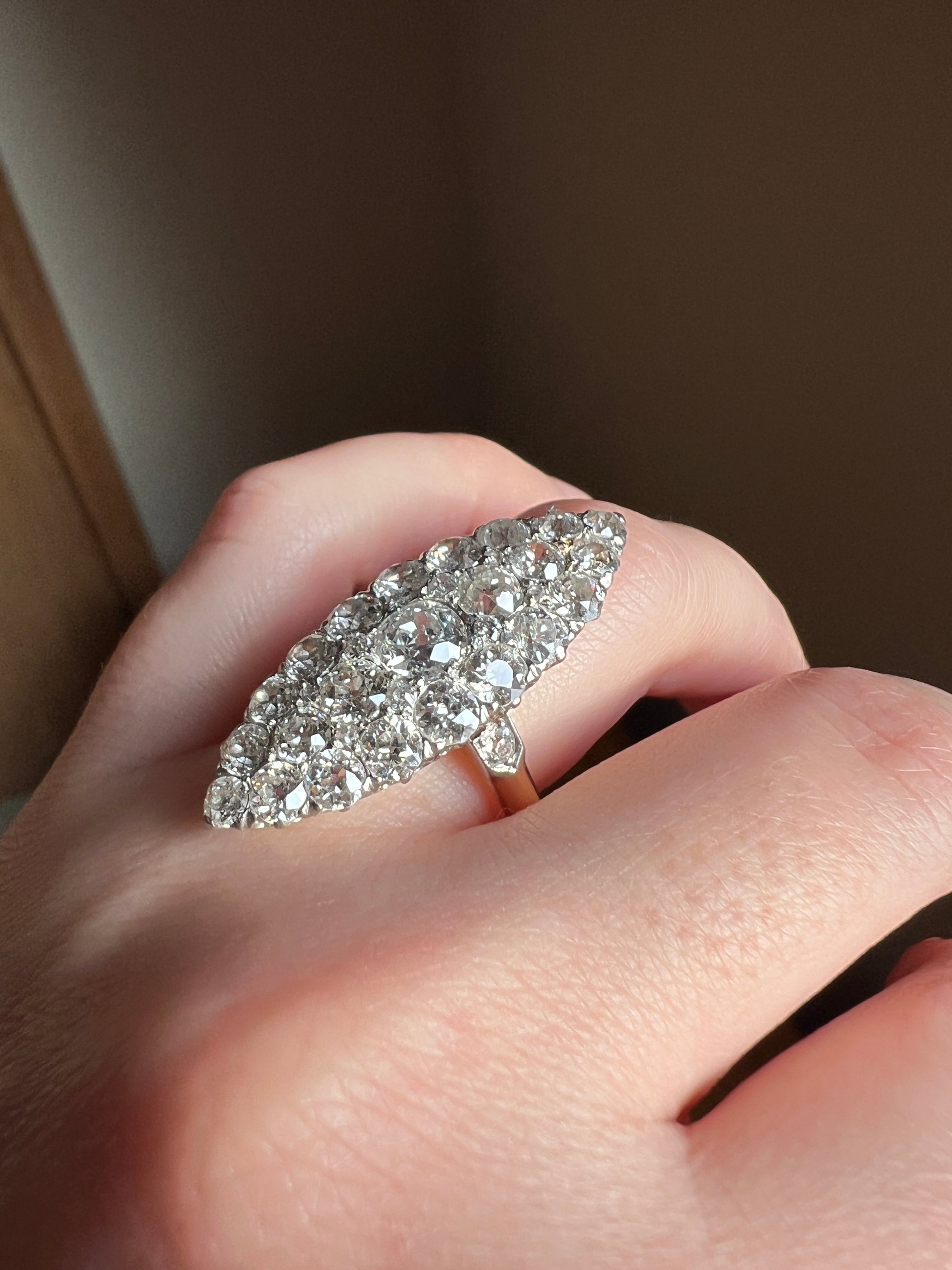 ANTIQUE 5.5 Carat 33 Old Mine Cut DIAMOND Navette XL Cluster Ring 18k Gold Platinum French Belle Epoque