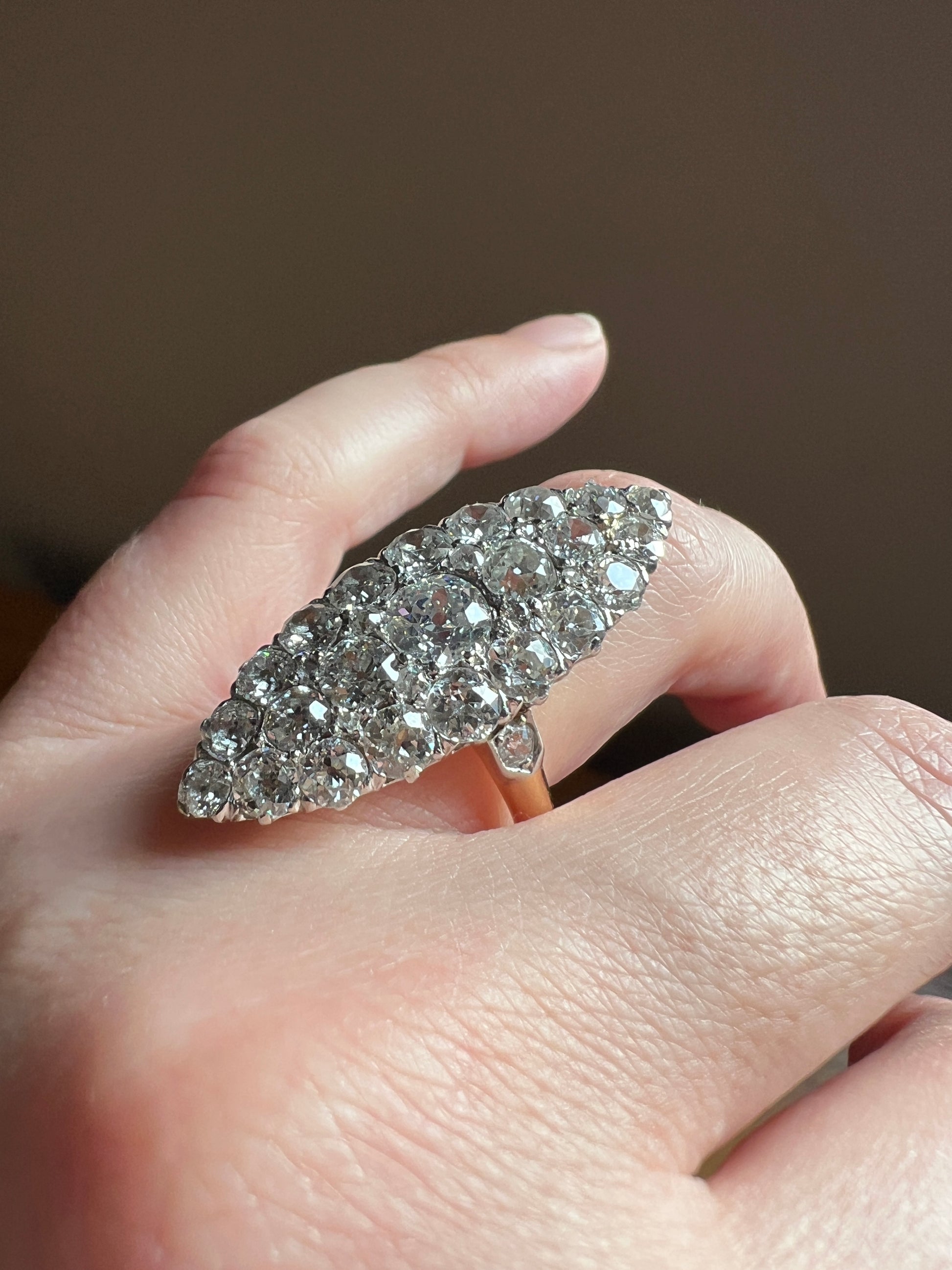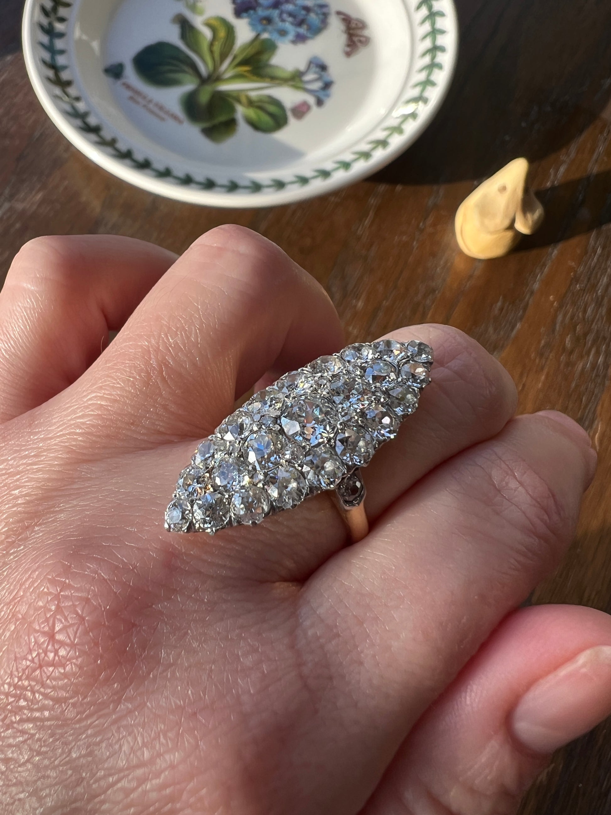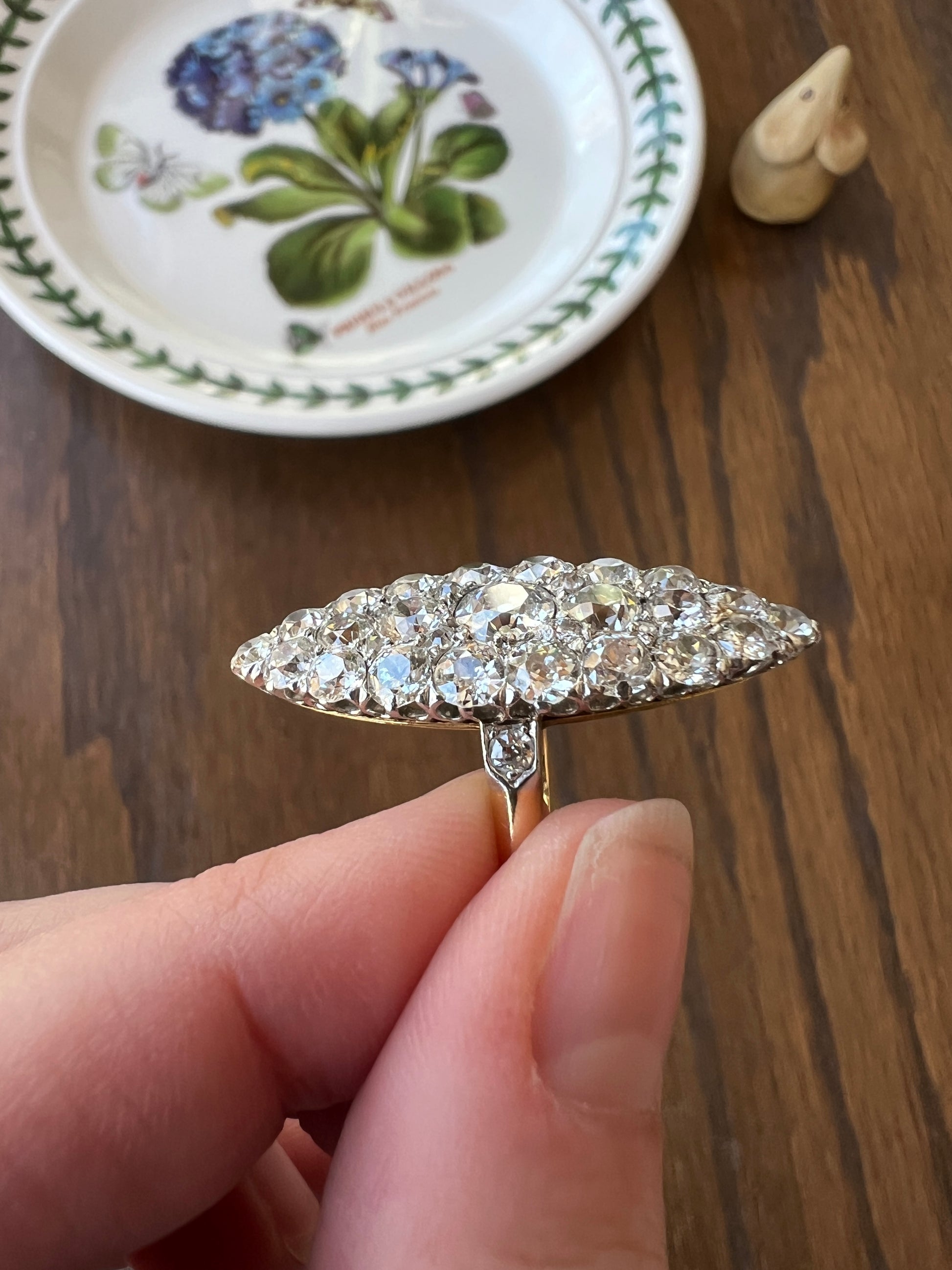 Impactful and imposing French antique navette ring - this is one of my largest to date with 23 old mine cuts Plus one more at each shoulder Plus eight more serving as diamond spacers to the gemset prongs for complete and total diamond encrustation. : )