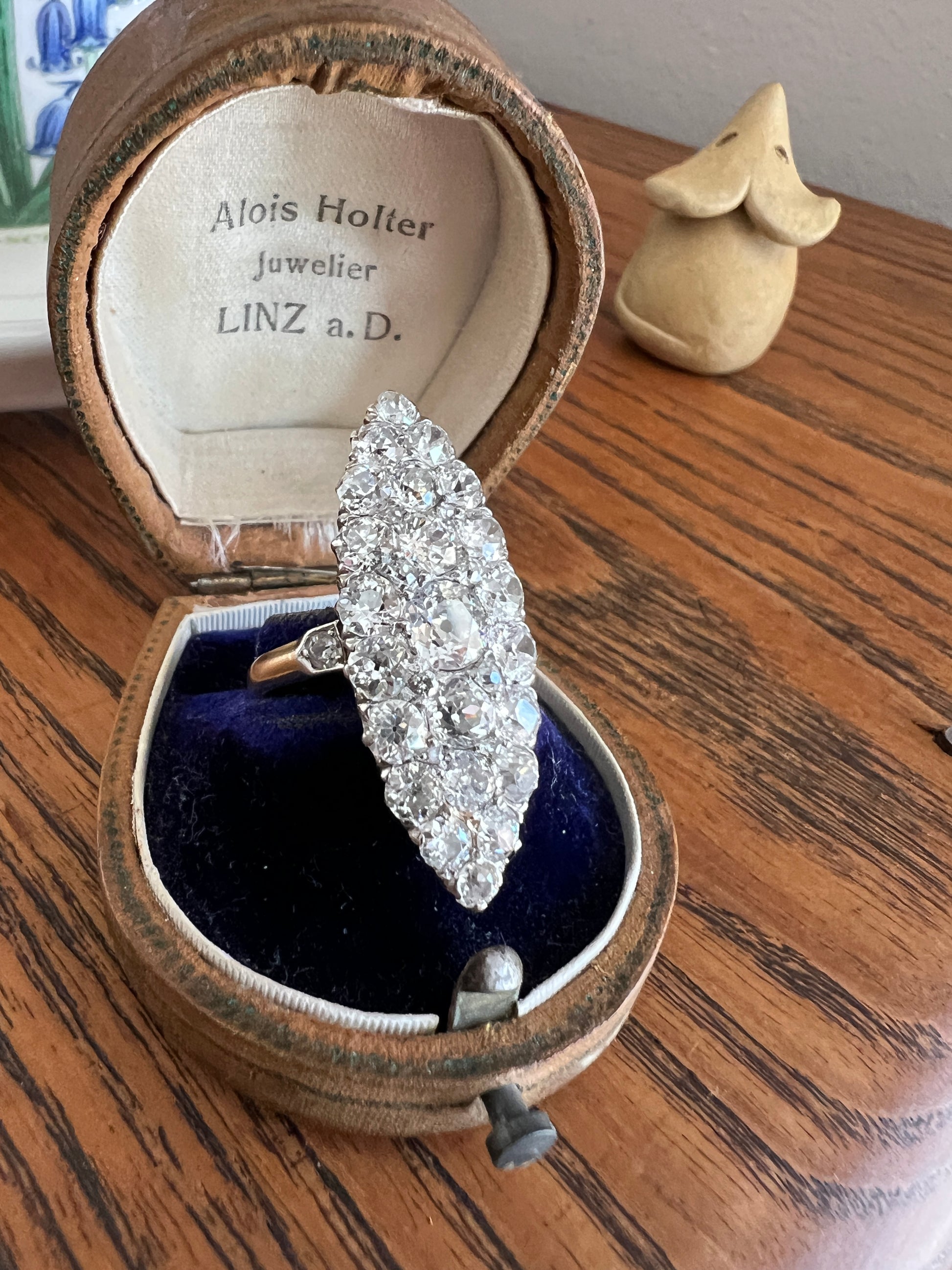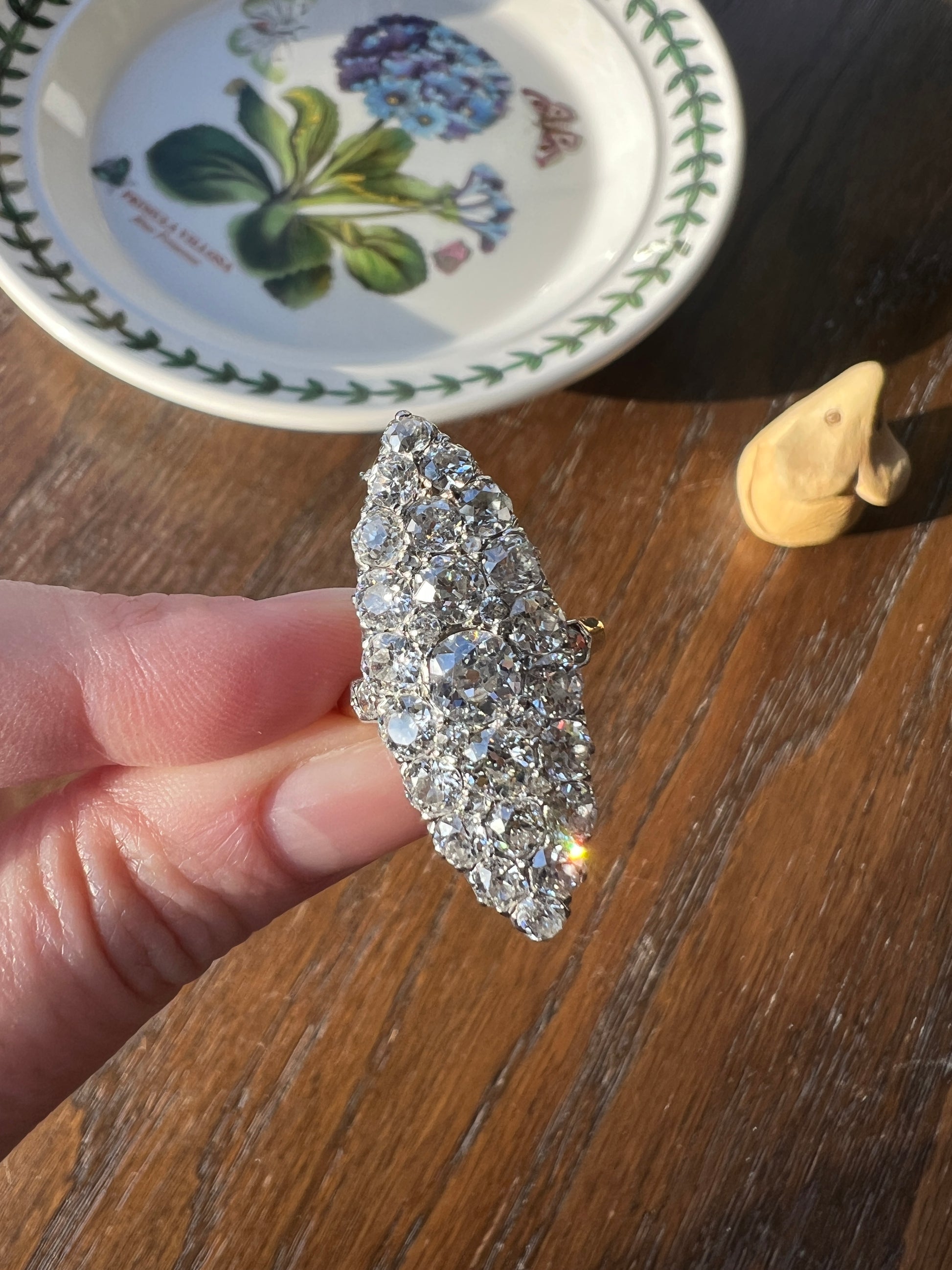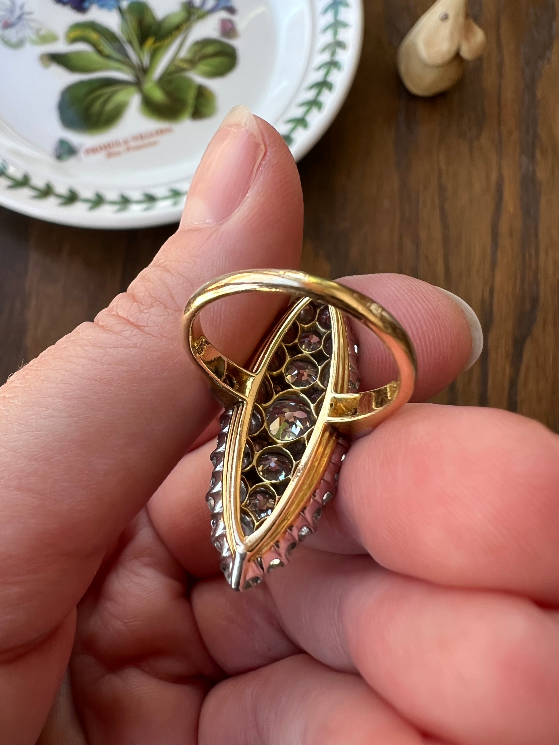 Impactful and imposing French antique navette ring - this is one of my largest to date with 23 old mine cuts Plus one more at each shoulder Plus eight more serving as diamond spacers to the gemset prongs for complete and total diamond encrustation. : )