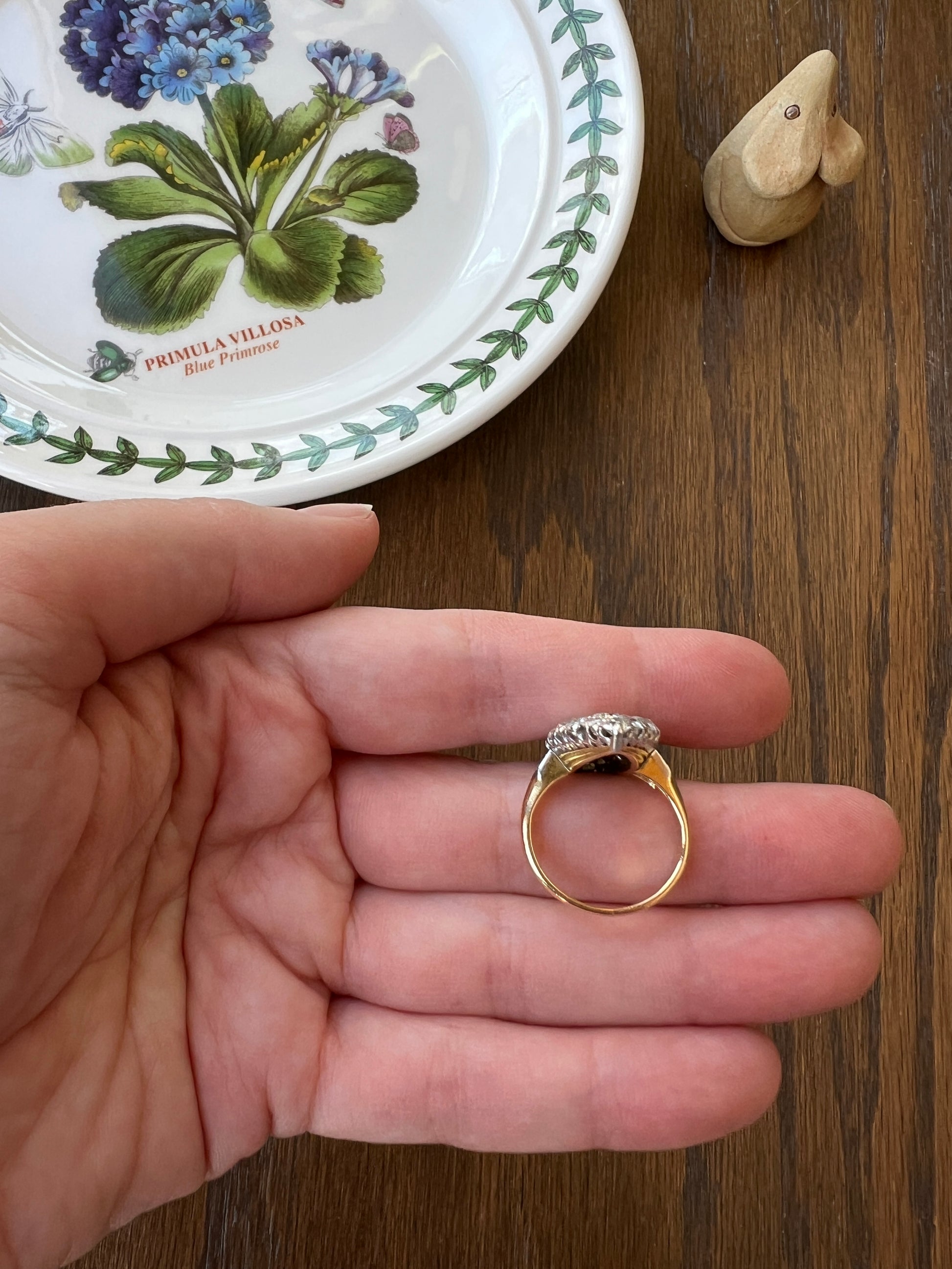 So we have 33 diamonds in all totaling over 5.5 carats total weight in diamonds. And when I say imposing, it has quite the finger coverage. The north south span is 34mm - so about 1 1/3 inch of wonderful, chunky antique sparkle.