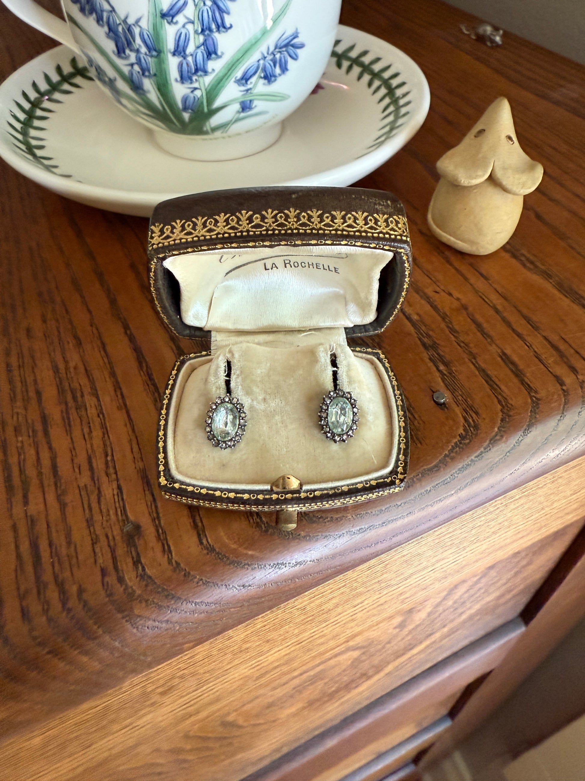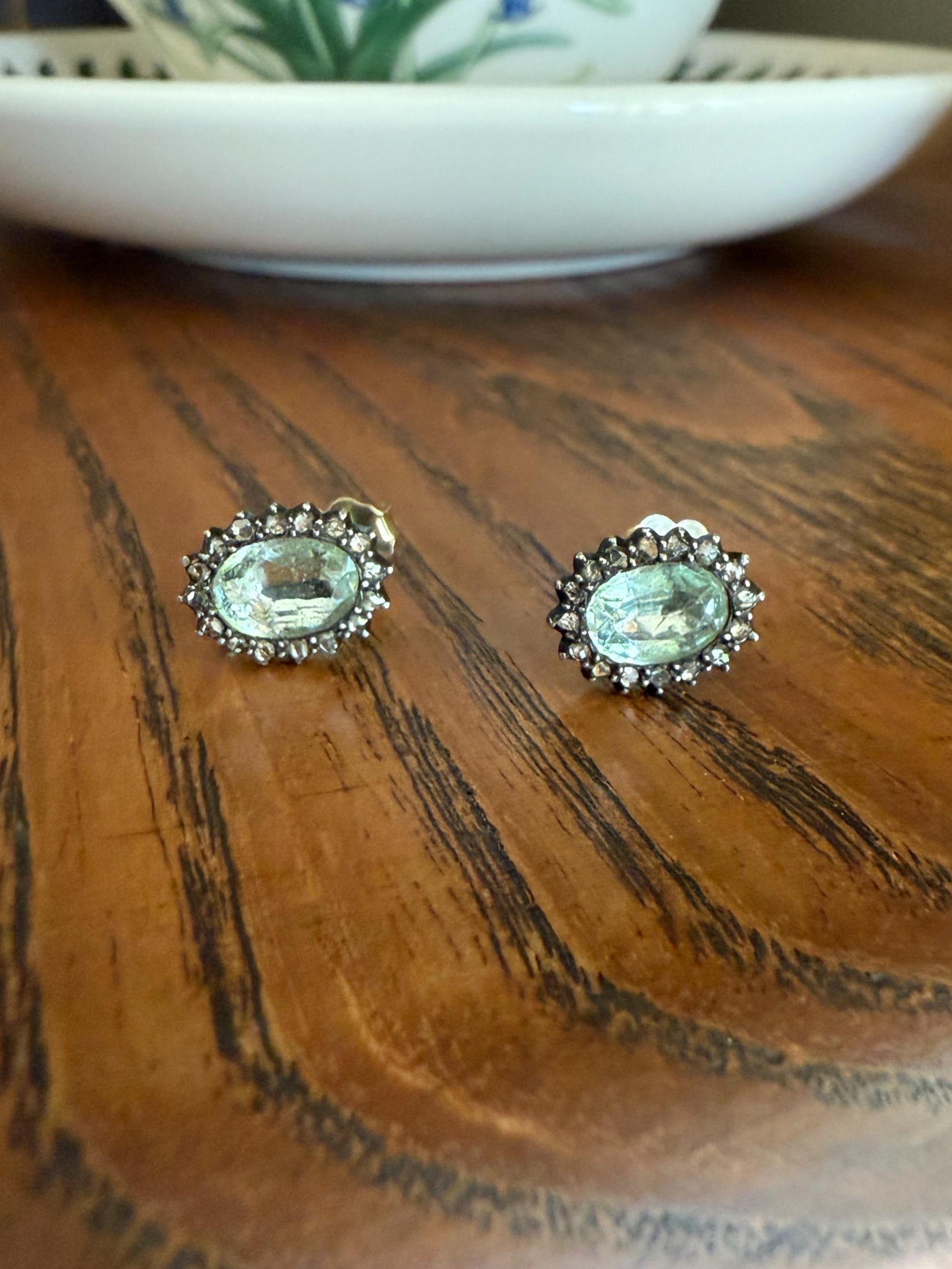 Antique Blue Green AQUAMARINE Rose Cut Diamond Halo STUD EARRINGS Georgian Victorian 18k 14k Gold