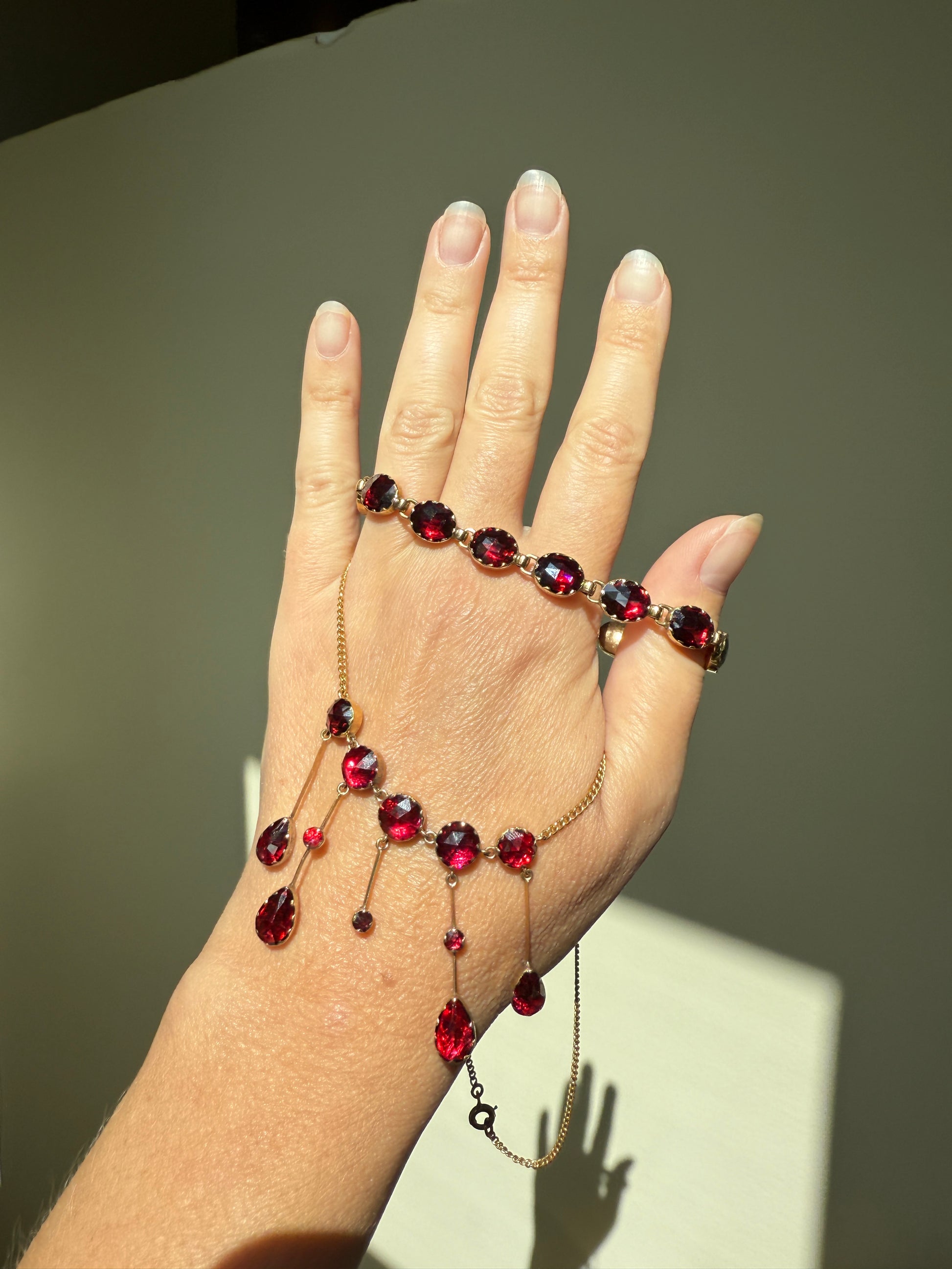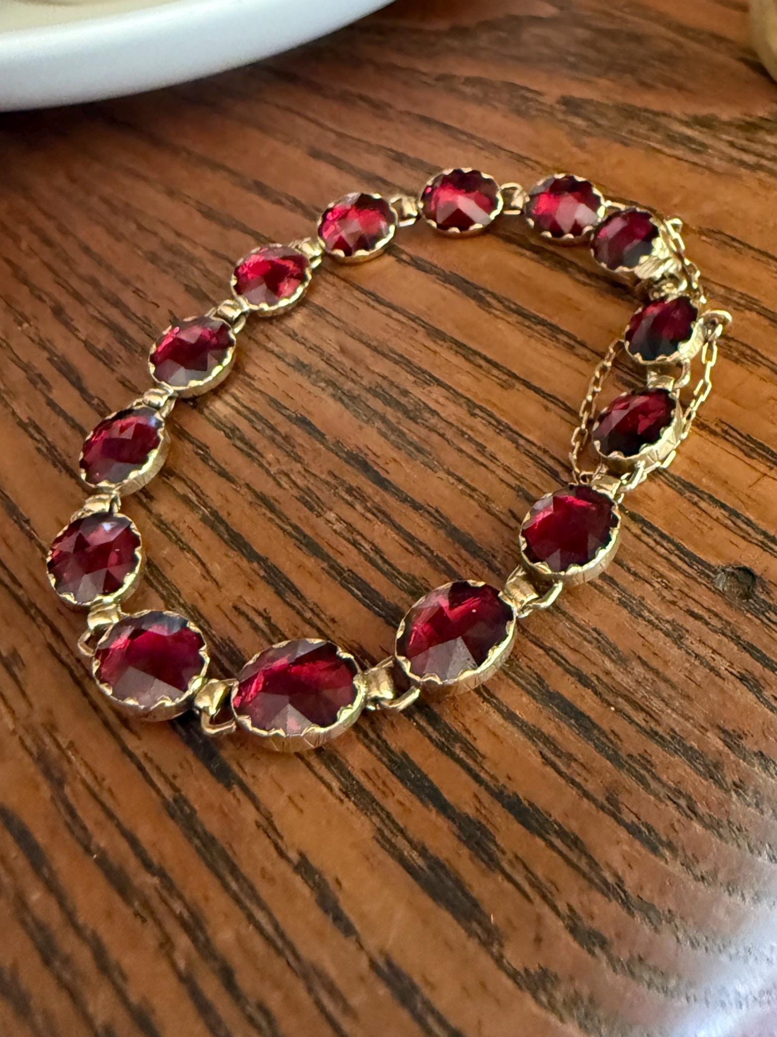 Antique French Perpignan GARNET Oval Riviere Eternity Tennis Bracelet 18k Gold Bezel Set Rose Cut Closed Back Almandine Glowing Raspberry