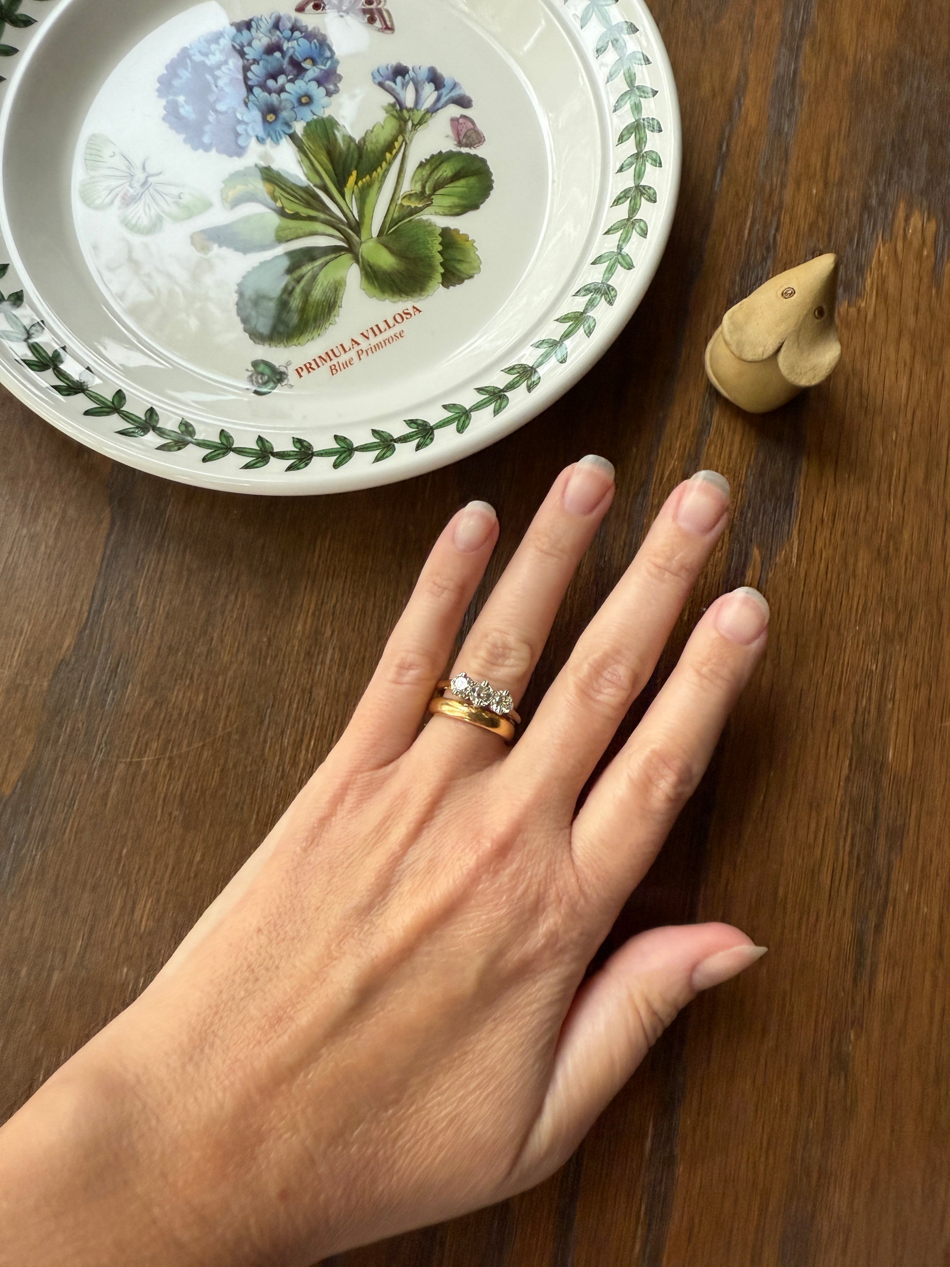 This versatile design can make a fun self gift, or is also seen with romantic connotations. The three stone design became popular in the antique period for use as an engagement ring and in the current period as an anniversary / right hand ring. The three stones can be thought to represent past, present and future or also friendship, love and fidelity as well as mother, father, child or even me, myself and I : ).