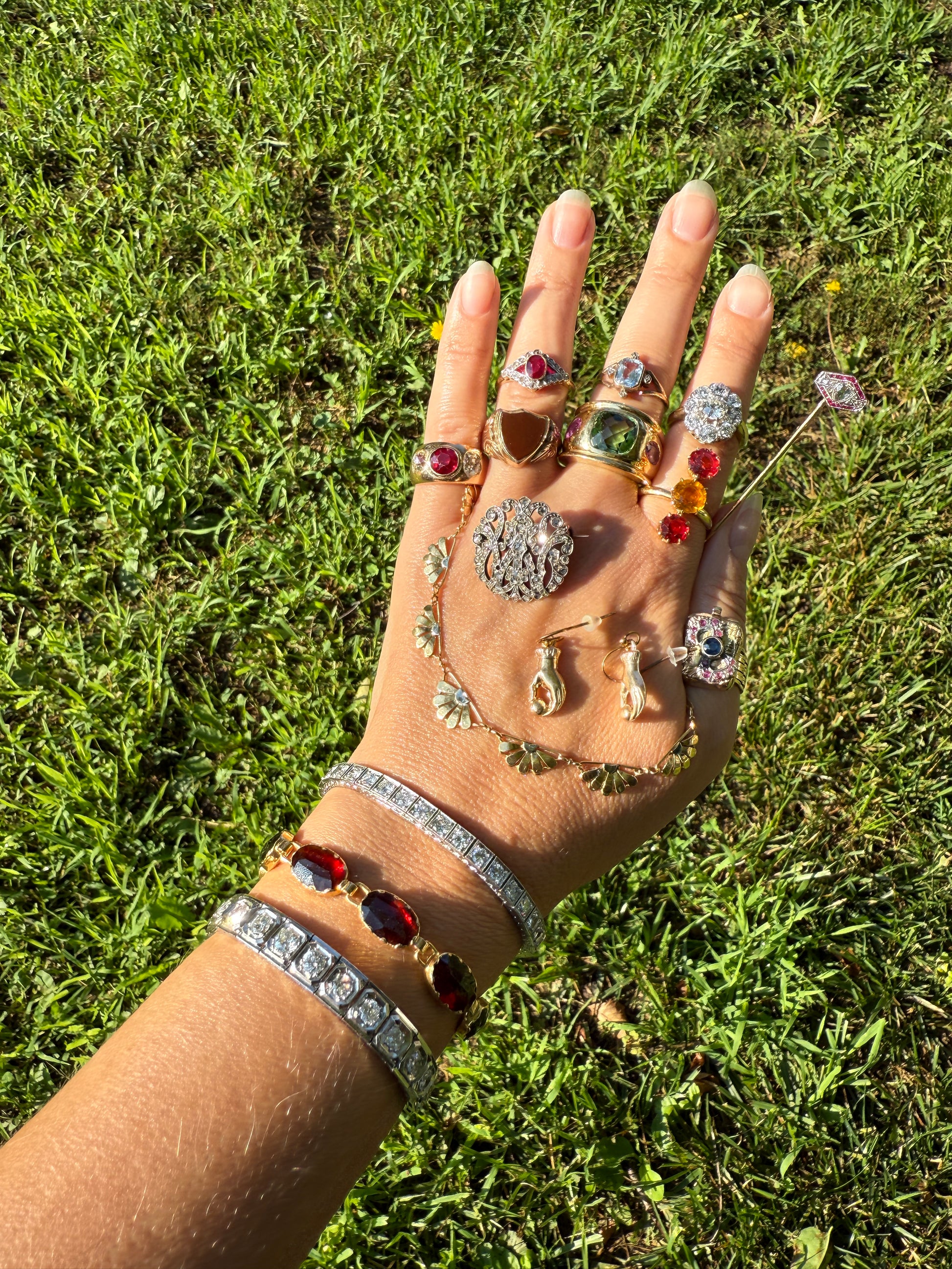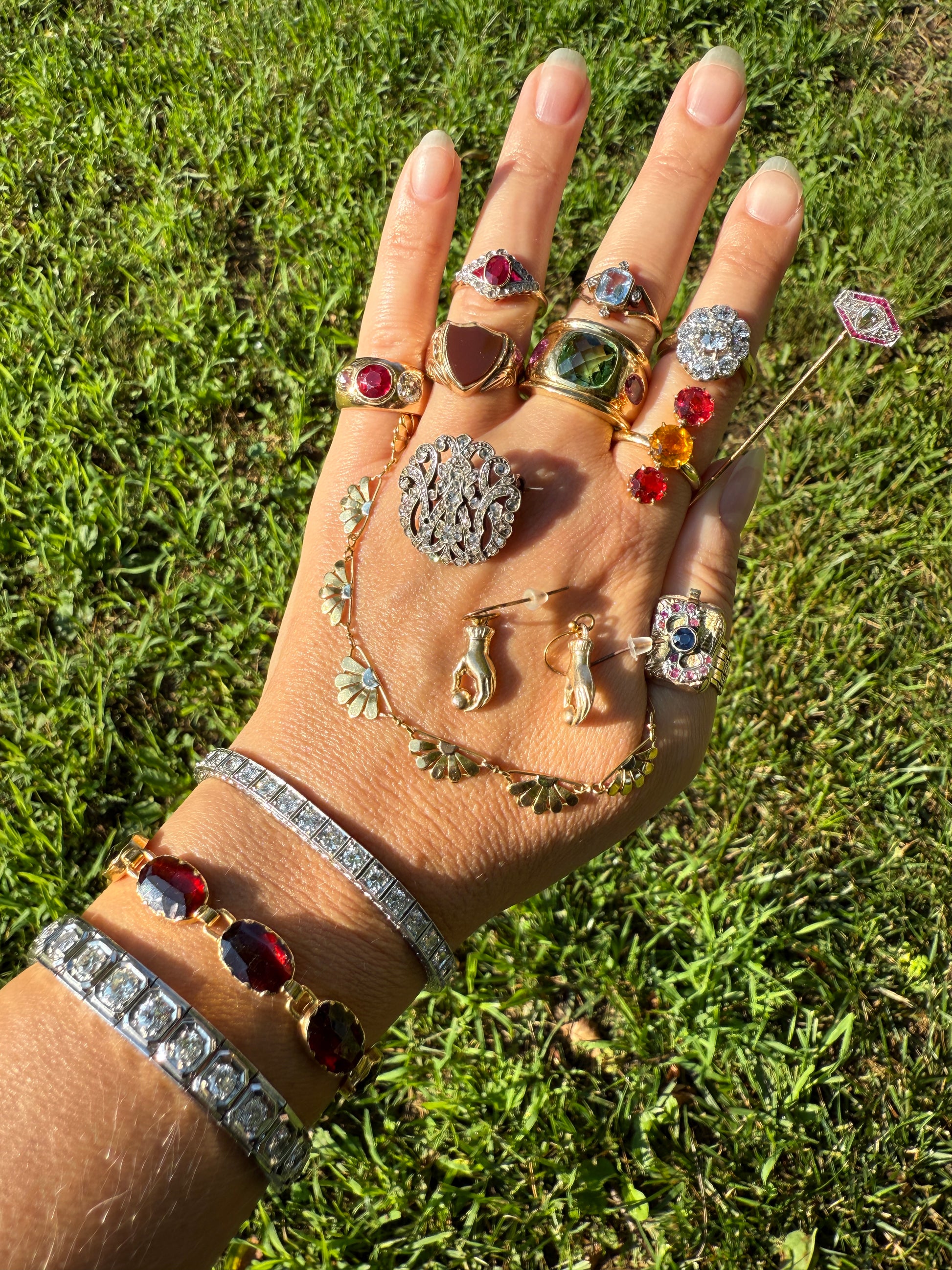 Gorgeous pop of color with glittery sparkle of the rose cuts. Sold to me as rubies but I am not seeing any inclusions so I wonder if they might be synthetic? I am selling them as such with no claims otherwise since I do not want to remove them and send them off. Synthetic rubies were super popular during this period, often times even more sought after than their natural counterparts.