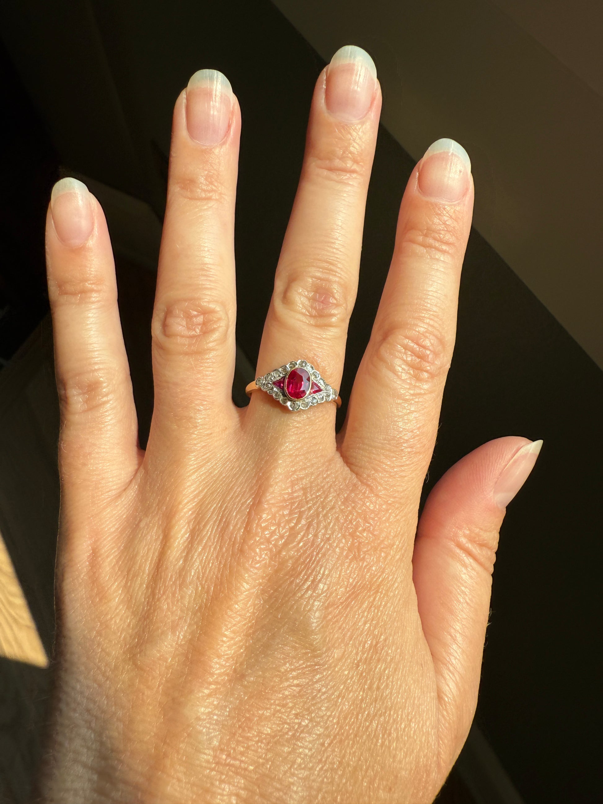 Antique Pink RUBY Rose Cut DIAMOND Garland Halo East West Ring French 18k Gold Stacker Belle Epoque Triangular Trillion