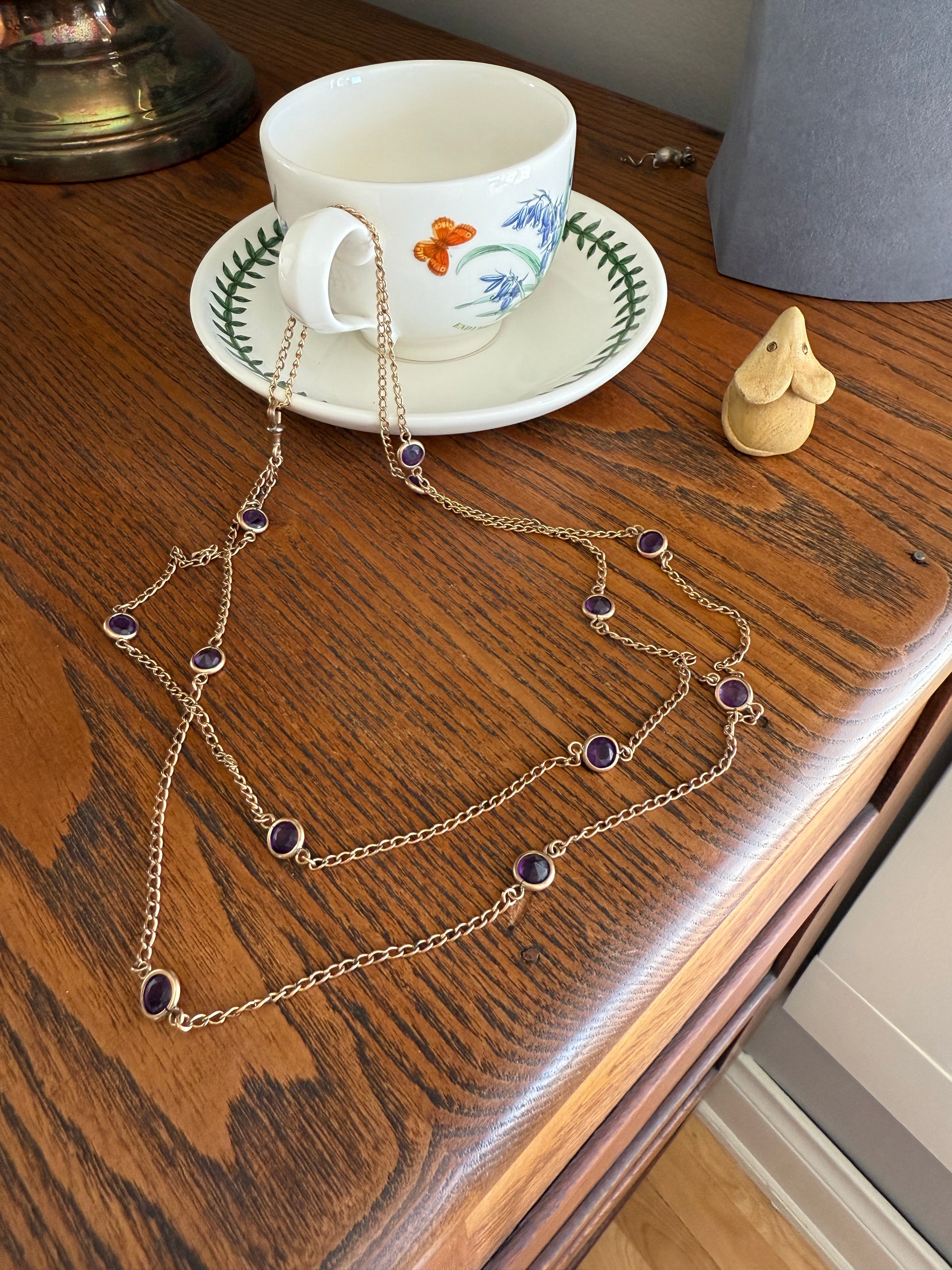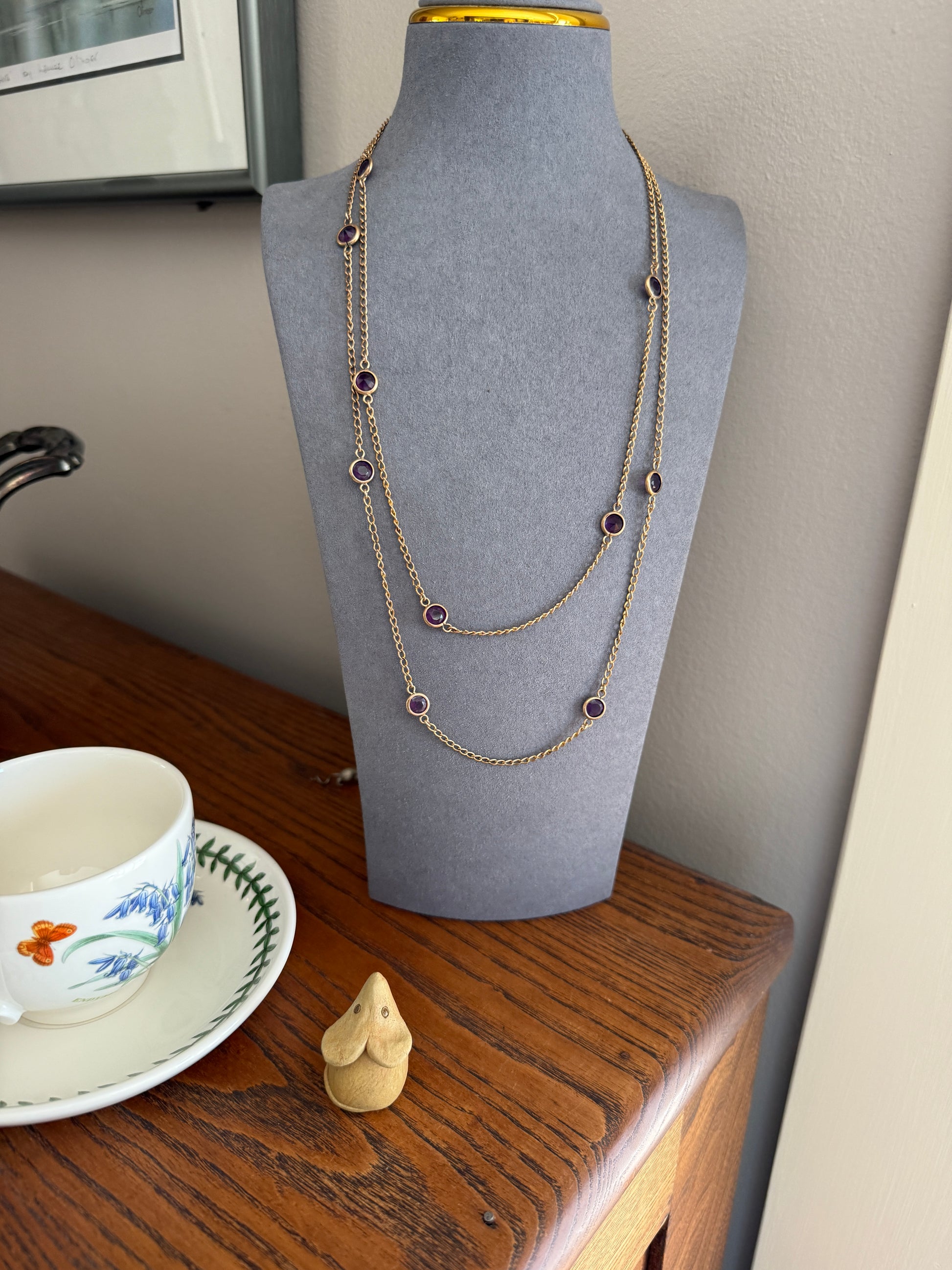 Beautiful glowing antique gold filled Victorian era long guard chain, originally likely held a watch or chatelaine item but makes a beautiful and unique layering chain. It has a rosy patina with 12 bezel set purple paste / faux amethyst stones for color.
