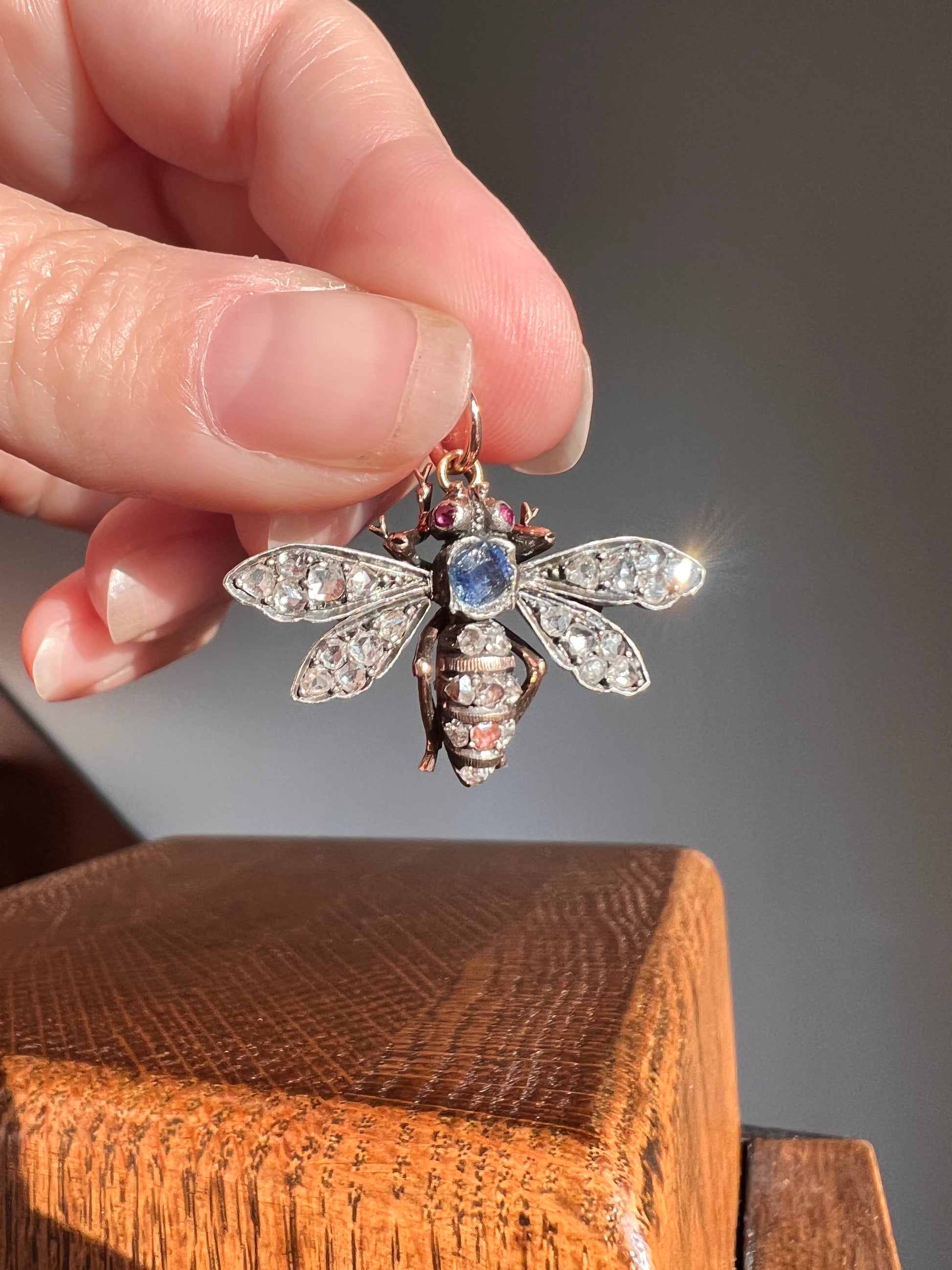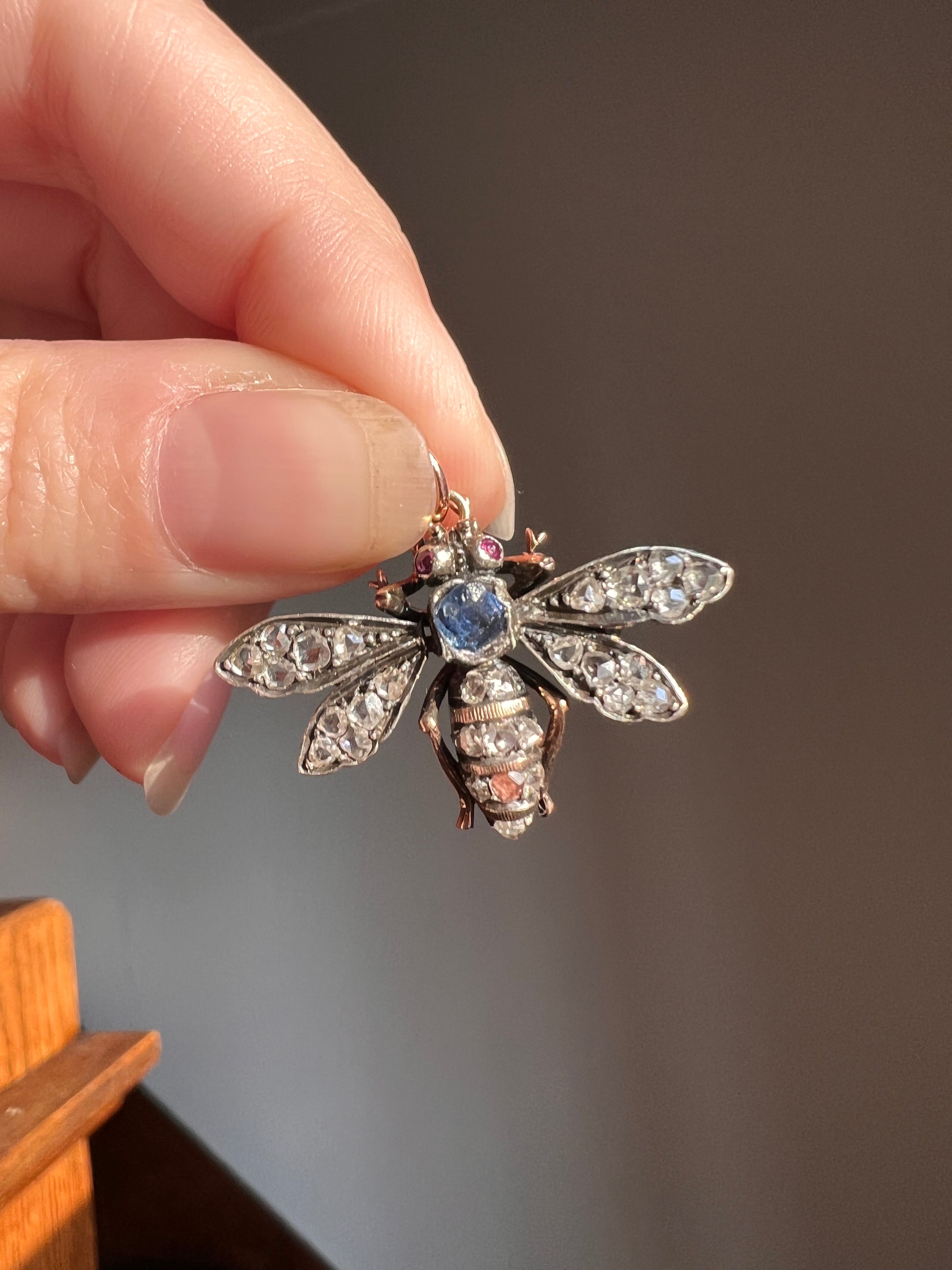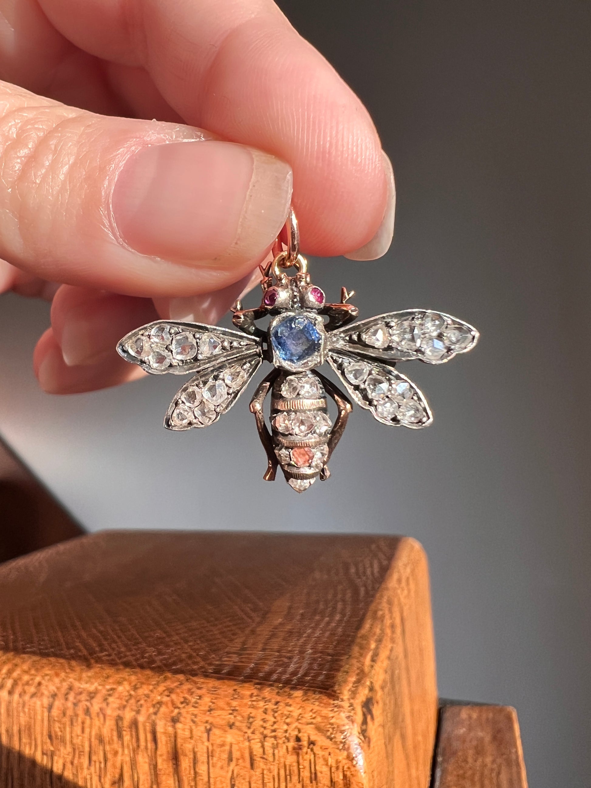 BUG Fly BEE French Antique Victorian Figural Pendant 1 Carat Rose Cut DIAMOND Ruby Sapphire 18k Gold Silver Figural