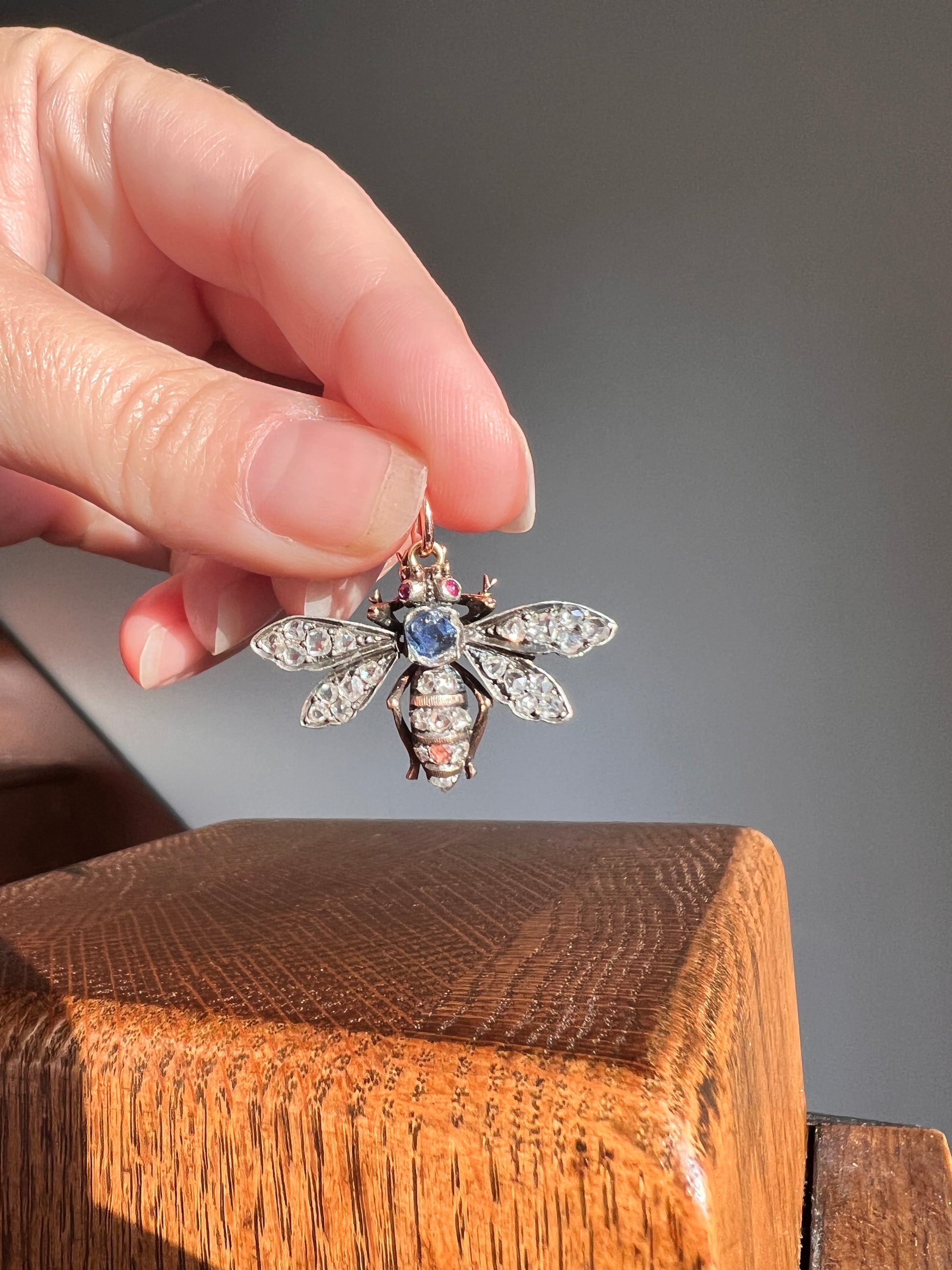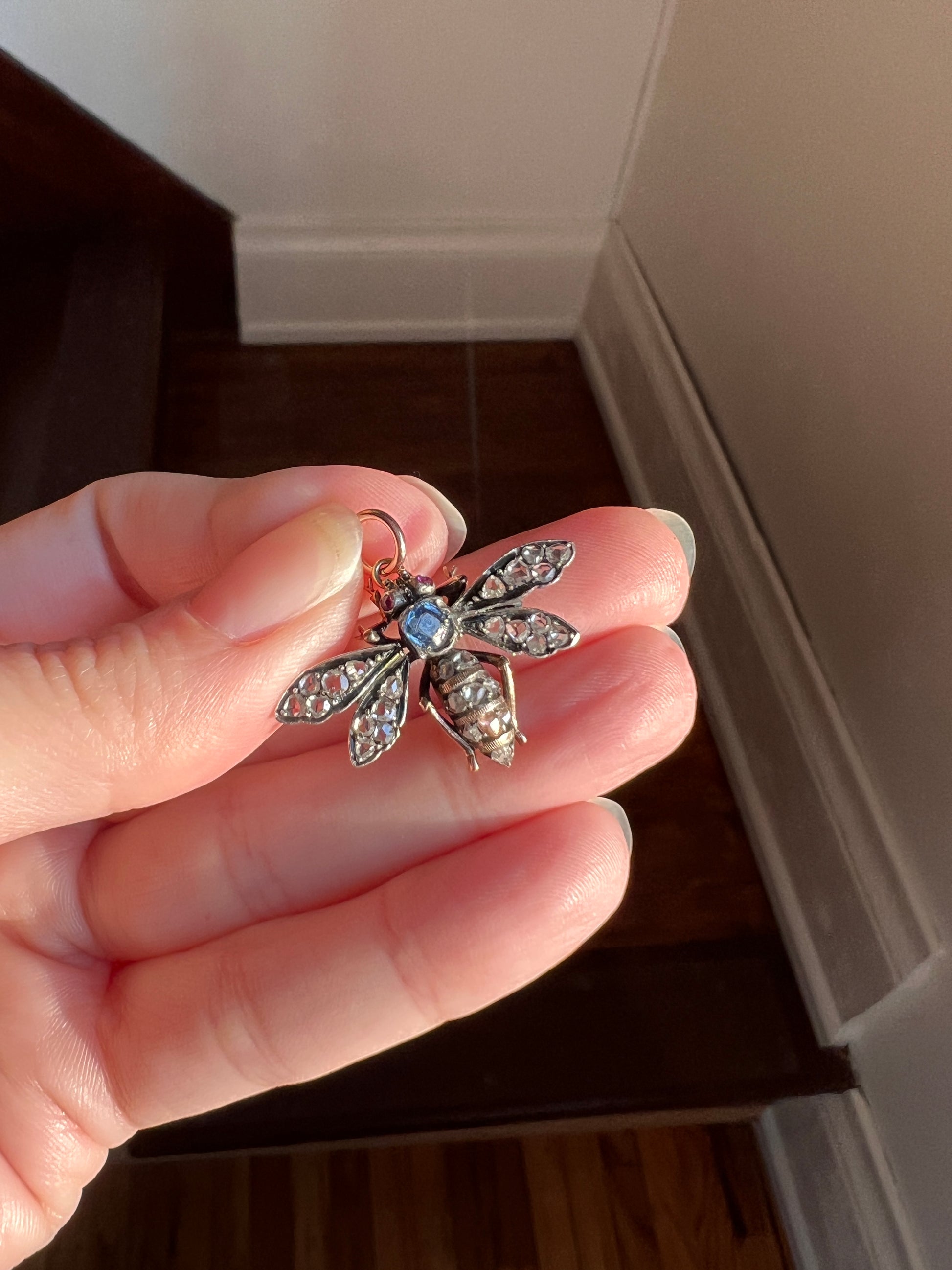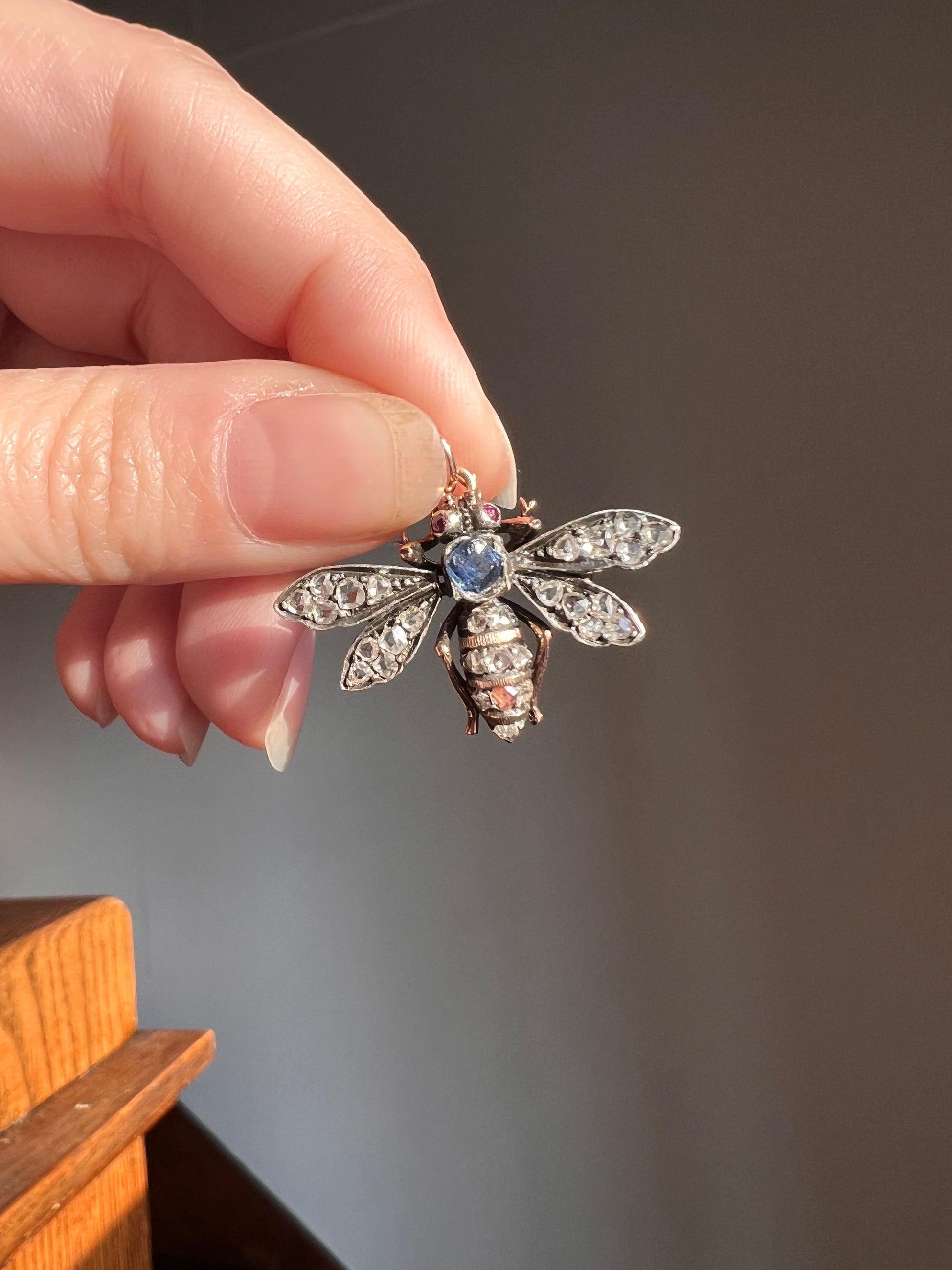 BUG Fly BEE French Antique Victorian Figural Pendant 1 Carat Rose Cut DIAMOND Ruby Sapphire 18k Gold Silver Figural