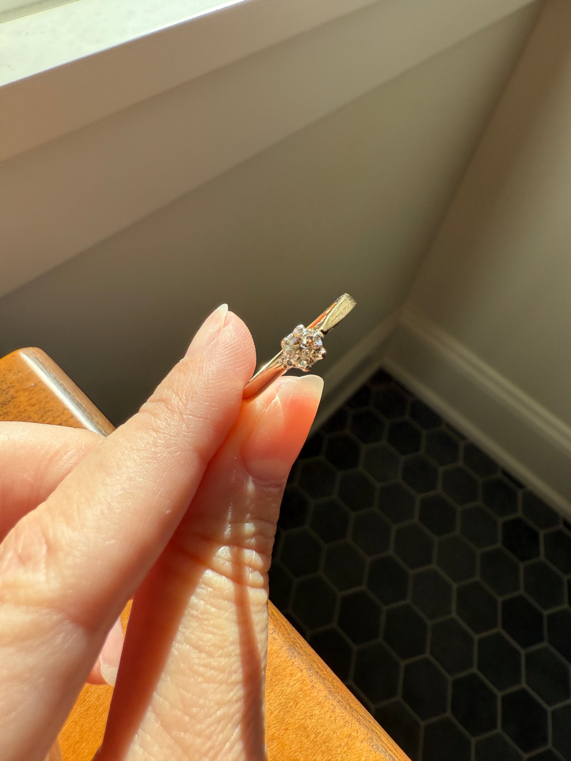 The setting has some wear with all the prongs showing wear and two that are worn quite far back but the stone is still held in place and does not move. This would be something to keep an eye on over time and is expected with age. Most of my buyers prefer original condition so if desired for daily wear some slight reinforcement may be needed.