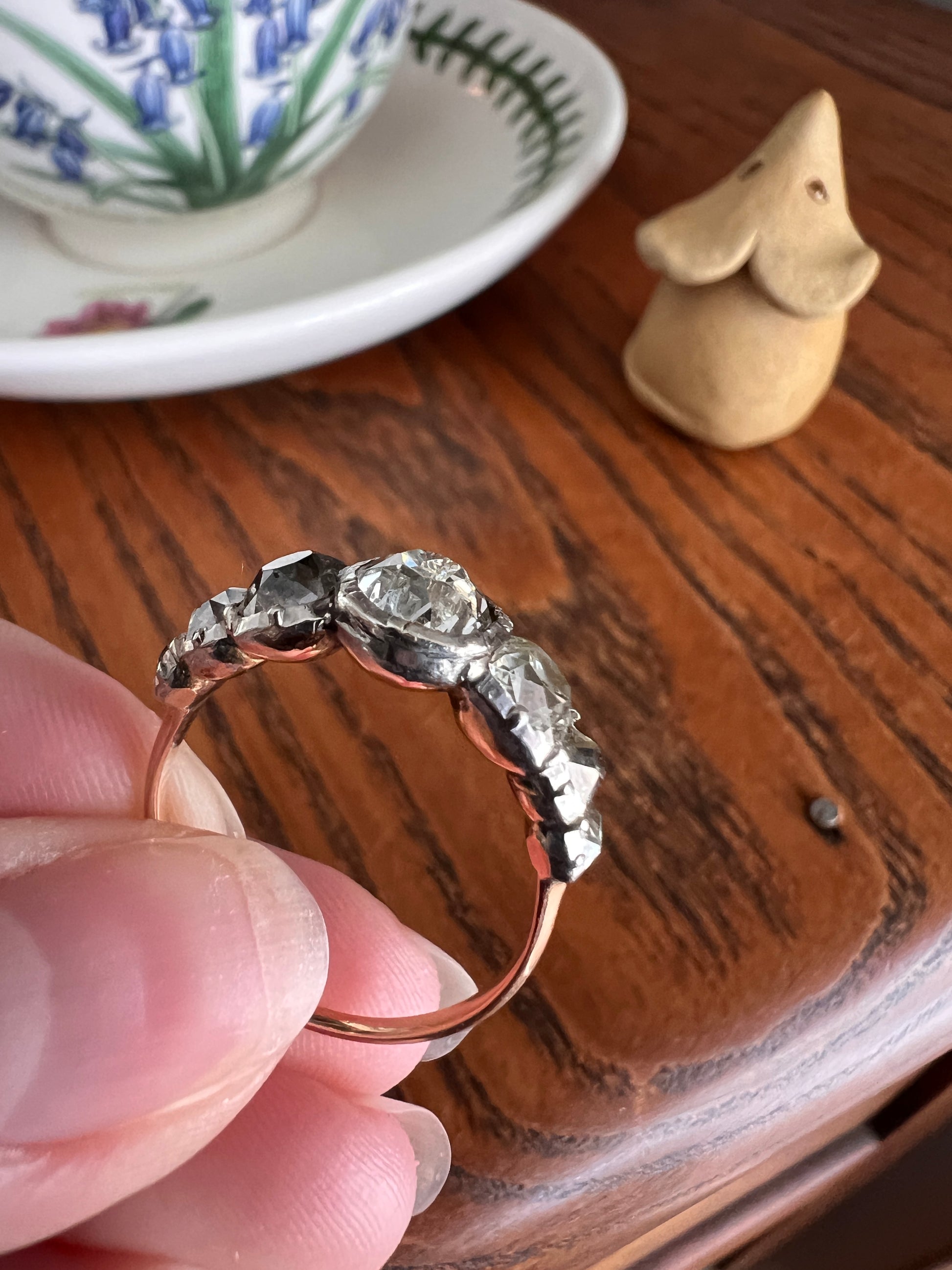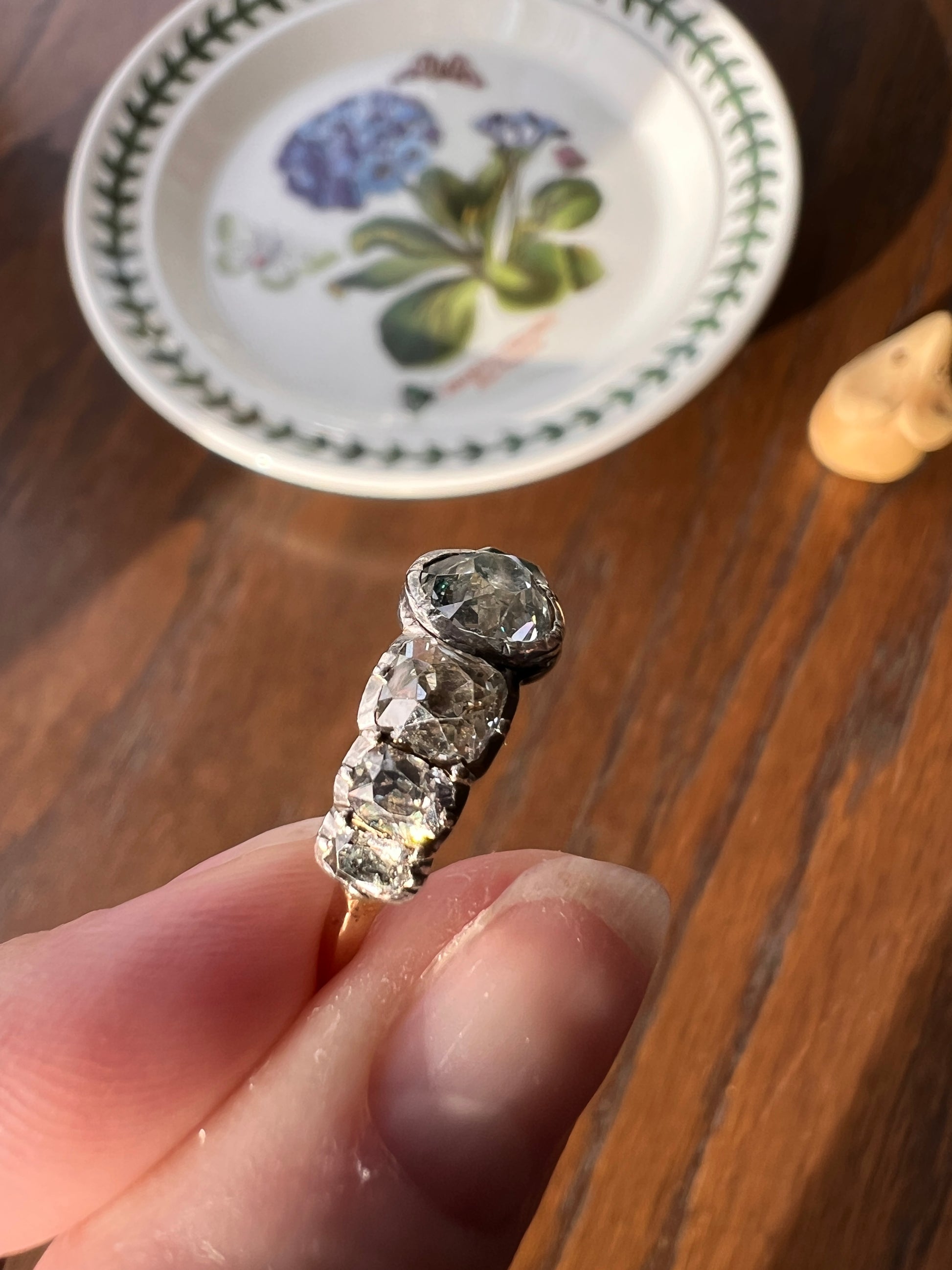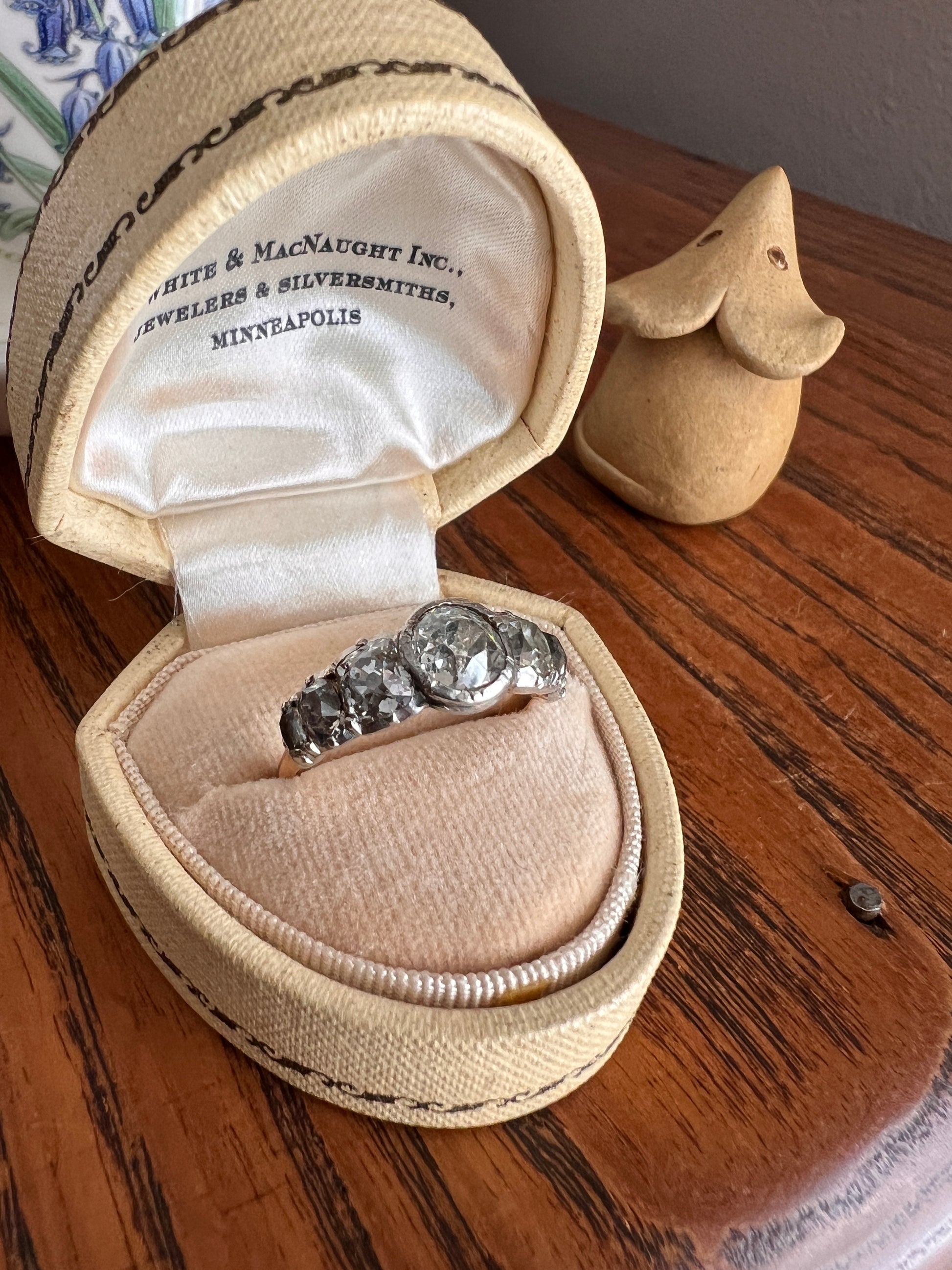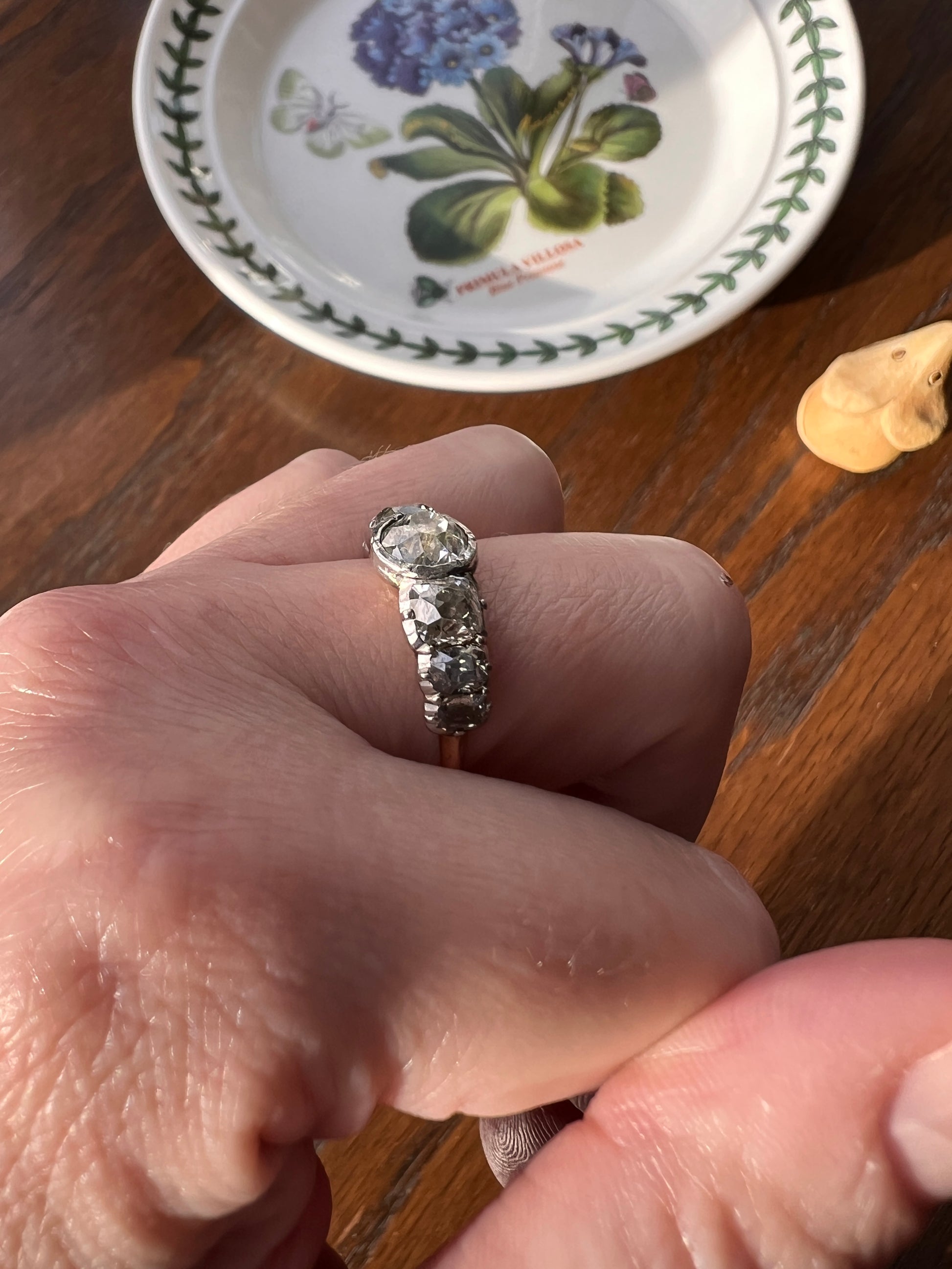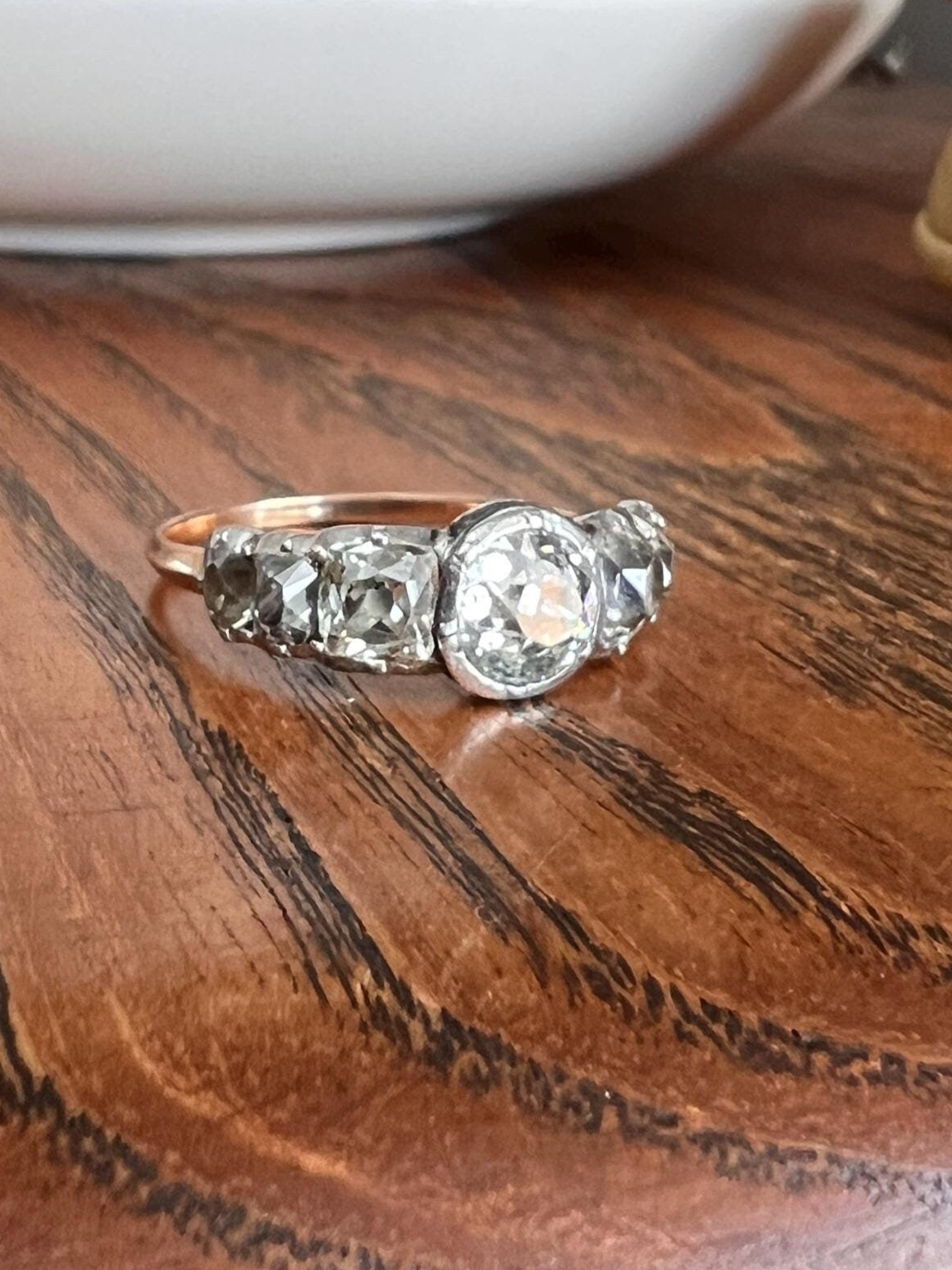 All my pieces are pre-owned and in estate condition. Typical antique diamonds with their one of a kind eccentricities. The end diamonds read warm to gray from age and deterioration to the foil and they all have varying slightly warm hues, having been cut from mines in the period that produced warmer rough stones. But I will also say that some of what you see is from the high crowns and the way they reflect the light. Also typical for antique stones, hand cut in much more limited supply compared to the millions of carats of machine cut diamonds produced each year now, they have some natural inclusions. The two squarish stones each have carbon spots and one of the smaller elongated stones has a carbon silk inclusion carrying up to the surface leaving a tiny crease. The center stone also has a few flecks. One of the smallest stones has a nibble to the crown facet. They do not appear frosty or dingy overall. These extra chunky cuts reflect the light like no other in their perfectly imperfect and charming antique way.