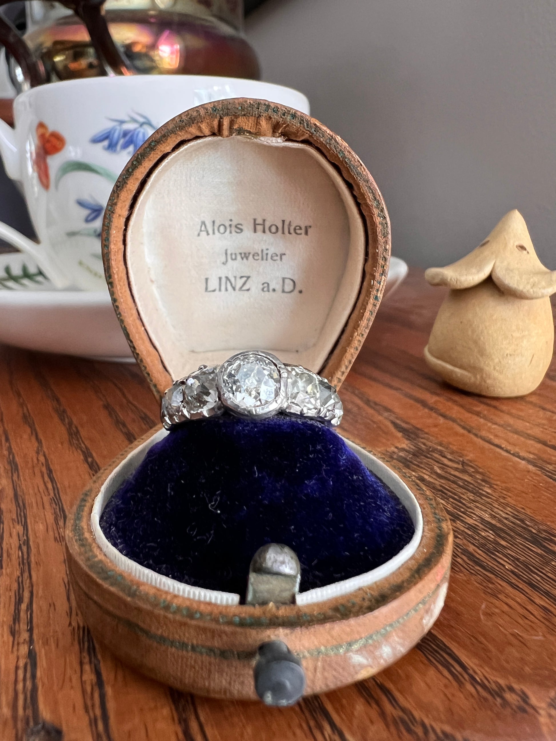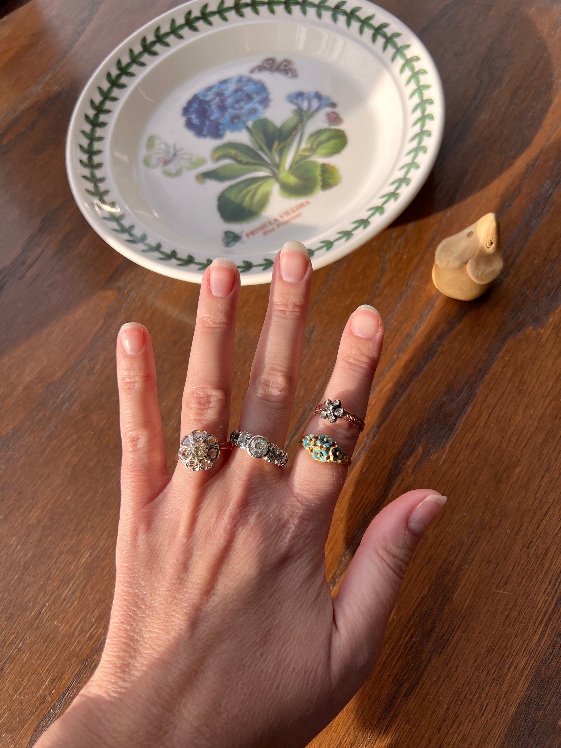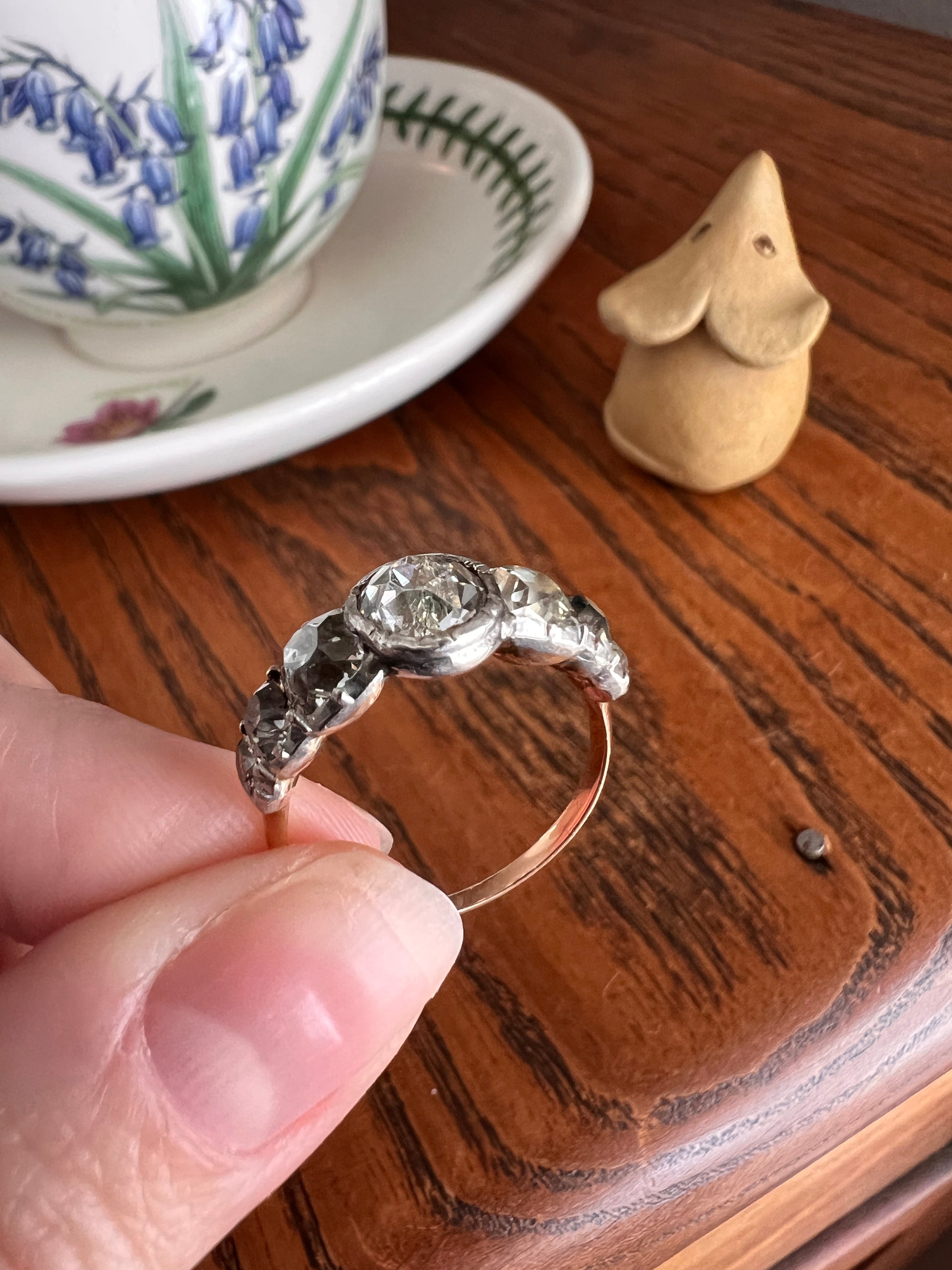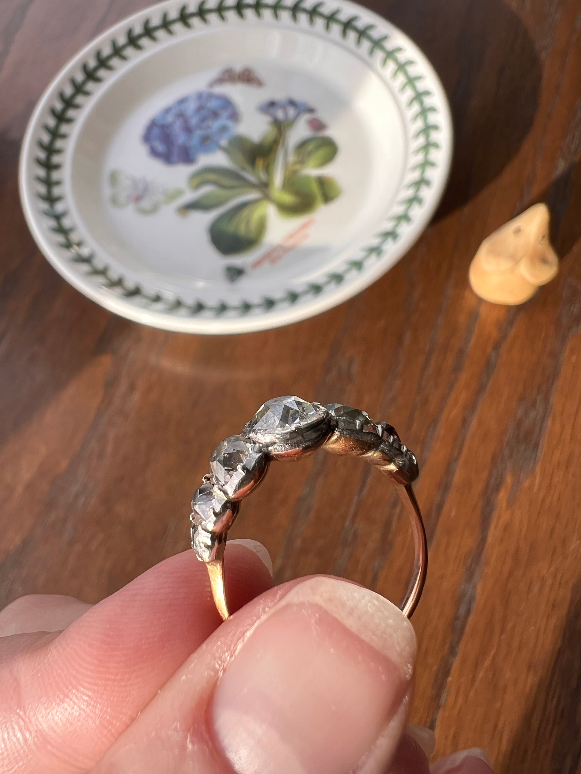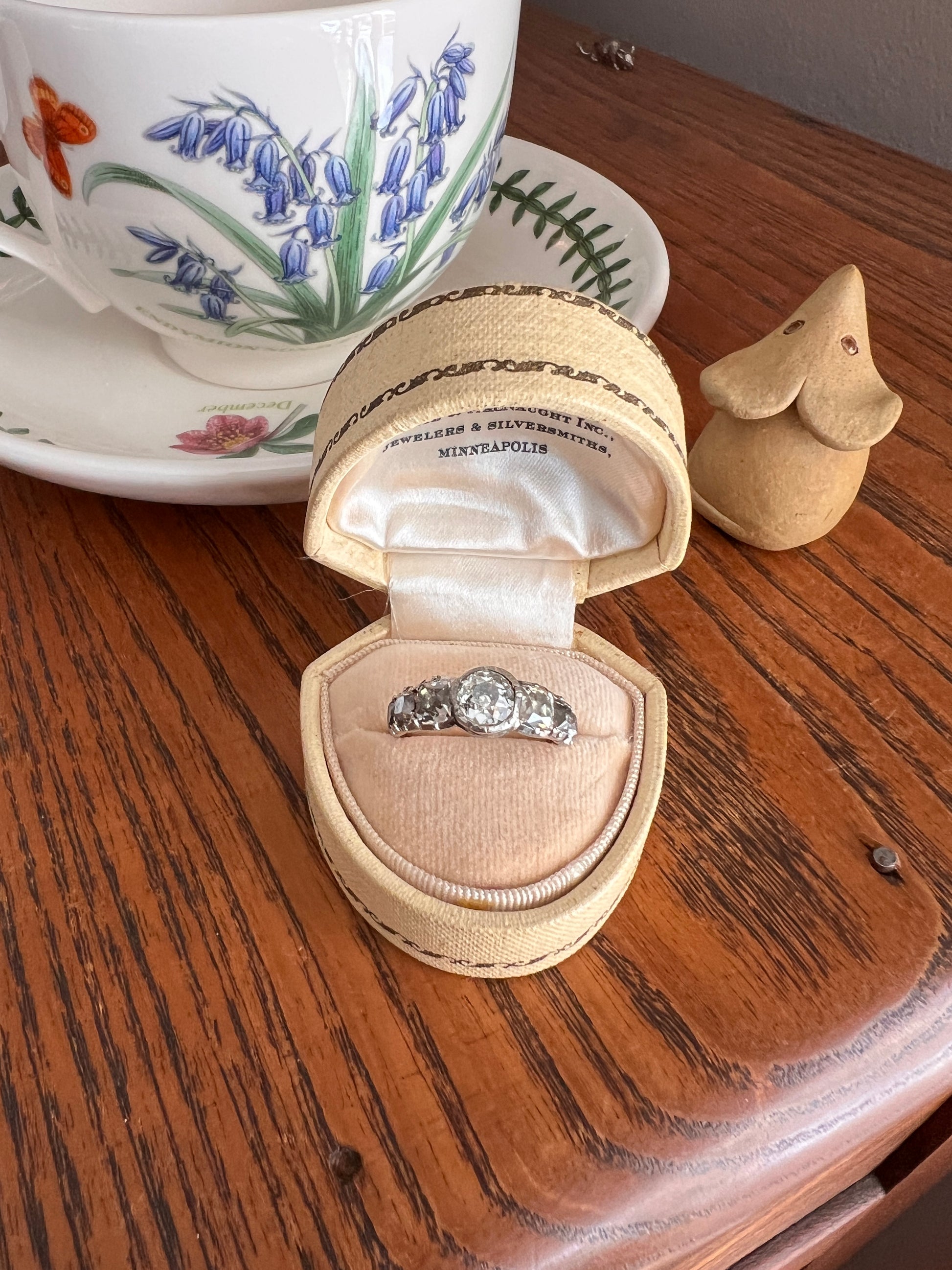 All my pieces are pre-owned and in estate condition. Typical antique diamonds with their one of a kind eccentricities. The end diamonds read warm to gray from age and deterioration to the foil and they all have varying slightly warm hues, having been cut from mines in the period that produced warmer rough stones. But I will also say that some of what you see is from the high crowns and the way they reflect the light. Also typical for antique stones, hand cut in much more limited supply compared to the millions of carats of machine cut diamonds produced each year now, they have some natural inclusions. The two squarish stones each have carbon spots and one of the smaller elongated stones has a carbon silk inclusion carrying up to the surface leaving a tiny crease. The center stone also has a few flecks. One of the smallest stones has a nibble to the crown facet. They do not appear frosty or dingy overall. These extra chunky cuts reflect the light like no other in their perfectly imperfect and charming antique way.