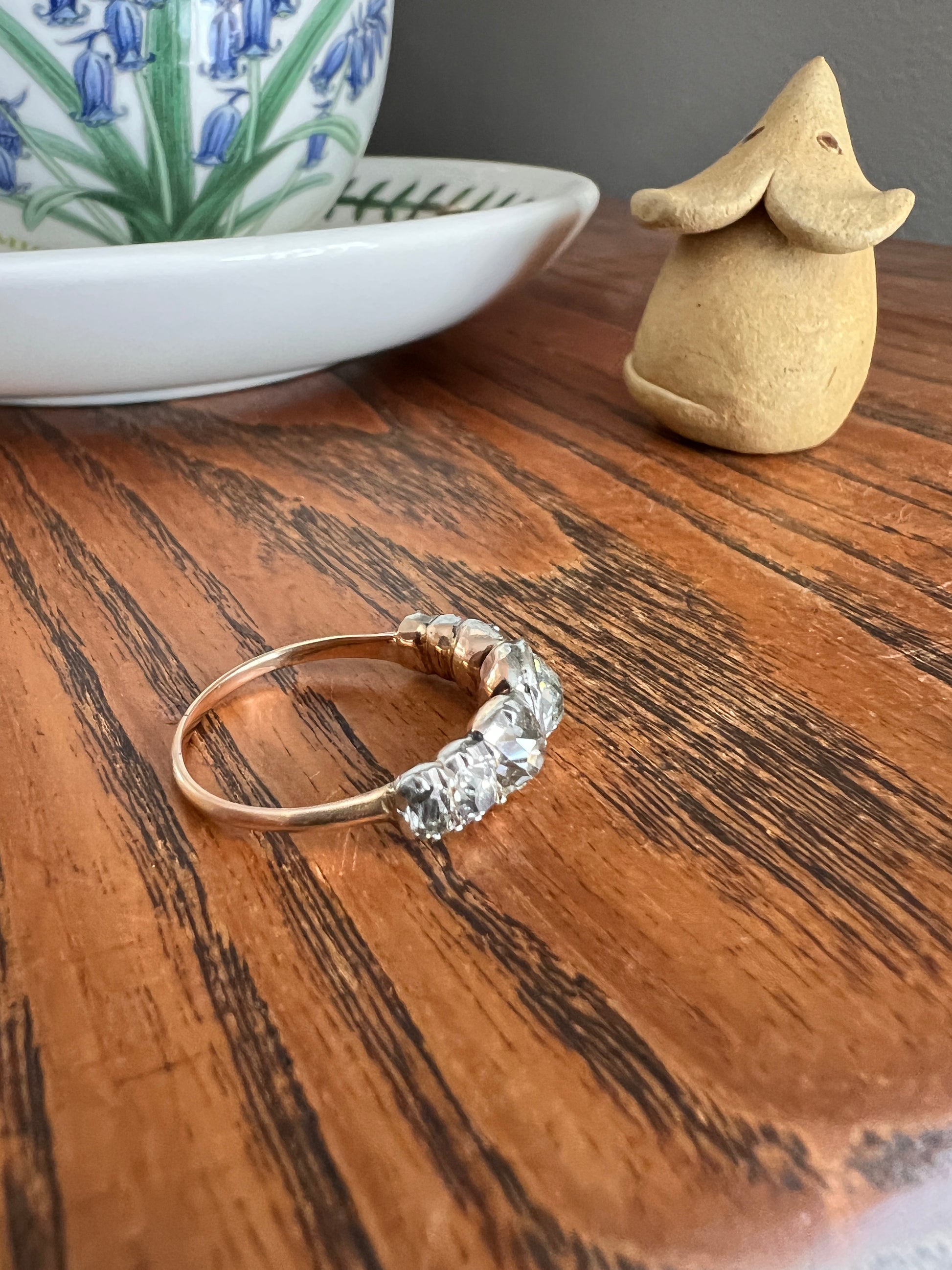 This ever popular half hoop stacker band ring is in original 200 year old condition with original shank, crafted in 18k rosy gold with the antique diamonds set in cut down silver collets as was customary during the time to set the diamonds in white metal. The domed, closed backs are in gold and are foiled within to reflect the light. Gorgeous moody sparkle with quite a lot of glitter. The center three stones especially face up quite white with the foil still bright and reflective. Layers perfectly with other pieces but substantial for solo wear as well.