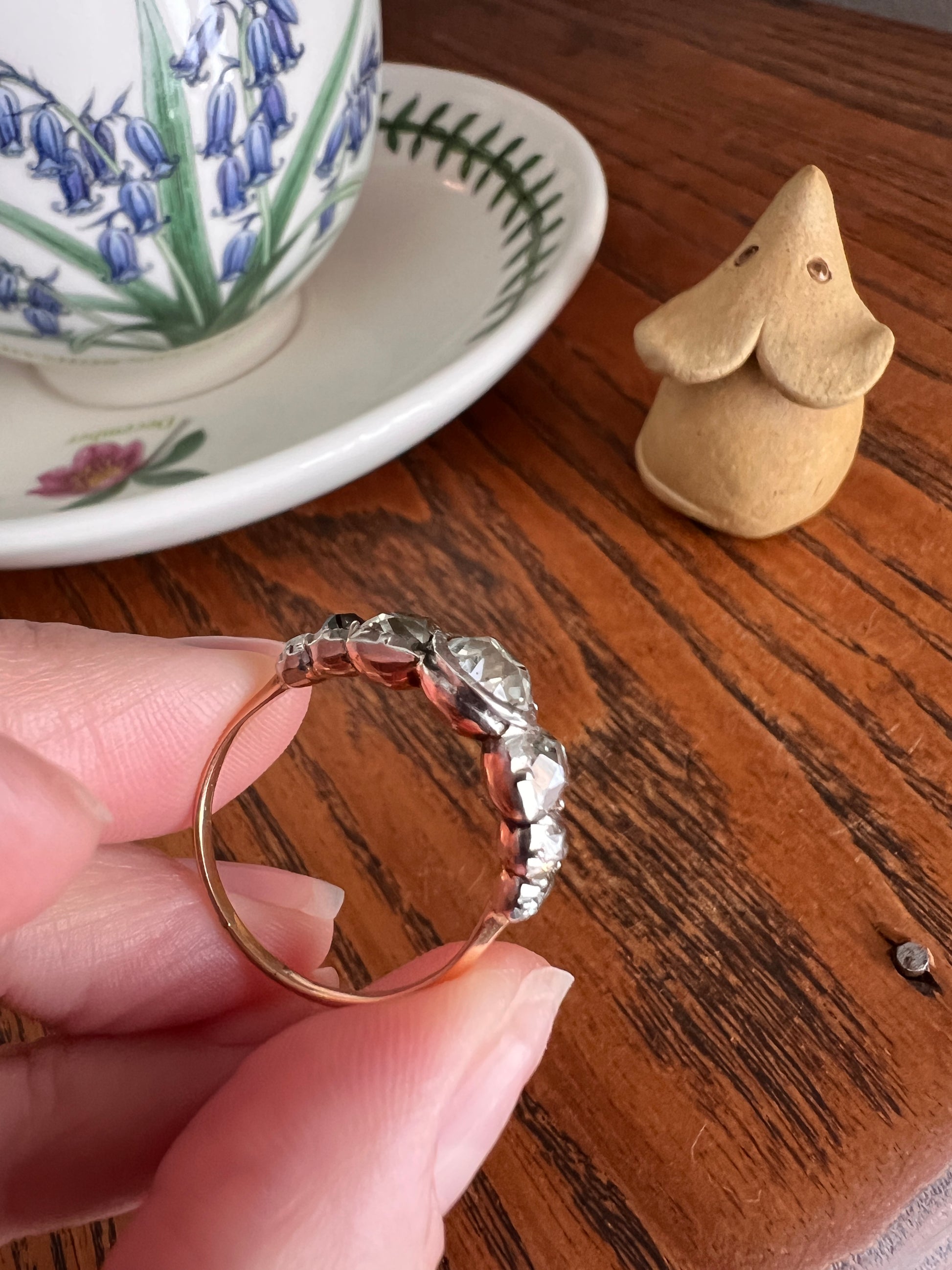 For antique diamond enthusiasts, the cuts don't get much chunkier than this, the center being round flanked by two more square stones. Then we have two more on each end that are more rectangular with elongated culets and with long and triangular scissor cuts for the crown facets. Always a joy to find uniquely hand cut antique diamonds. And at three carats, this stands among the best of stackable antique diamond bands I've ever sourced.