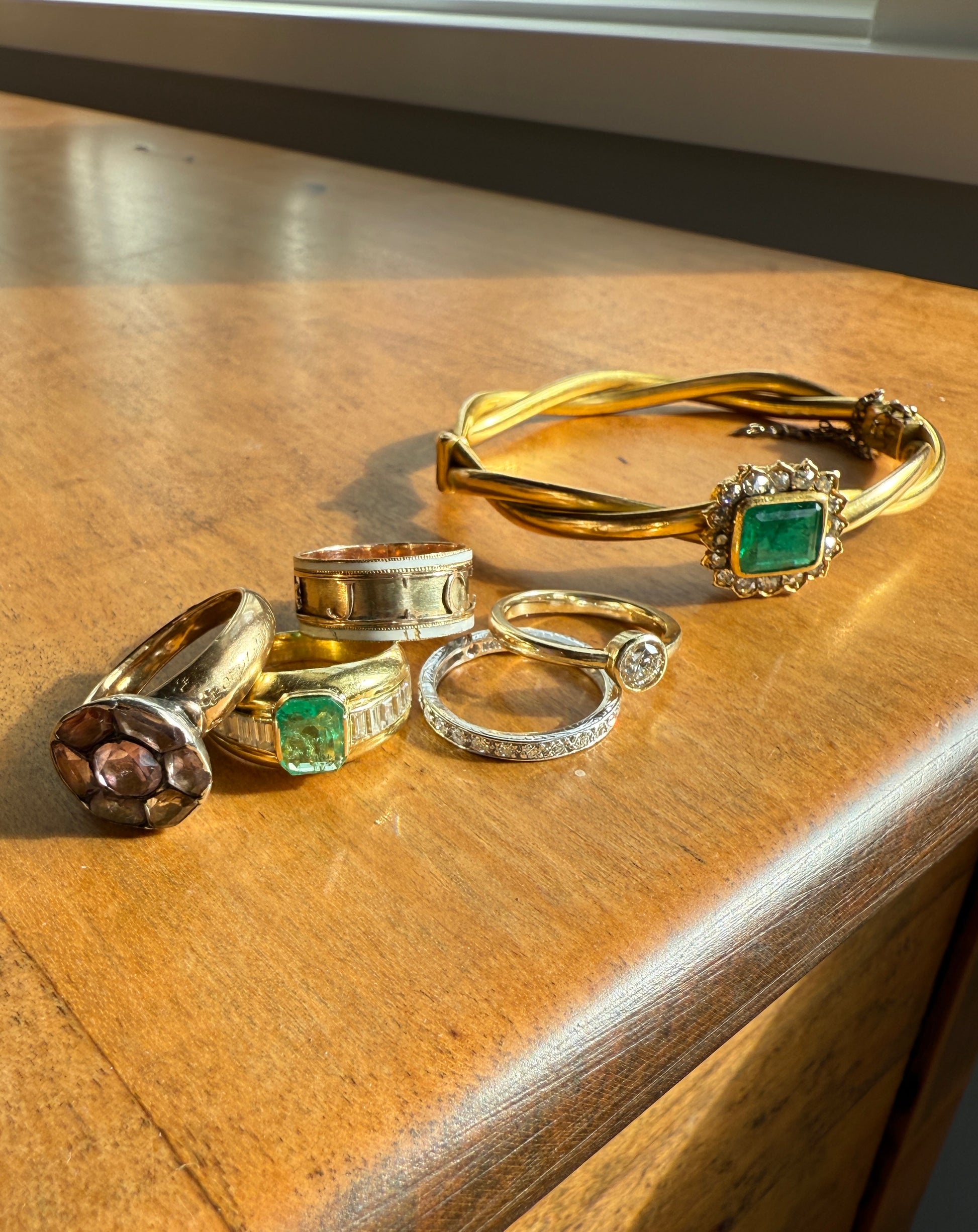 Many of my listings include group shots – I find the comparisons between pieces help show scale, diamond hues, etc. All items in group shots are inventory, but refer to the website to see what items have sold out and to watch for new listings from the grouping to appear on the home page.