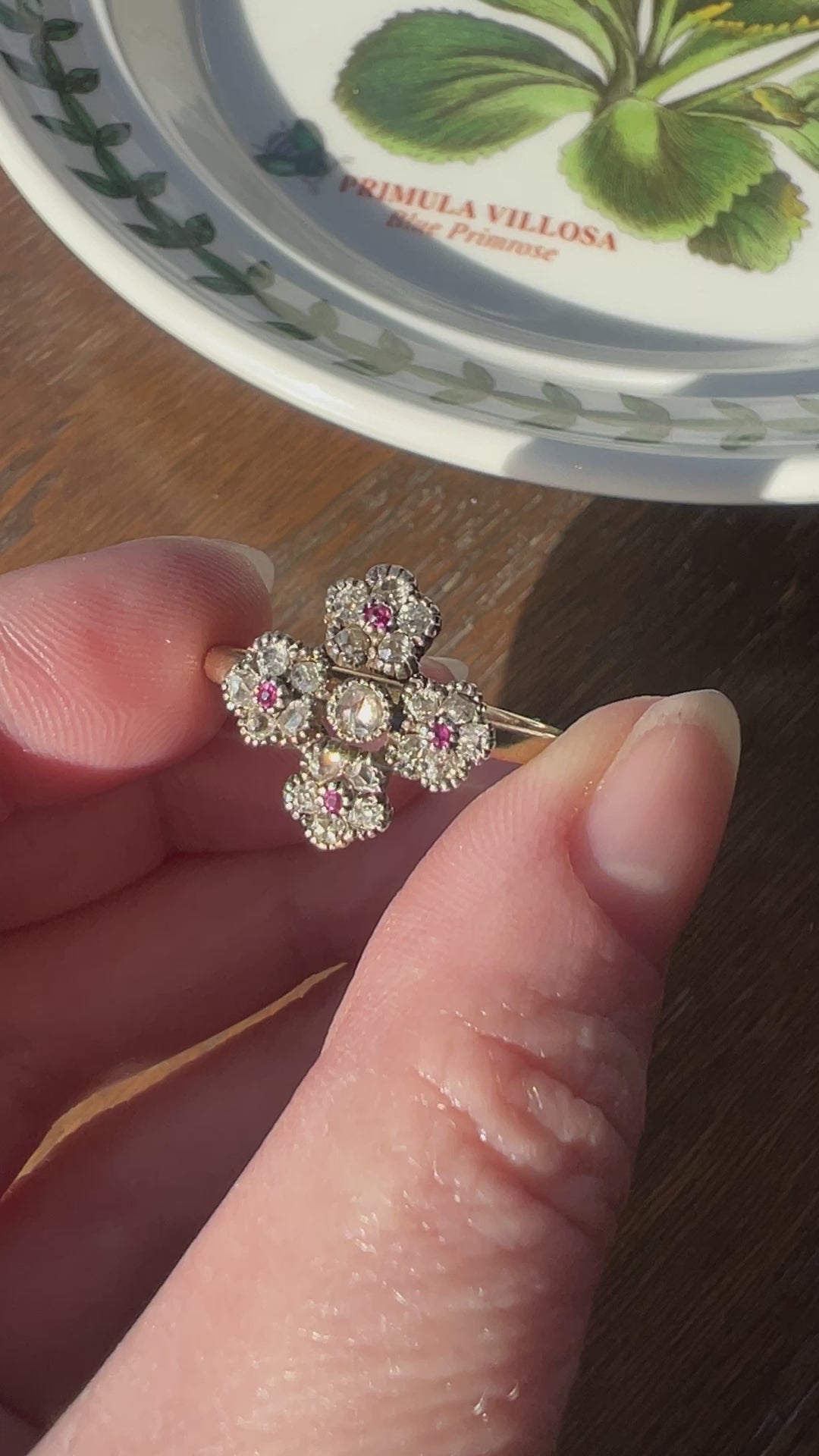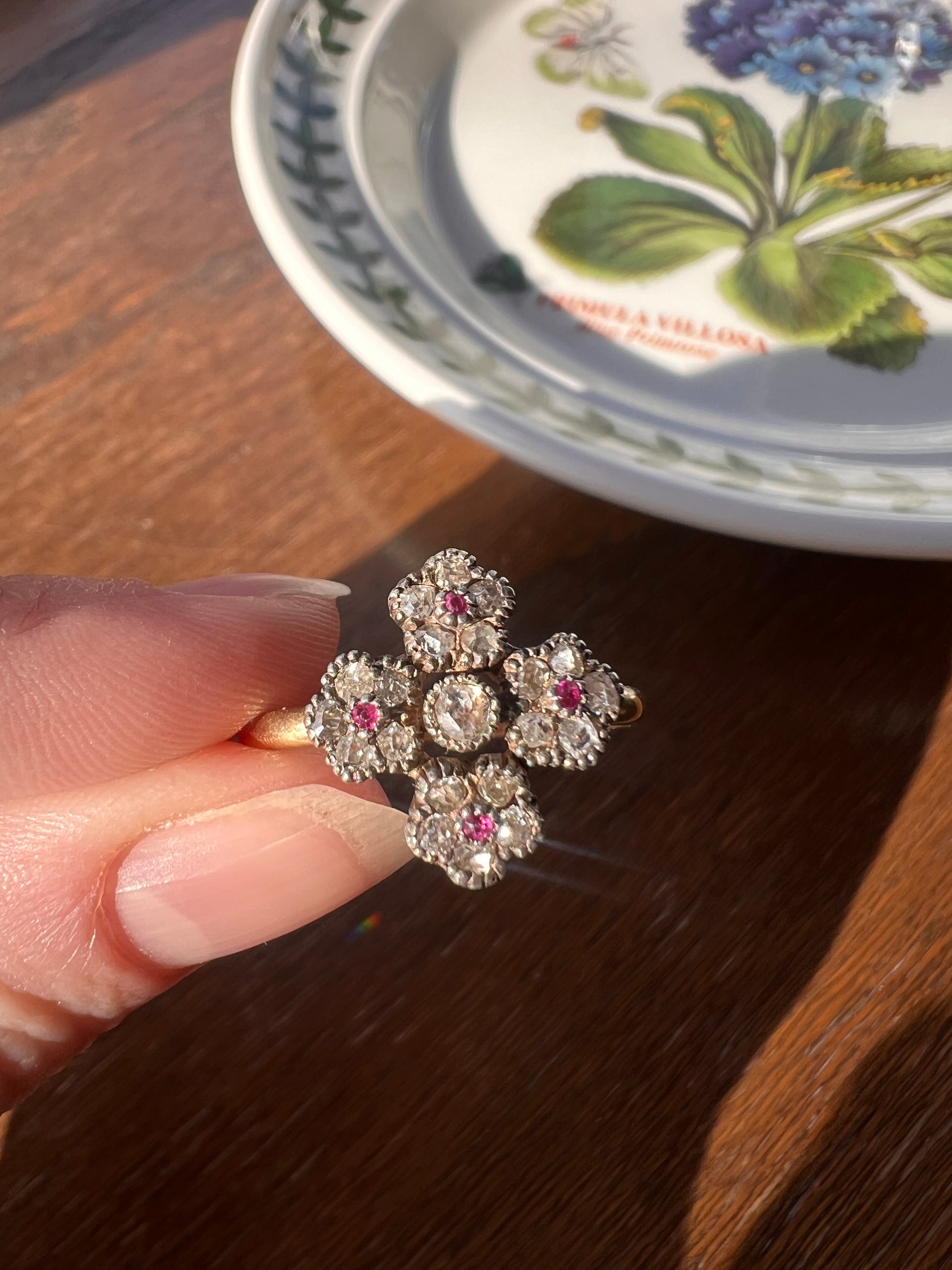 Glittery French antique floral cruciform ring. Four forget me not flowers made of old cut diamond petals with pink ruby centers surround a larger rose cut center. The diamonds are a mix of rose cut and old mine cuts, all clearly hand chiseled. The diamonds catch the light beautifully with the little pop of pink color, a beautiful antique look and a great "texture."