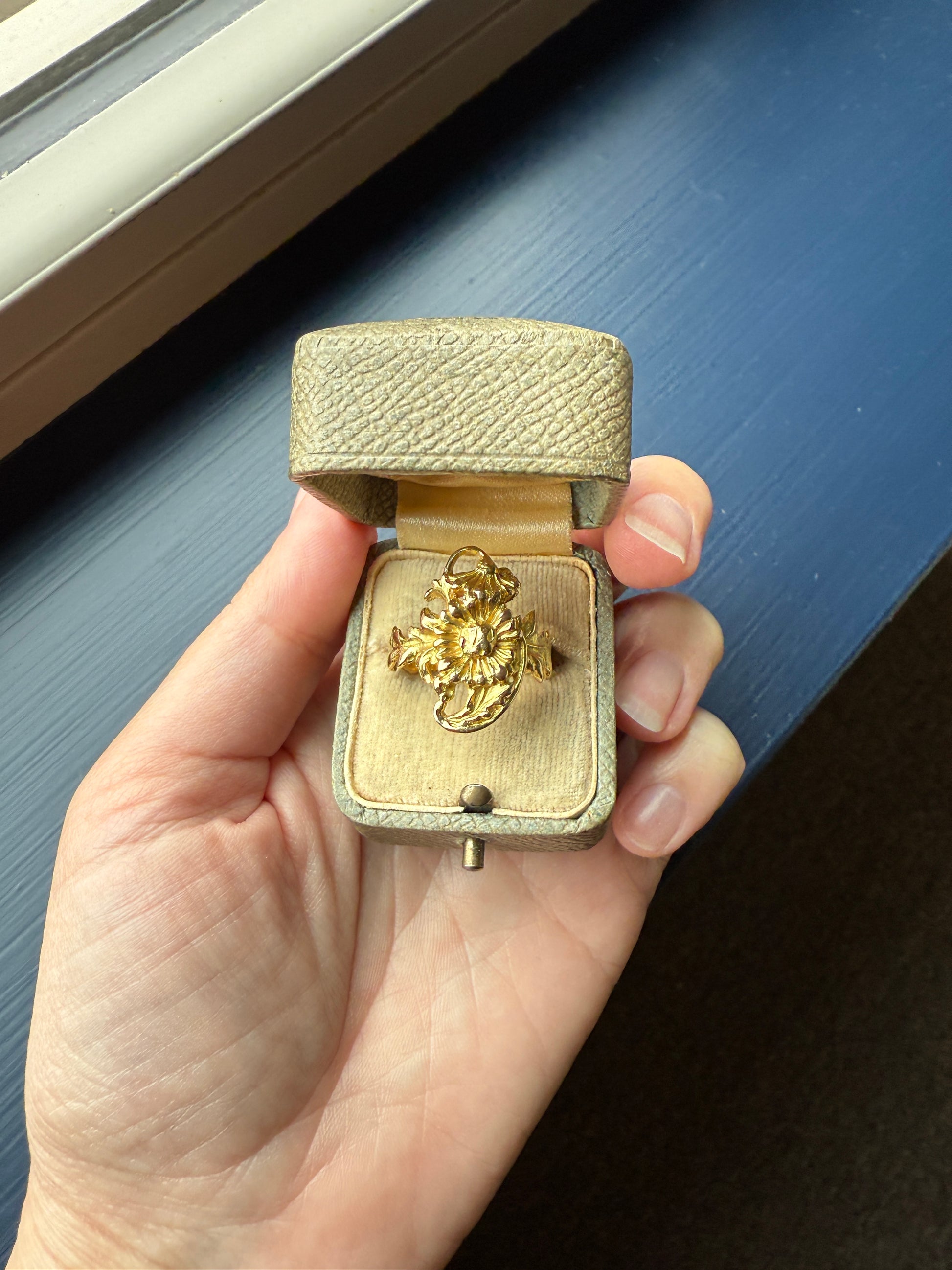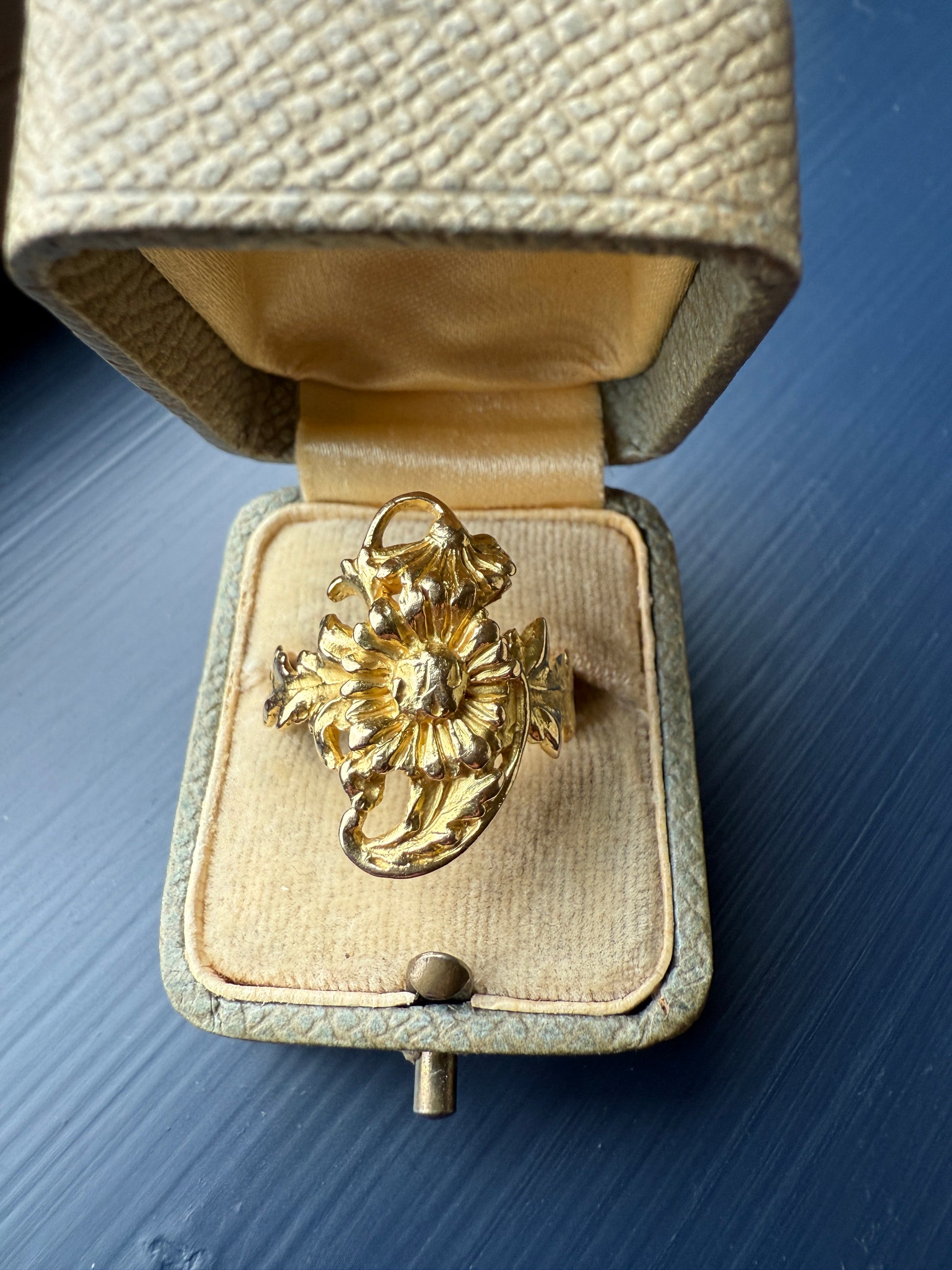 DAISY Large Scale ANTIQUE Figural Double Flower FRENCH Floral Ring 18k Gold Belle Epoque Romantic Gift Antique Art Nouveau Leaf Band