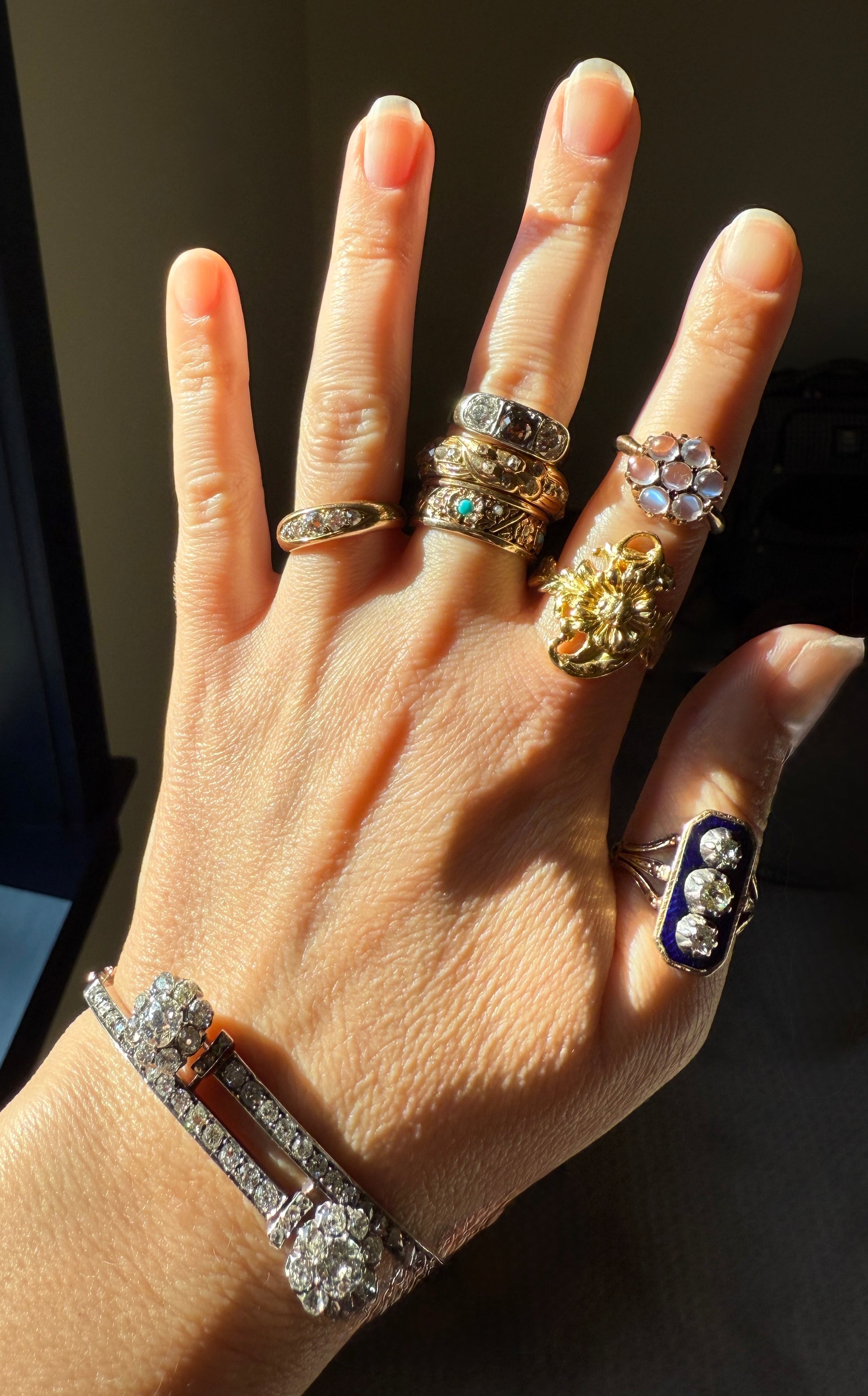 Please note that all my pieces are pre-owned and in estate condition. They will have patina, surface wear, a few small nicks. These pieces may also have evidence of a sizing, some build up around the stones and / or inclusions seen under magnification, typical for antique pieces. I have mentioned any noticeable issues above and they are all still wearable and eager to be loved and accepted for many years to come, (the preservation of antique jewelry, even those with signs of their age and history, is important to me. : )