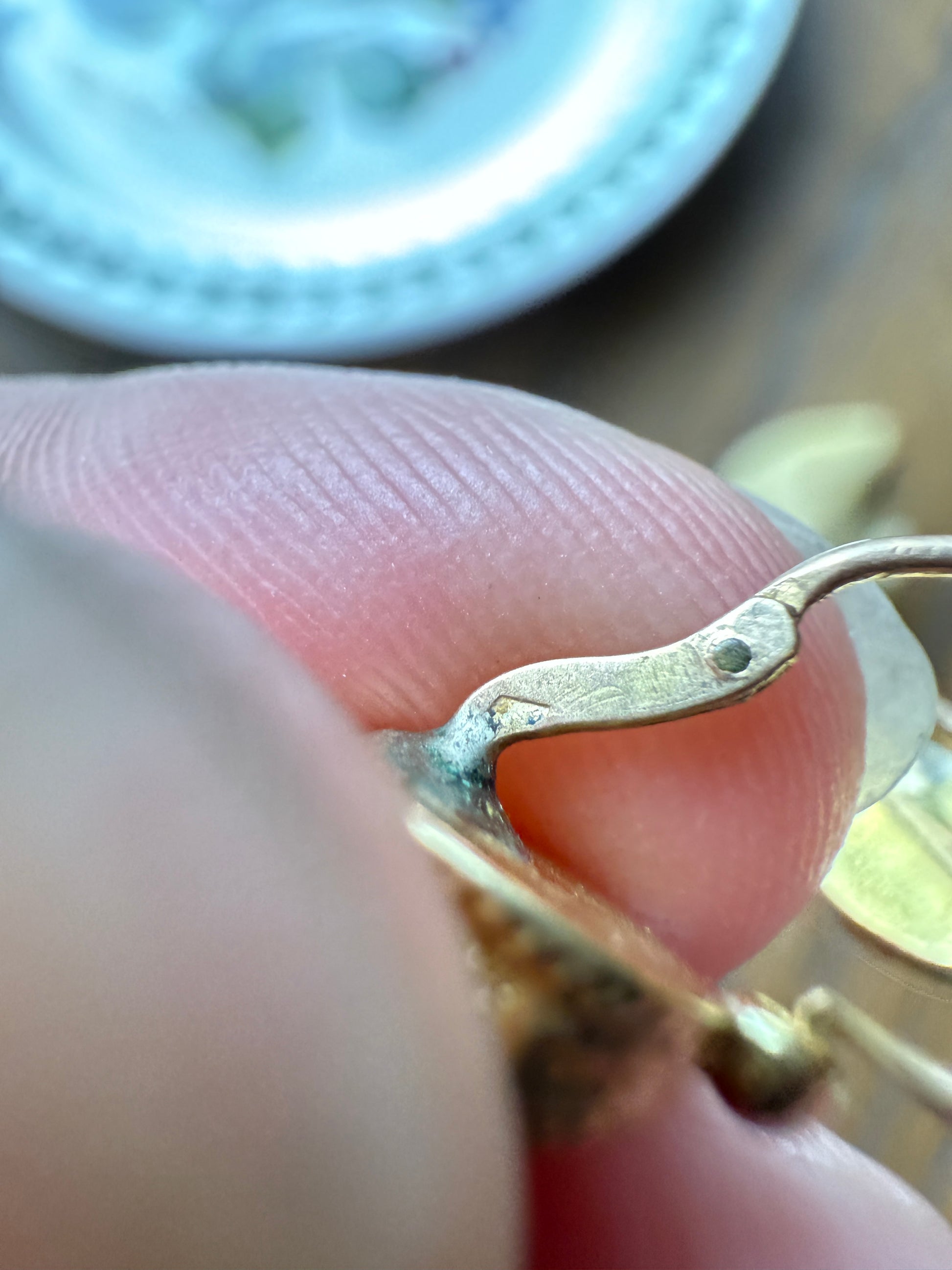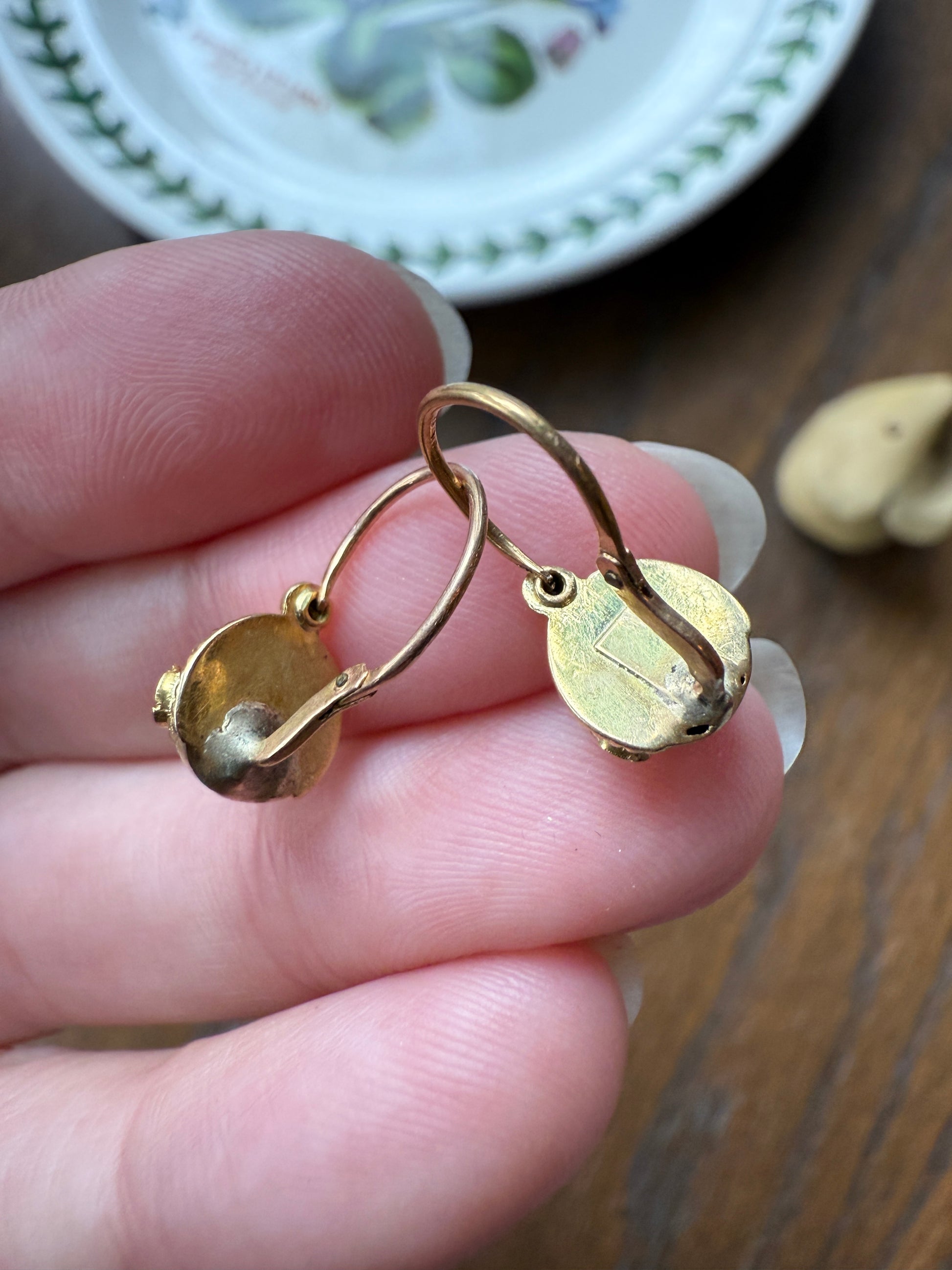 French antique gold filled dormeuse earrings. Very dainty and petite, meant to be slept in although we don't recommend 24/7 wear now on 100 year old antique hinges.