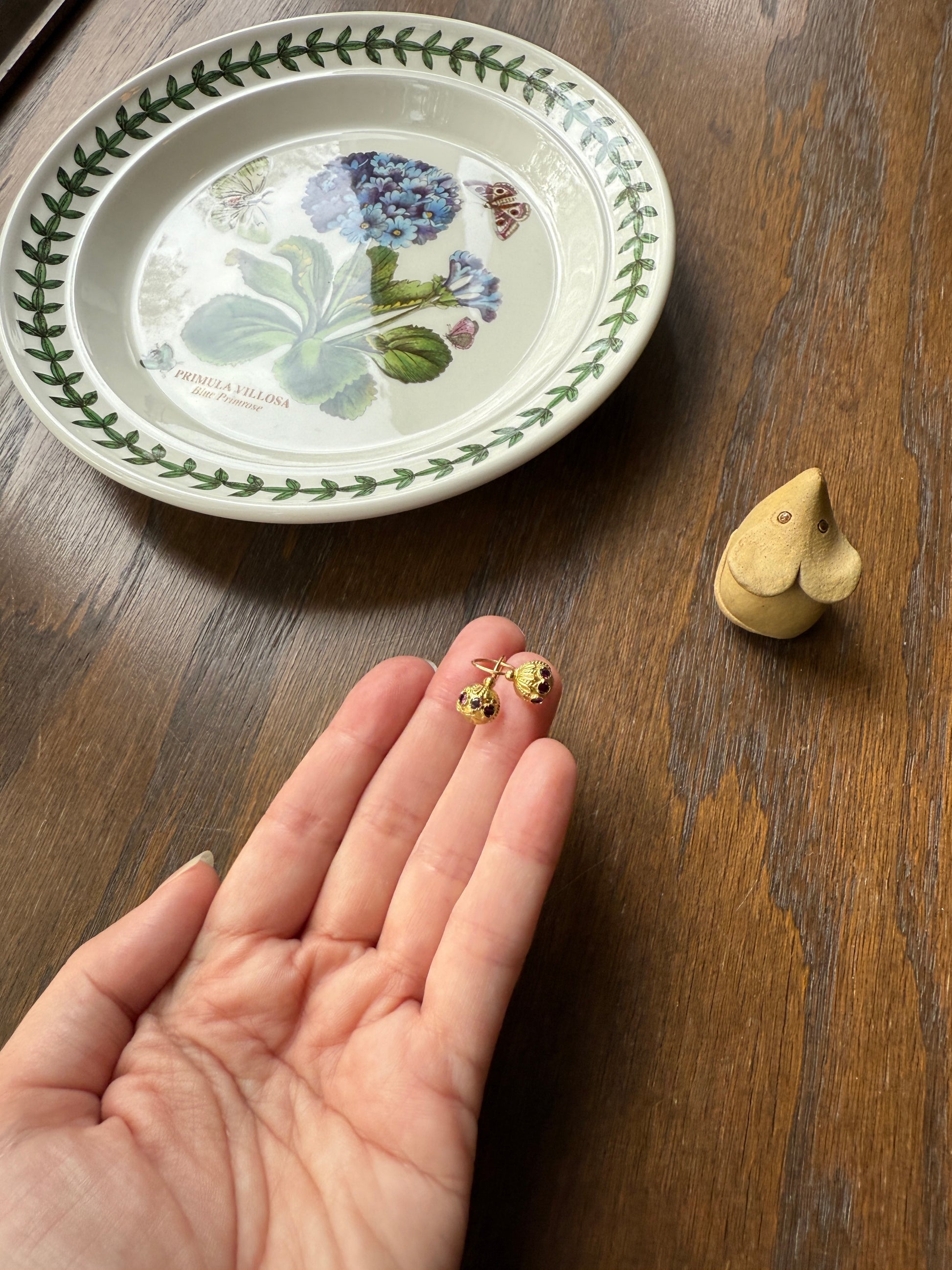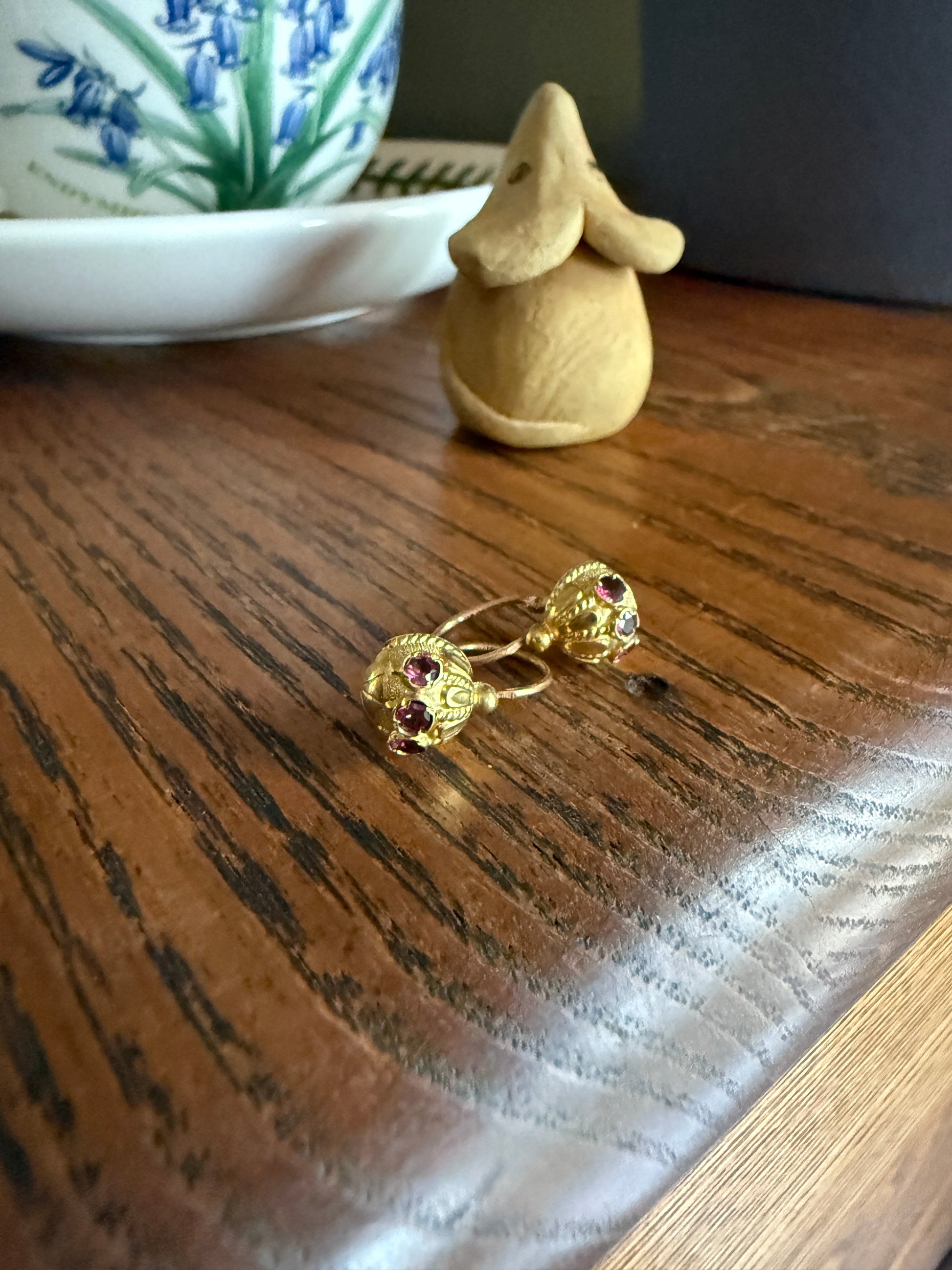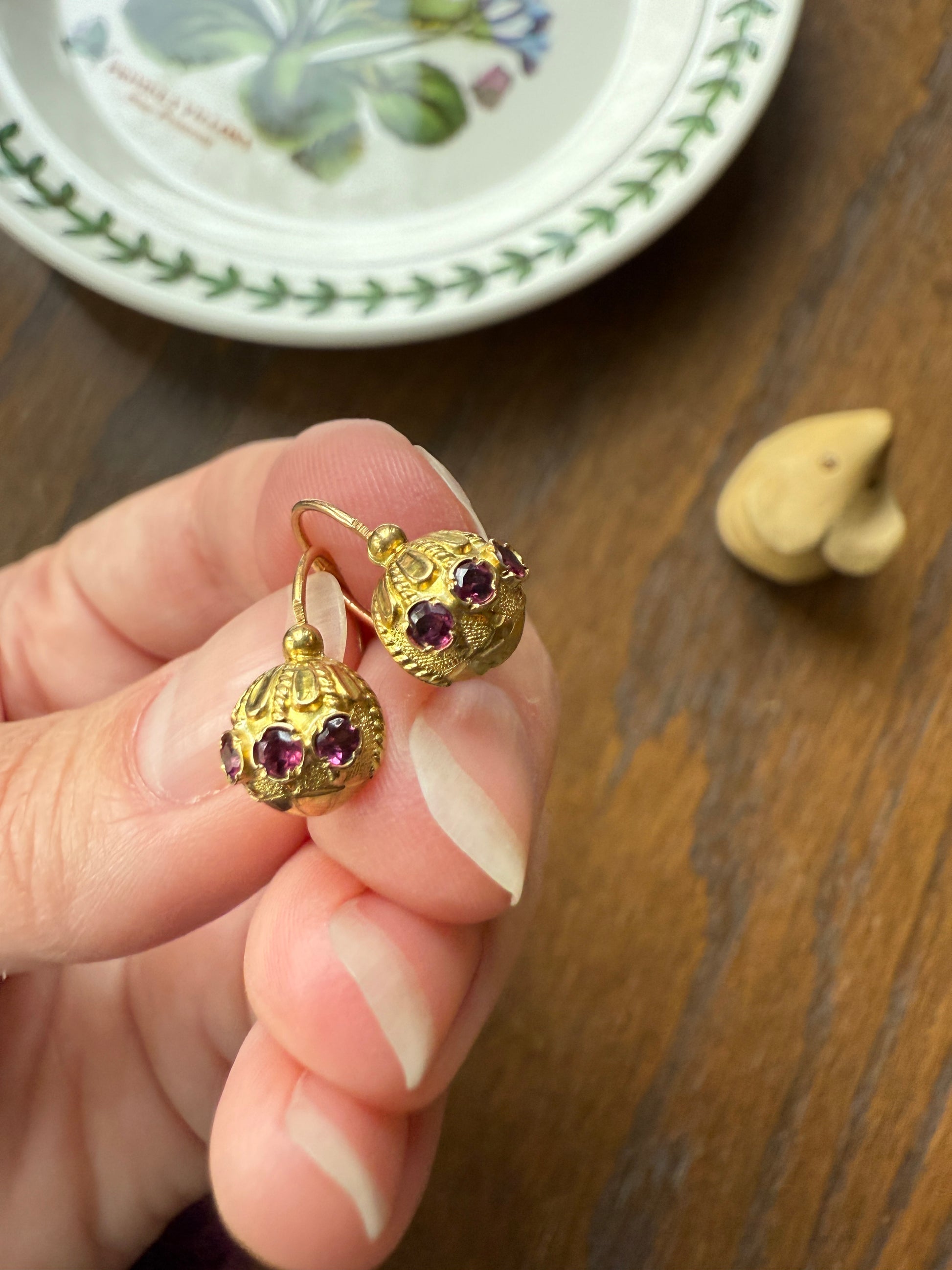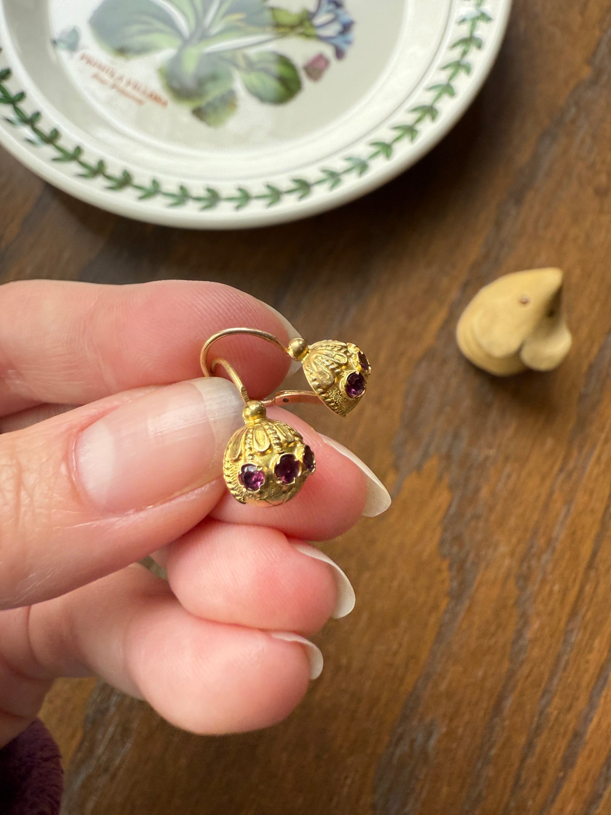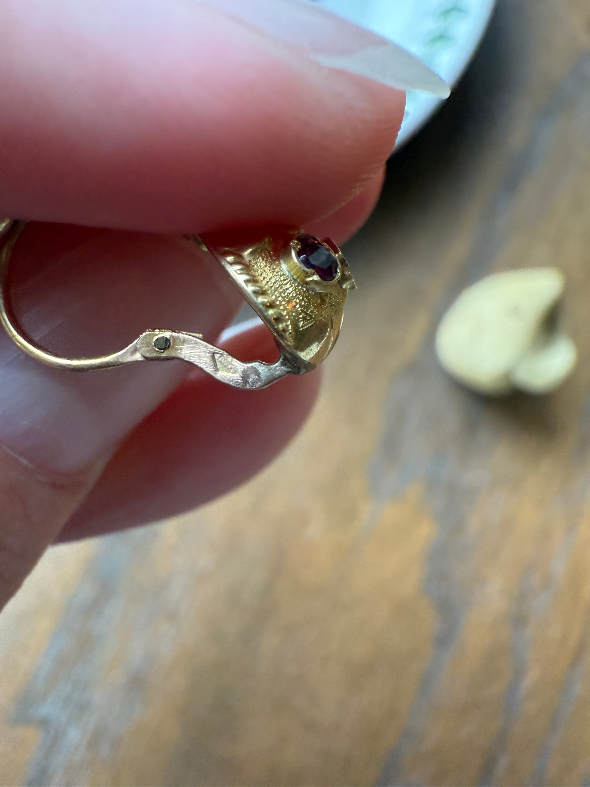 These are my favorite of the gold fill earrings I have, each set with 3 little garnets that are a beautiful purple color. The design just looks like something you'd see in a move. This has the French gold fill hallmark for Savard - which indicates a process of high quality hot gold foil laminating onto brass created by Francois Savard of Paris in the late 1800s / early 1900s. An unusually thick layer of 14-18k gold foil over brass forms the jewelry to withstand long term wear. The French were known for their high quality gold fill fabrication methods during this time.