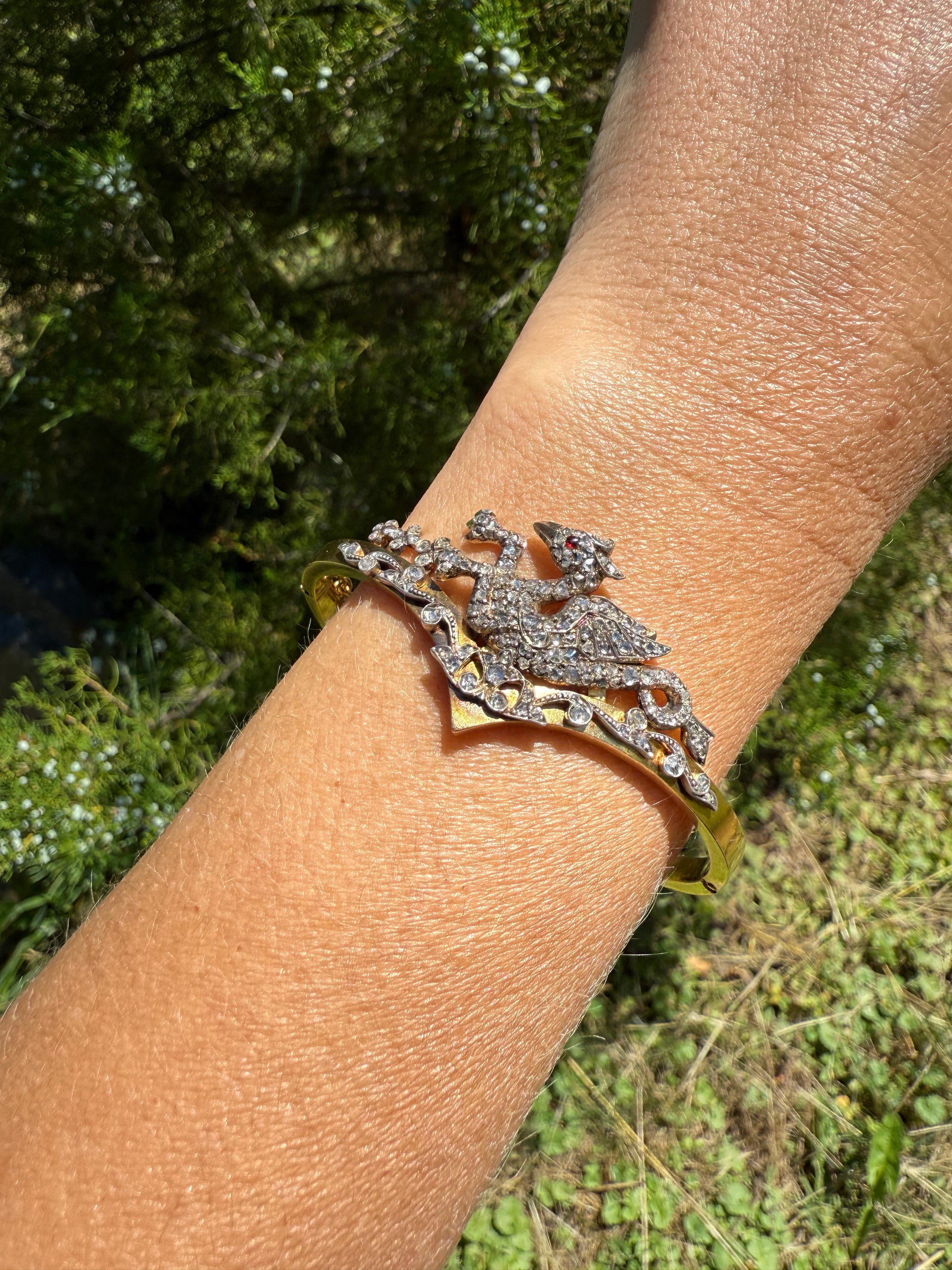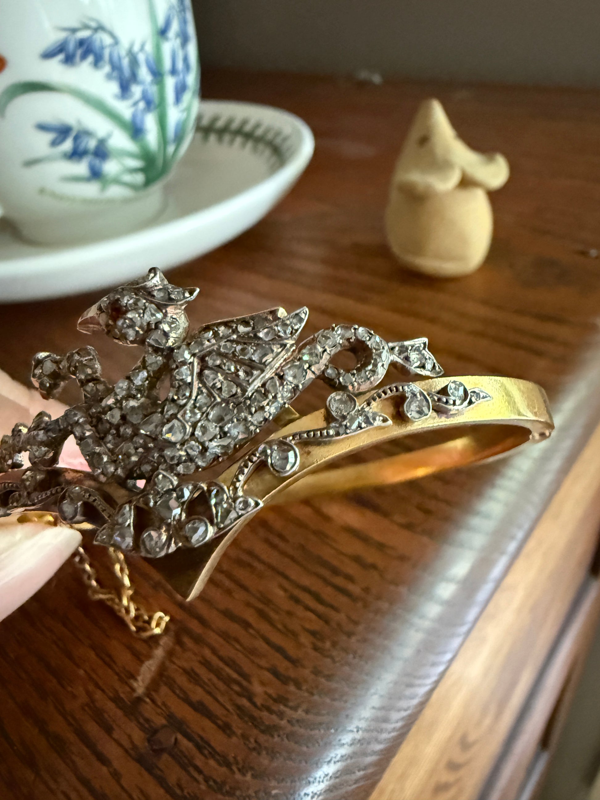 This French antique piece is crafted in 18k gold with a chevron shaped top to the bangle, which is set with the applied silver topped and completely diamond encrusted dragon. Or perhaps it is a chimera (a very popular motif that the French used during this period) or some have said it looks like a phoenix to them as well.