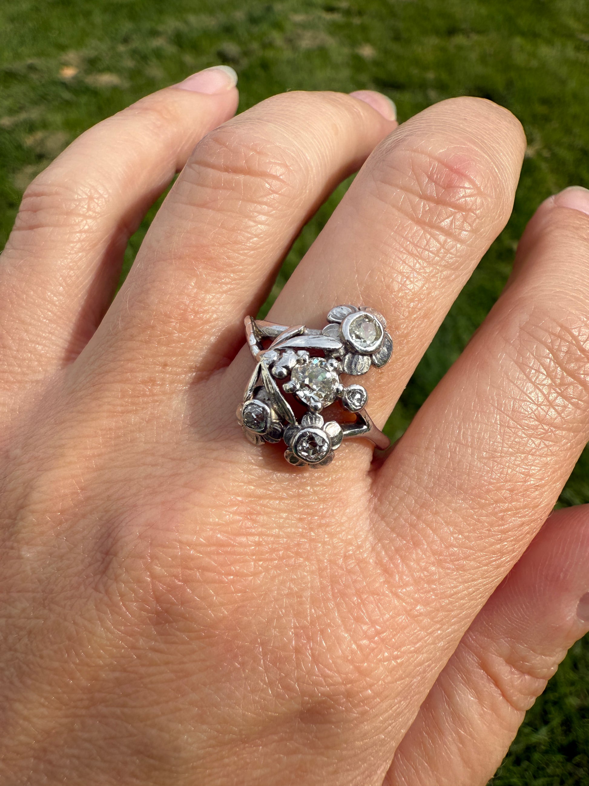 DRAGONFLY Special Dated 1922 Antique Ring 0.7 Carat Old Mine Cut DIAMONDS 18k White Gold Figural Flower Bouquet French Art Deco