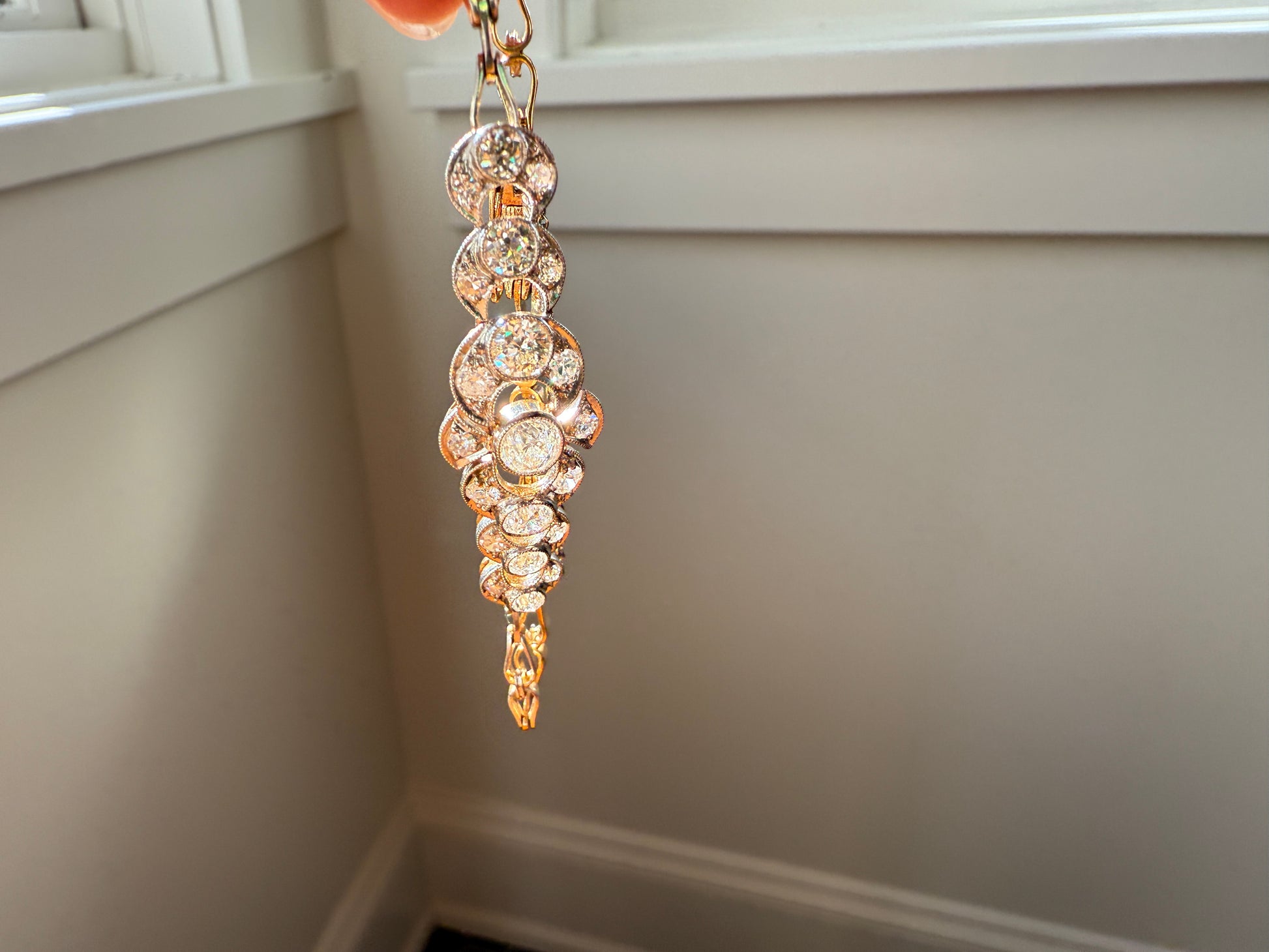 So bright and sparkly! I got this ornate beauty on my recent inventory trip to Sweden. This is a nice one to dress up or down as it has some ornateness with the scalloped face but also has a versatile figure 8 chain link around the back so it isn't over the top. It has about 2 1/4 carats of old cut stones - old mine and European cuts for the larger stones, and old single cut stones for the smaller accent stones in the scalloped designs. Beautiful milgrain details around each bezel and around the outline of the piece. Openwork design between the half moon shaped diamond settings allows light to pass through for wonderful sparkle.
