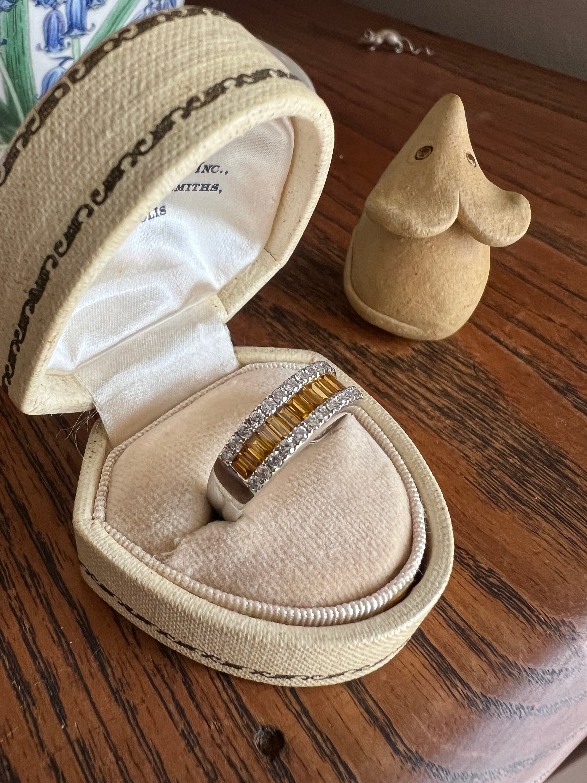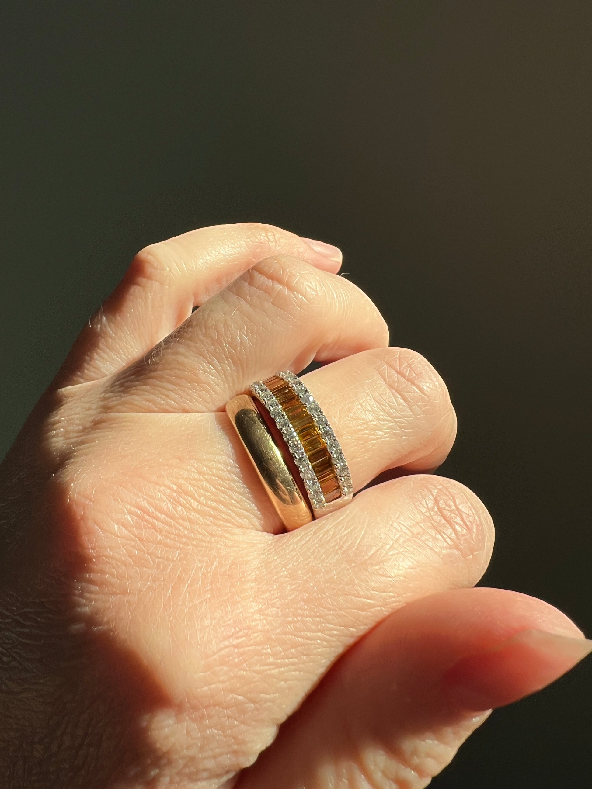 The yellow diamonds are baguette cuts, channel set and slightly recessed down the center of the ring, with raised round brilliant white diamonds for additional sparkle and contrast, 14 on each side. 43 diamonds in total!