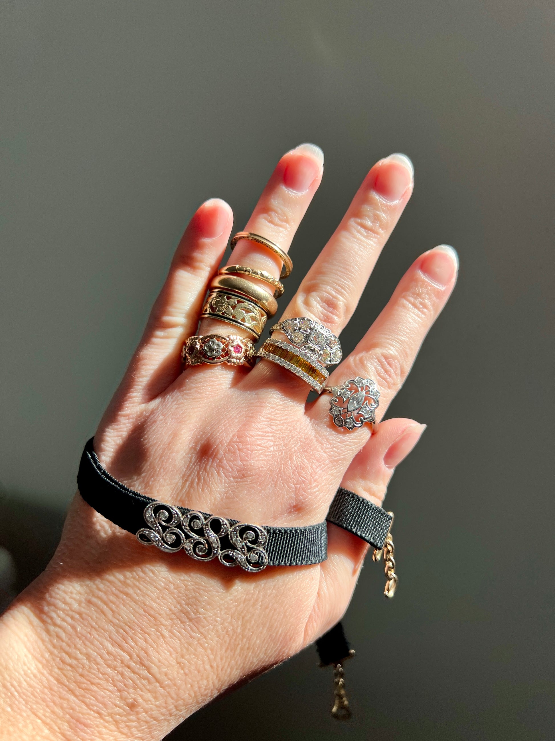 Please note that all my pieces are pre-owned and in estate condition. They will have patina, surface wear, a few small nicks. These pieces may also have evidence of a sizing, some build up around the stones and / or inclusions seen under magnification. I have mentioned any noticeable issues above and they are all still wearable and eager to be loved and accepted for many years to come.