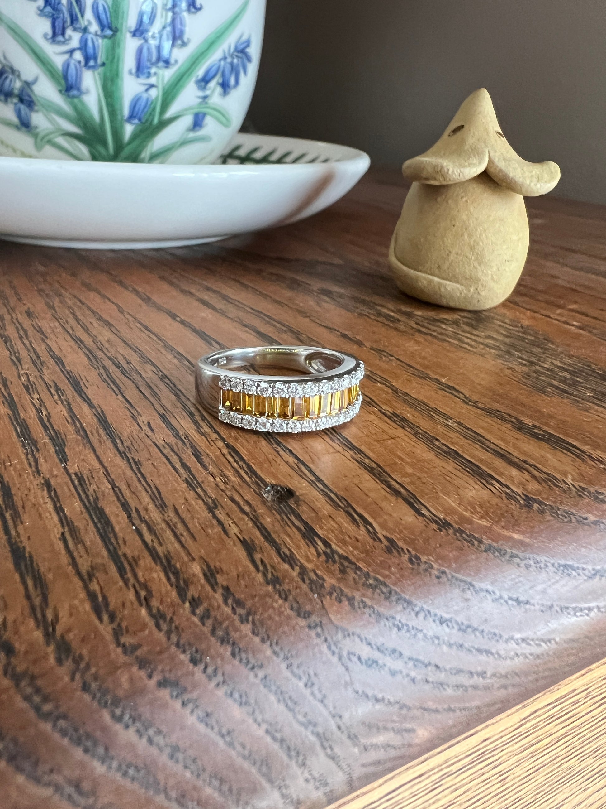 It is a fabulous one to layer, with really any color ringstack as the yellow diamonds look beautiful with yellow gold, or it can be worn with white gold, silver and platinum to provide the pop of color. It is quite eye catching to wear alone as well with the sparkly color. I enjoy mixing metals so I like to wear it with a yellow gold band. So fun! The baguette diamonds, being part of the step cut method of cutting, creates that hall of mirrors effect.