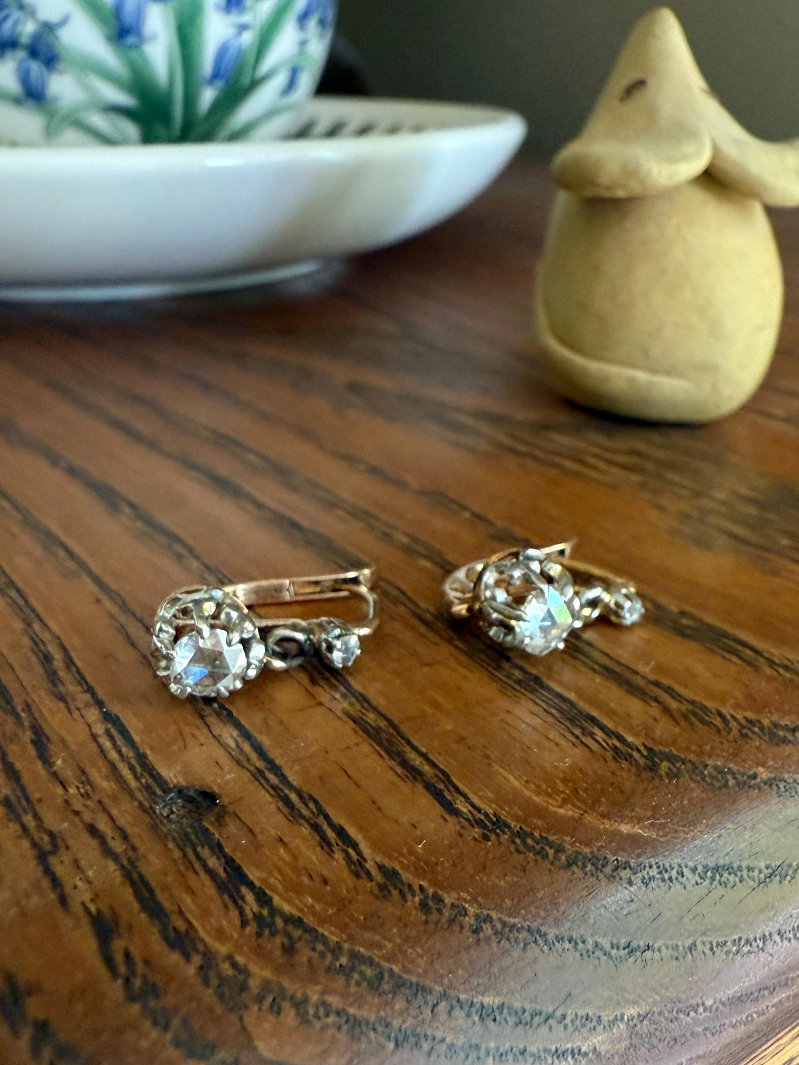 As with all my pieces this is in estate condition. Both stones have nibbles around the outside edge, one worse than the other, it has small chips with loss but the stone is still held in the prongs. But they function well and are very wearable. They have a really great color and clarity (even though they were cut long before the 4 C's ever existed.). The top rose cuts are typical antique diamonds with some warmth due to the setting. The hinges still lock right into place. Beautiful French antique earrings. But my disclaimer as with all my pre-owned pieces - Please note this is not a new / mint condition item. We are talking about 125 year old hinges so they pretty much always need a gentler hand, although these are nice that they are not inserted from behind the ear which are harder to handle in my opinion.