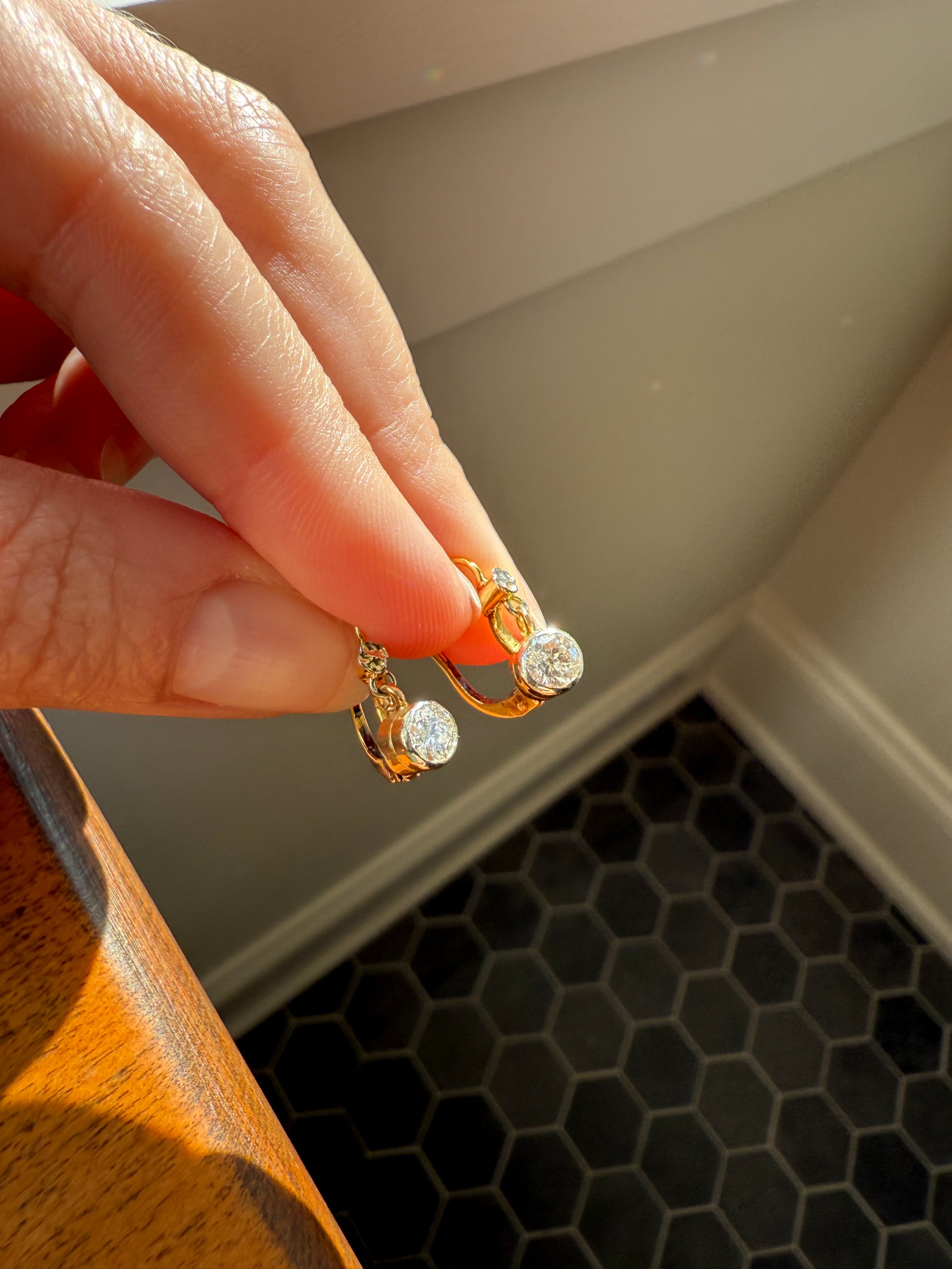FRENCH Vintage 18k GOLD .75 Carat Tdw Transitional Cut Diamond Earrings Dangle Dormeuse Gift Belle Epoque Bridal Something Old Bezel Set