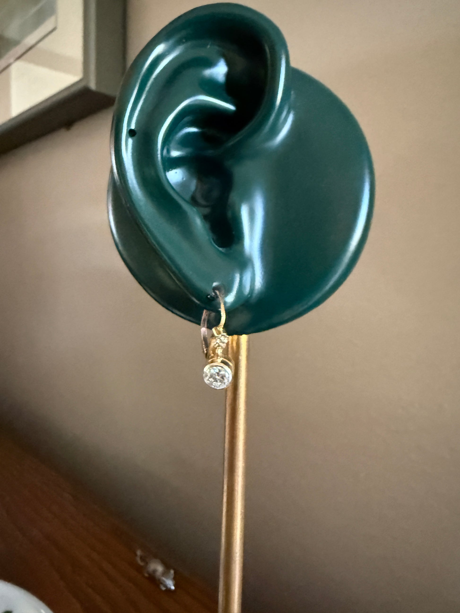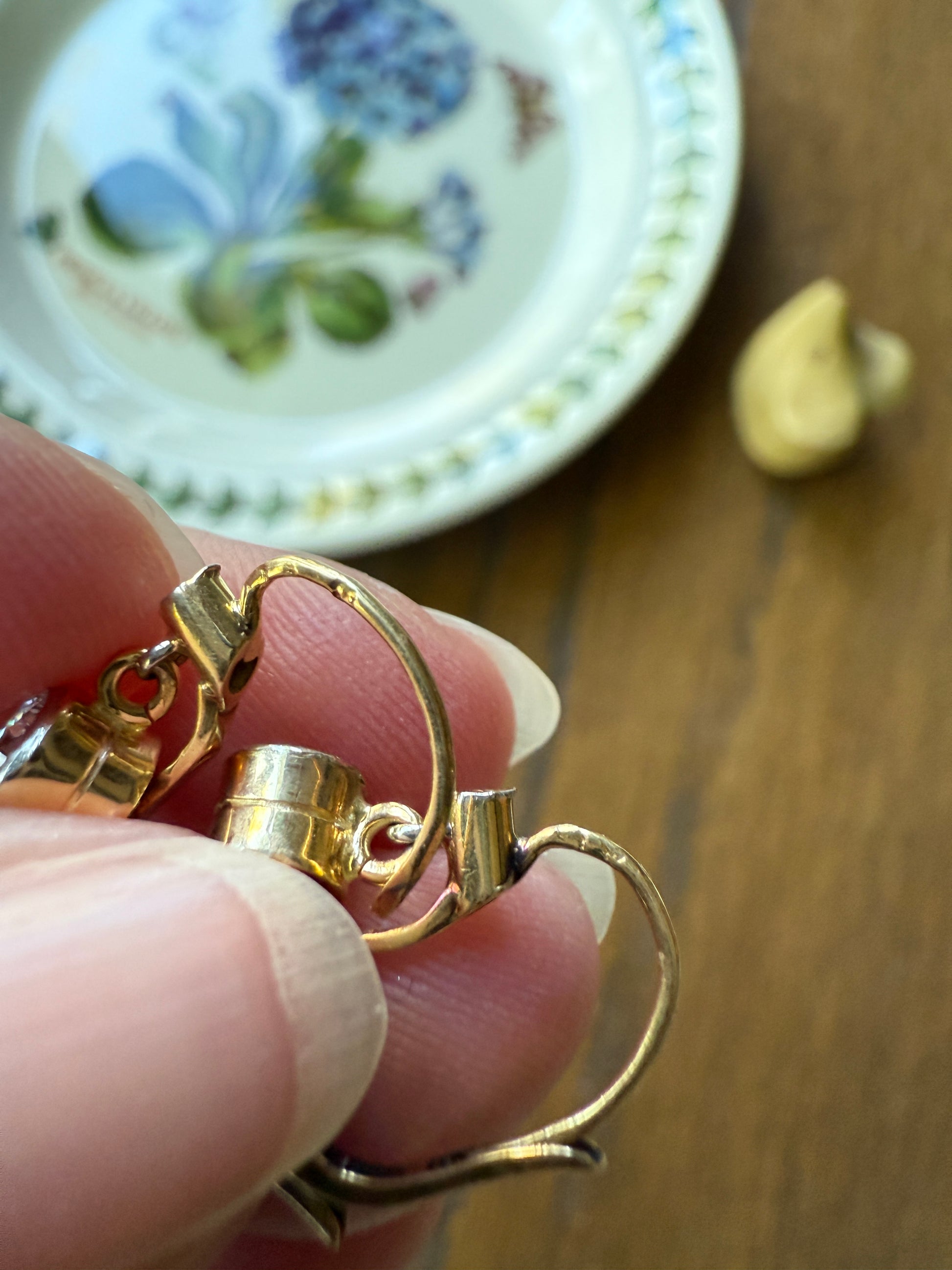 Tight and springy hinges, better than many dormeuse that can be found. They snap closed and wear securely. One diamond is eye clean with just a few small specks seen under magnification. The other has a frosty pocket inclusion with some carbon and is situated just over the culet. It's not a solid ink spot but is slightly eye visible. The diamonds are nice and bright in color with a good sparkle, lively and not dingy in any way.