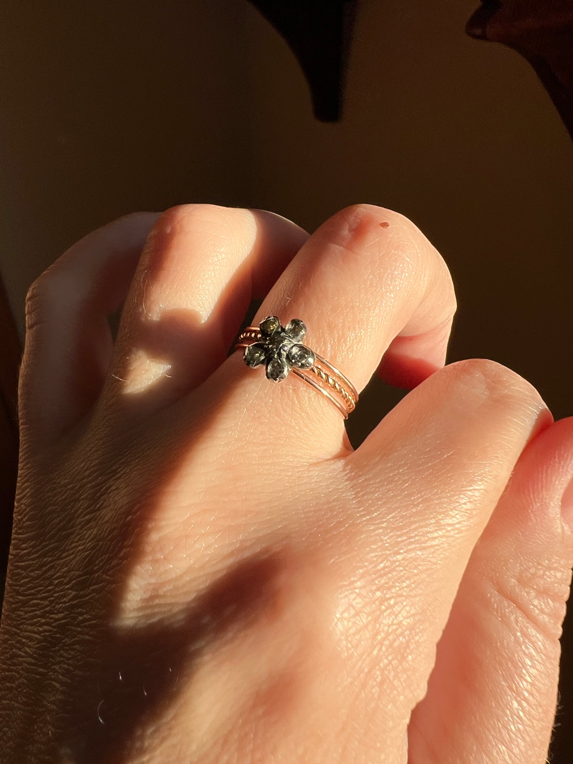 GEORGIAN Antique PANSY Floral Rose Cut Diamond Cluster Slide 18k GOLD Skinny Multi Three Band Stacker Ring French