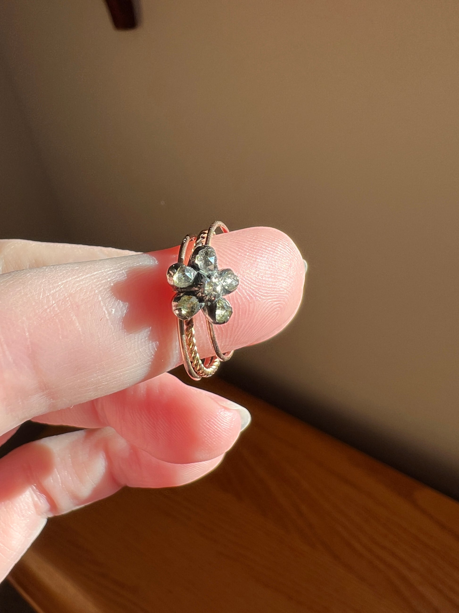 All original French antique Georgian era multi band ring. This little sweetie has three skinny bands connected by a floral cluster slider that can spin all the way around the bands, but holds the three skinny bands together. The center skinny band is braided and the flanking two are smooth for contrast. The floral cluster is holding six little rose cut diamonds in silver collet settings to resemble a pansy or forget me not. Such a romantic little piece.