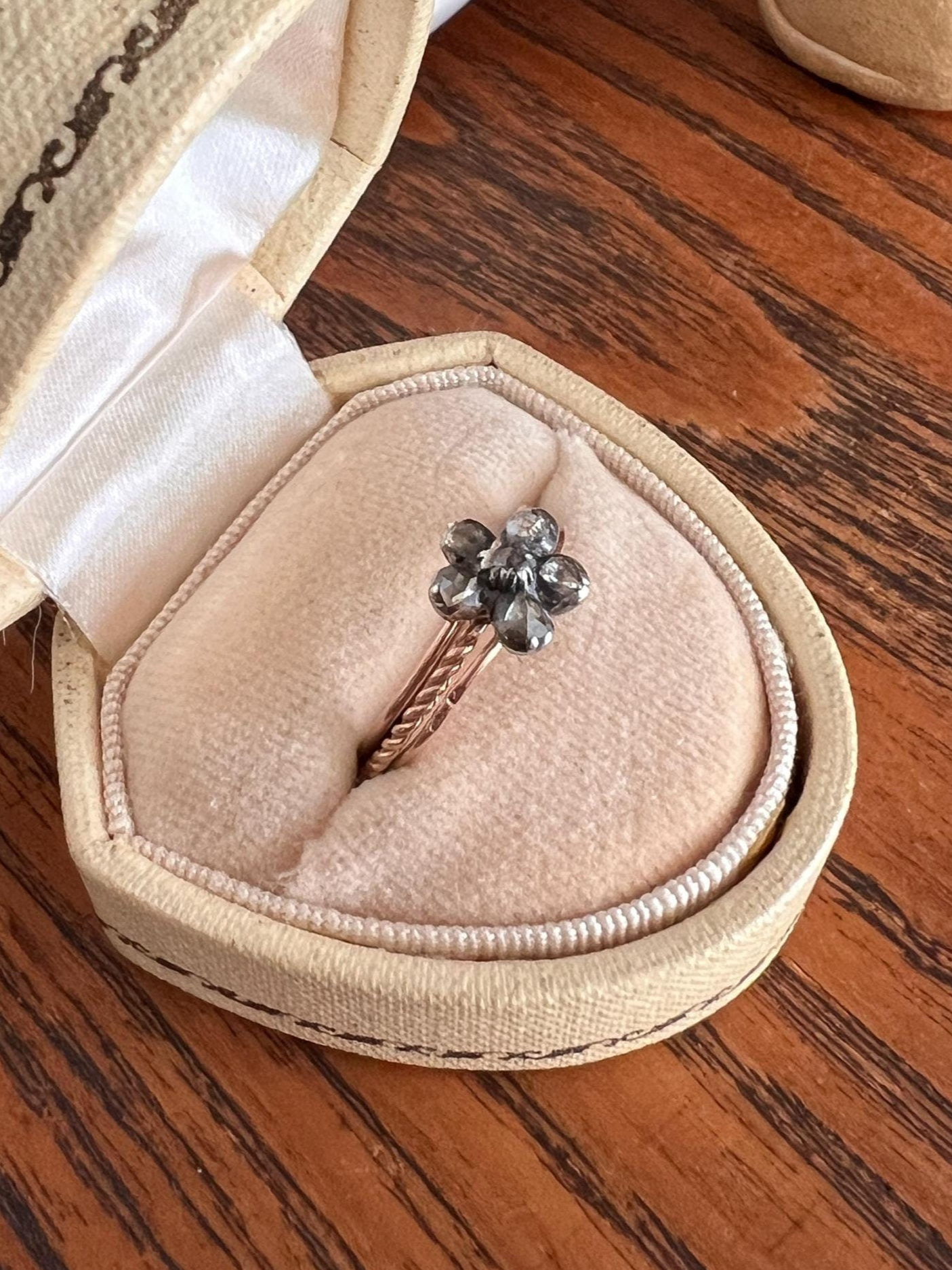 All my pieces are pre-owned and in estate condition. Typical antique diamonds with natural inclusions, irregular facets and warmer gray to champagne hues from age to the foil. A few nicks or a rough edge seen under magnification but the diamonds are small so they just add a glint of glitter. These old diamonds were cut by hand so they may have always had a rough edge here or there. This is a dainty piece as the bands are very delicate. They have a few curves but are secured with the flower. Also with the closed back foil settings, you should avoid getting it wet. Patina to the silver that could be polished if desired. But with all my items - Please note this is not a mint condition item.