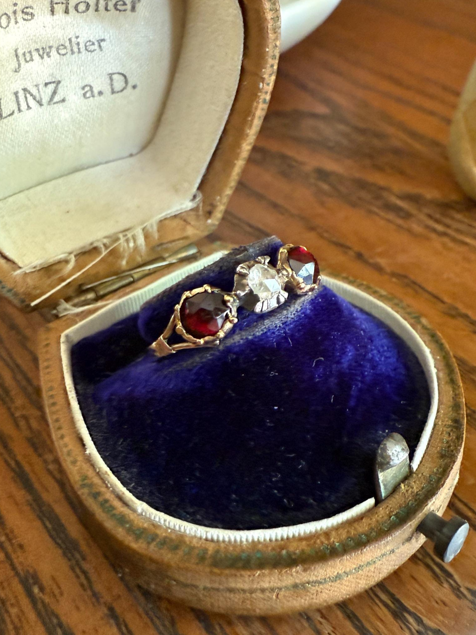 Georgian Era ANTIQUE Rose Cut Diamond & Red GARNET Three Stone RING 18k Gold Skinny Band