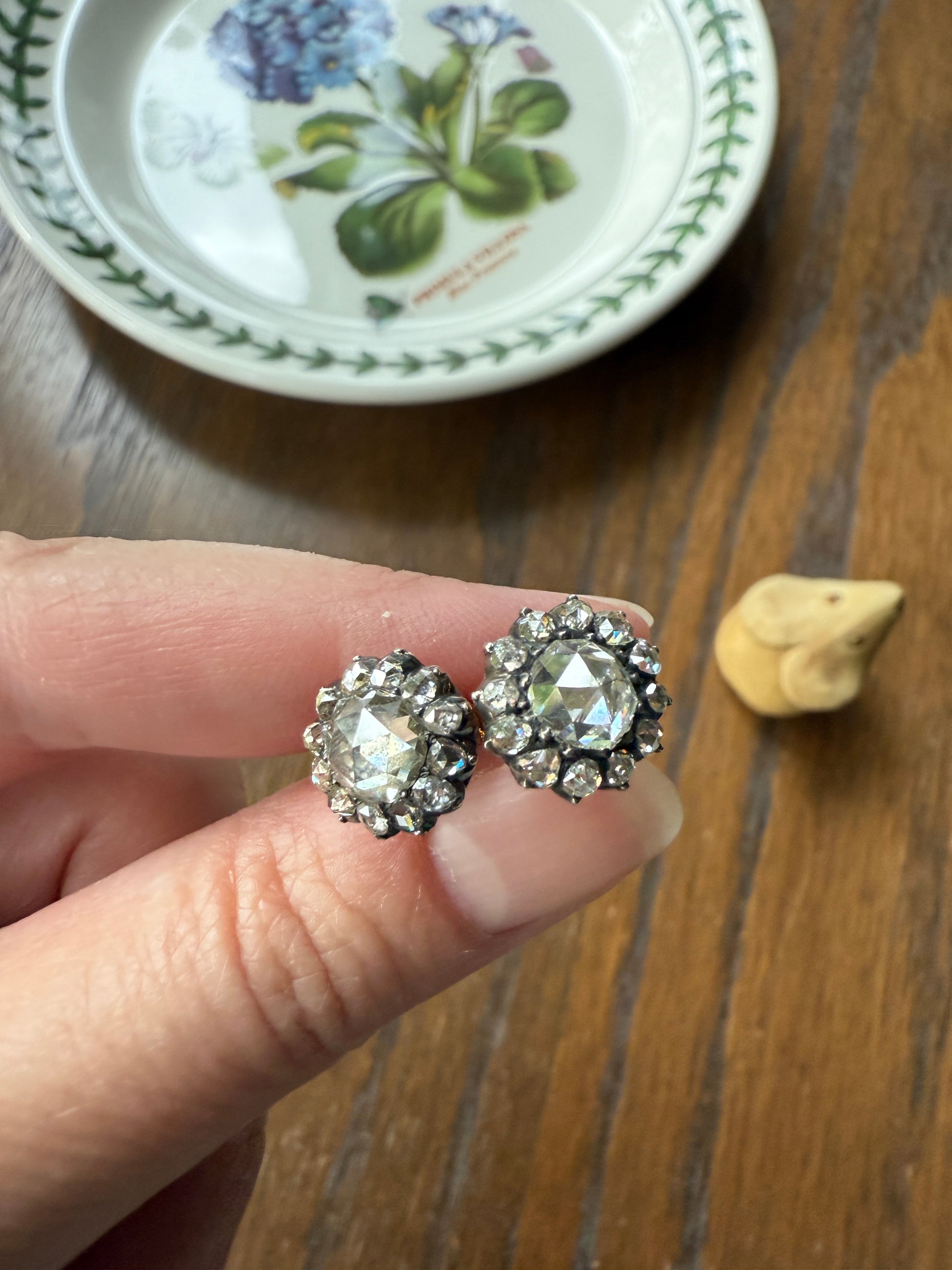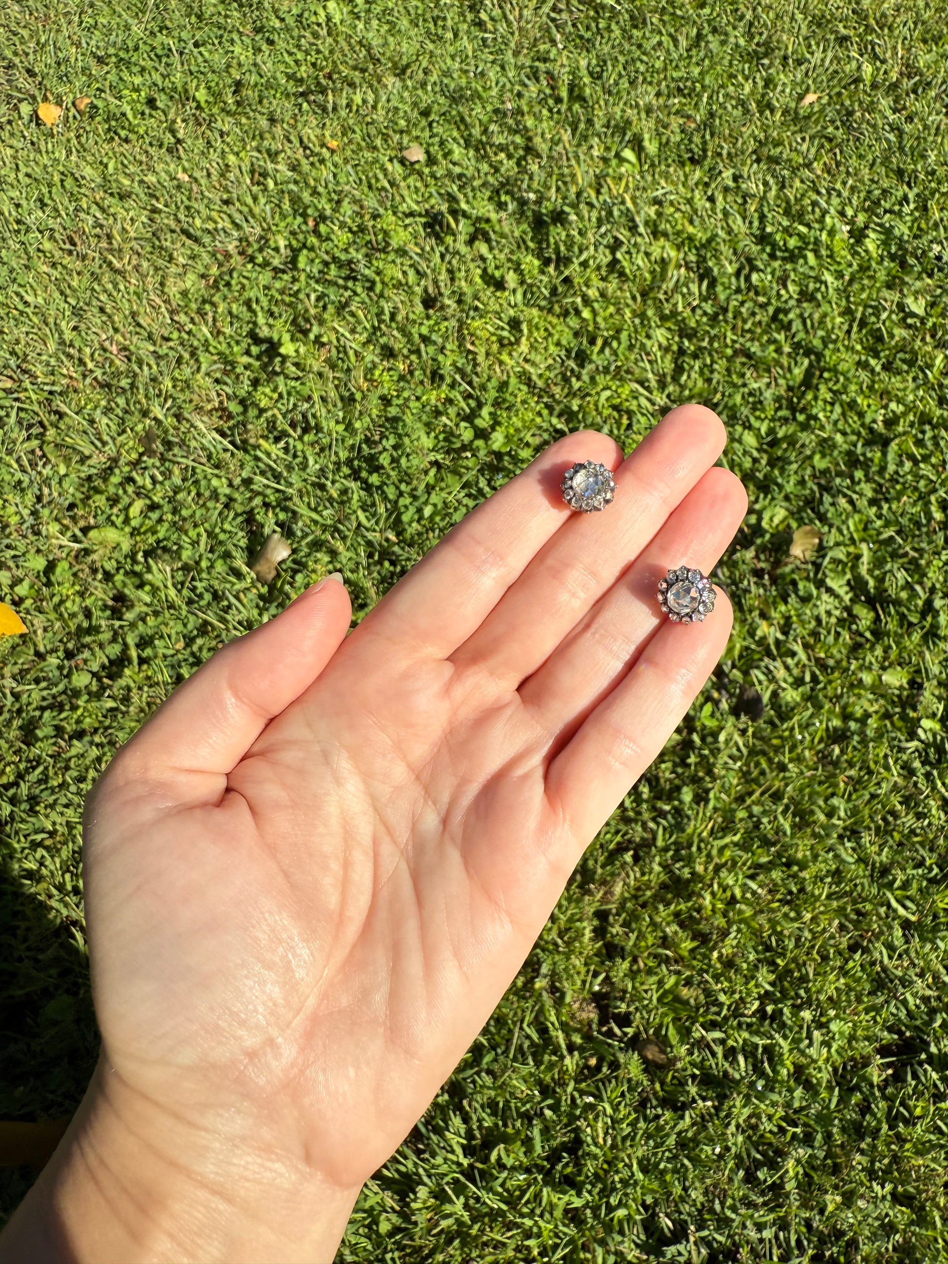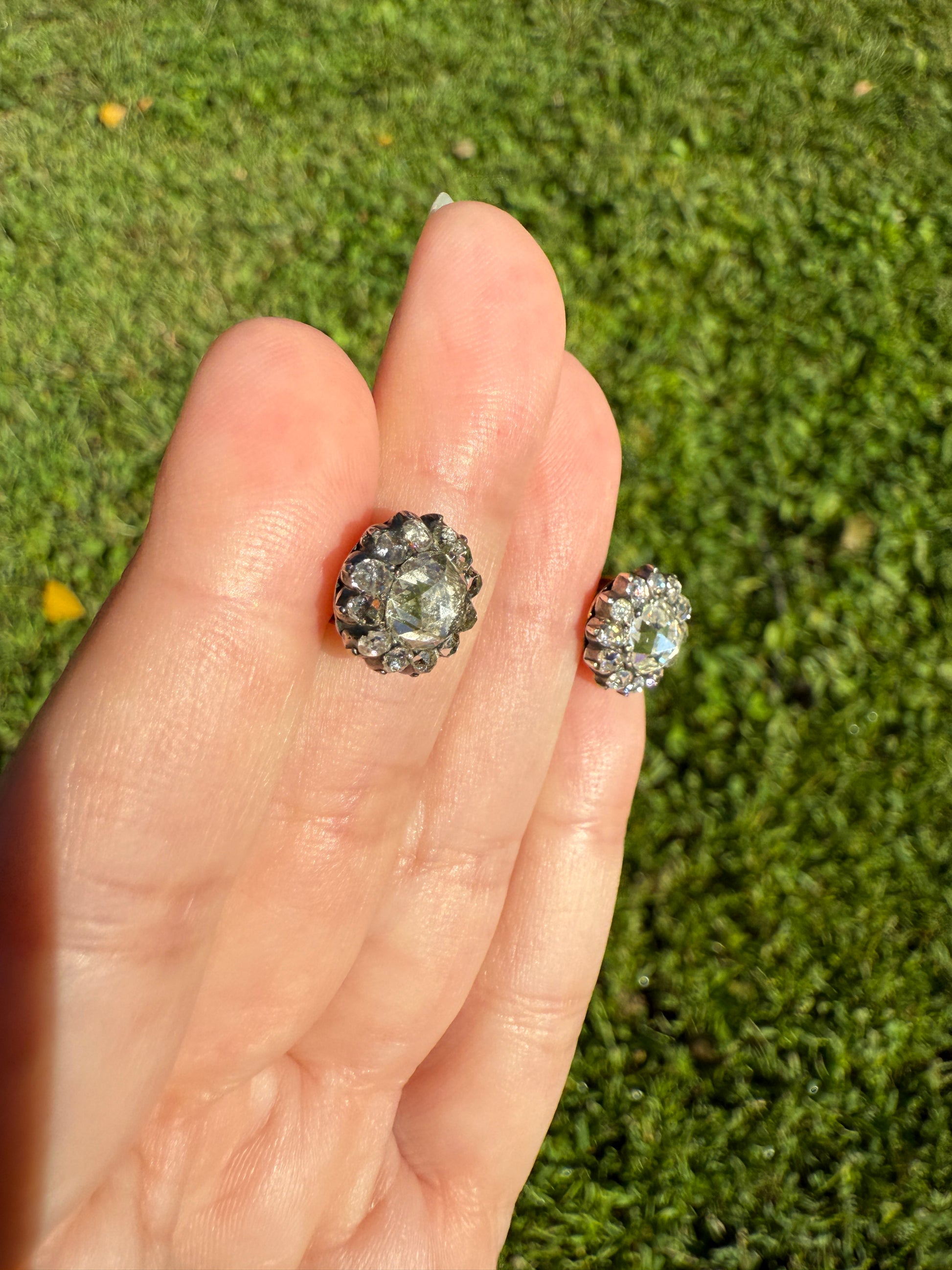 These antique stud earrings are further accented by a halo of smaller rose cuts. These studs are sort like little buttons with slightly domed gold backs holding the ear posts that are worn with push backs. Nice size to the amazing chunky cut center rose cuts.