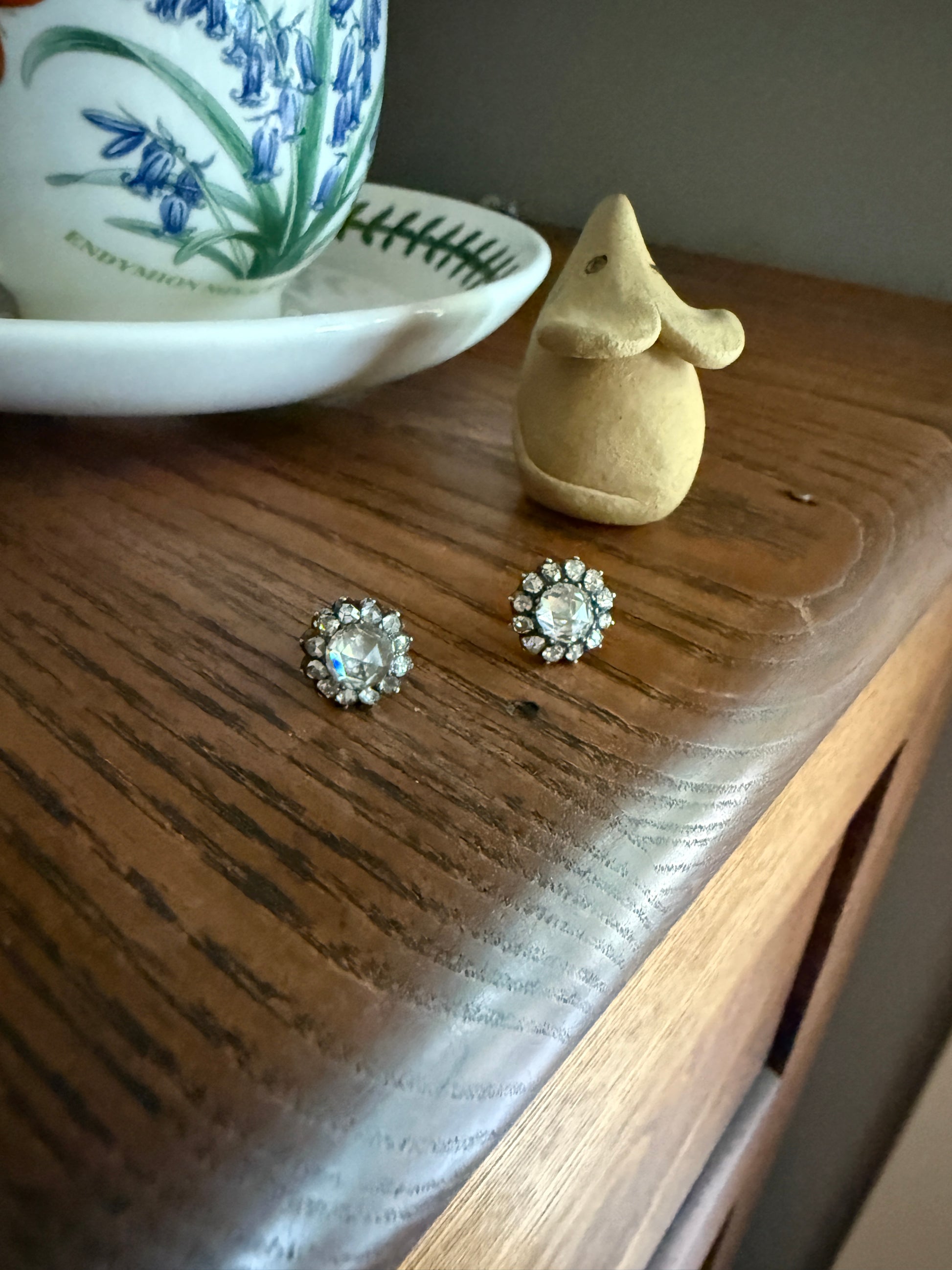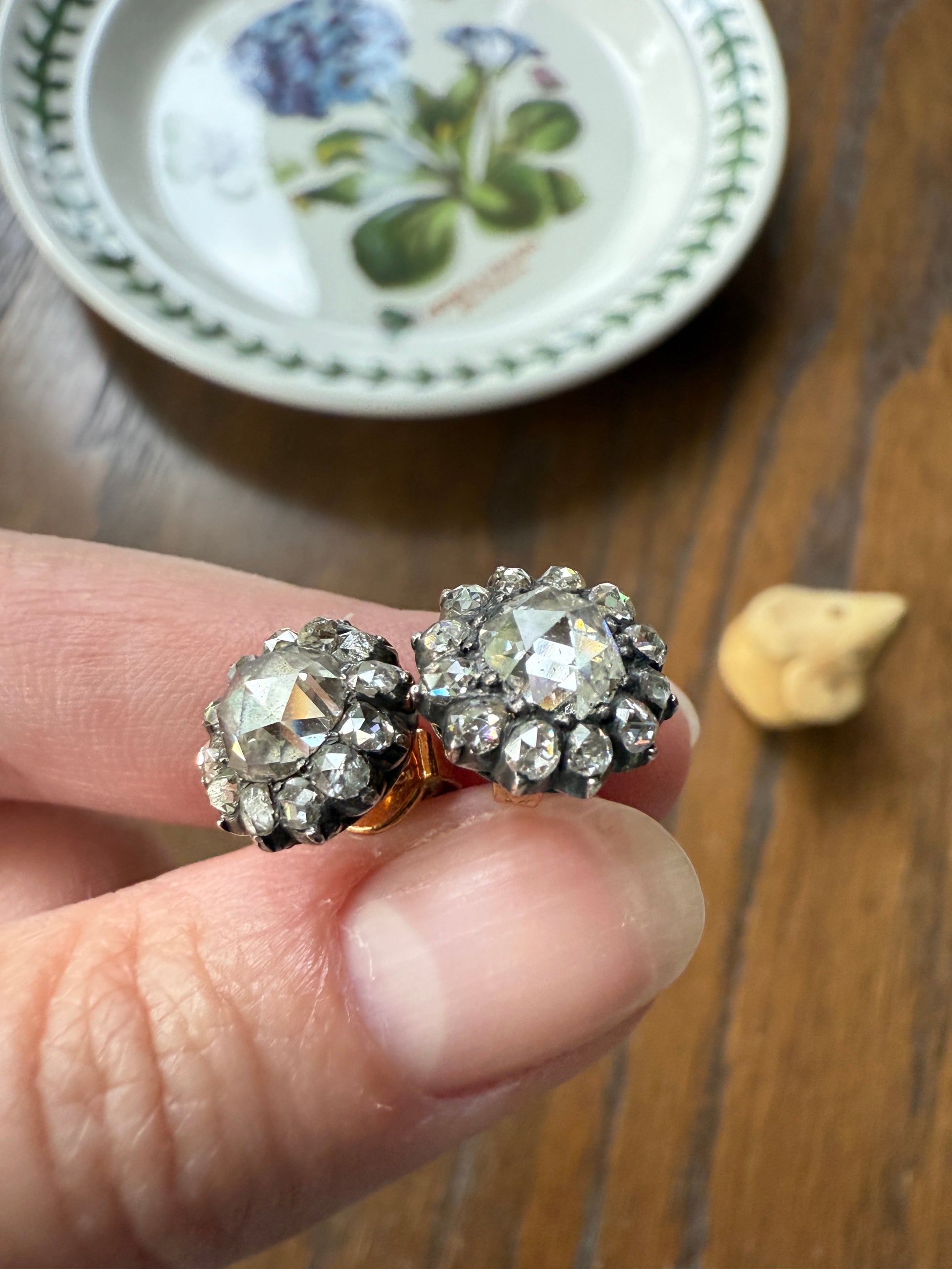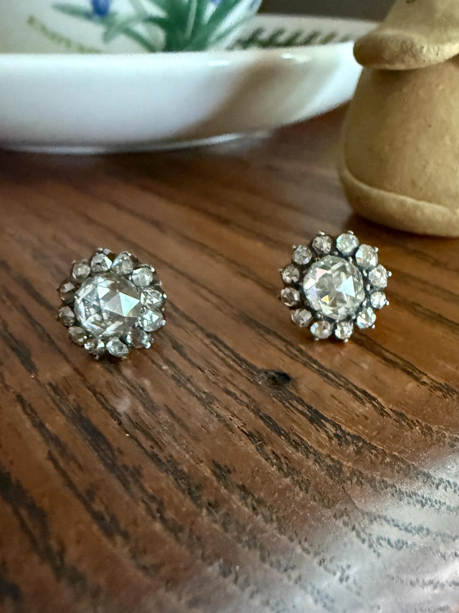 These antique stud earrings are further accented by a halo of smaller rose cuts. These studs are sort like little buttons with slightly domed gold backs holding the ear posts that are worn with push backs. Nice size to the amazing chunky cut center rose cuts.