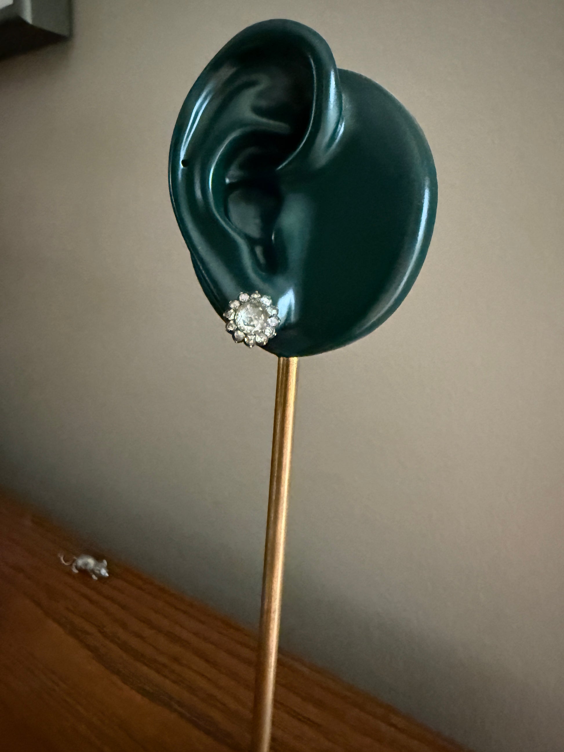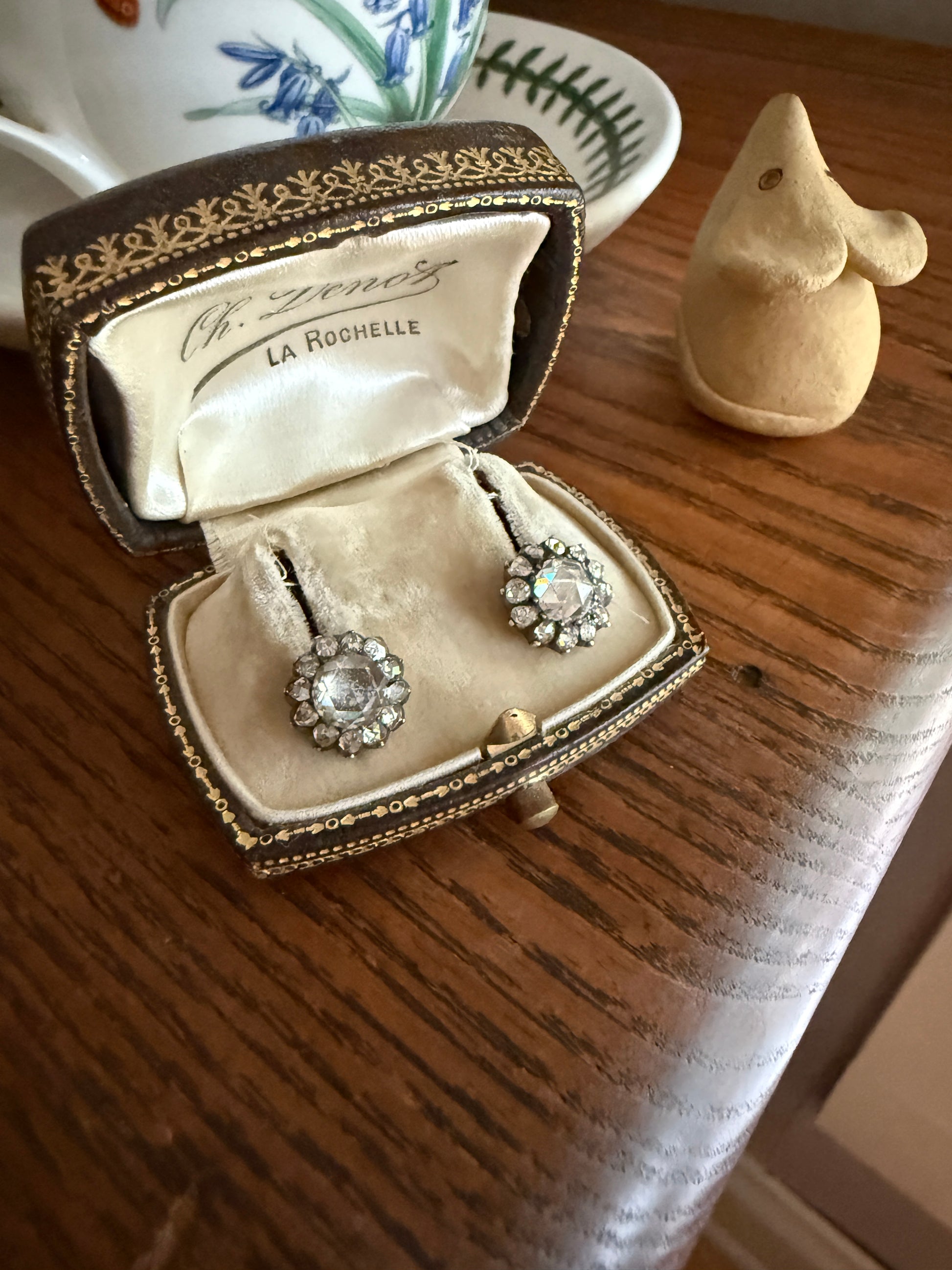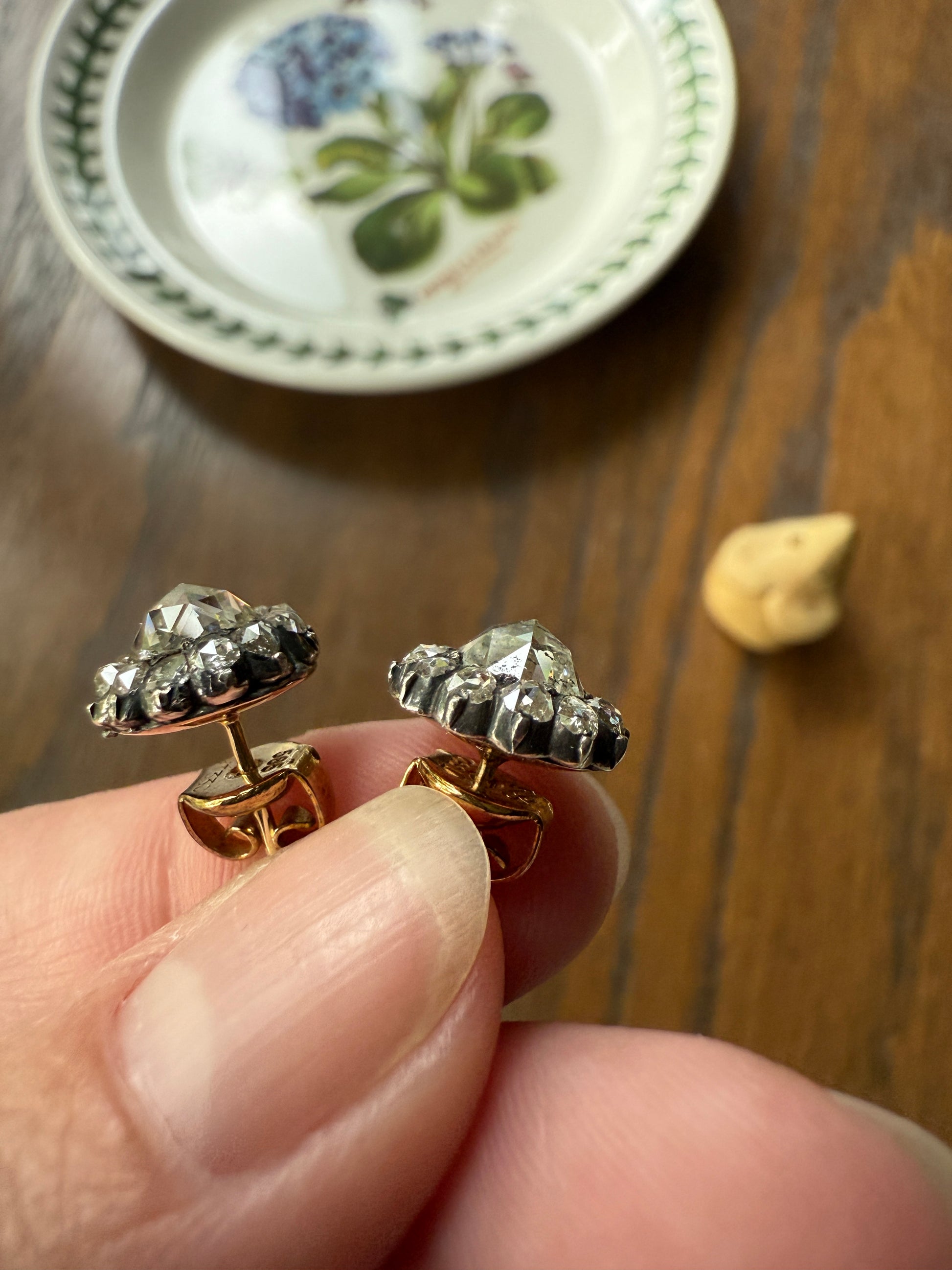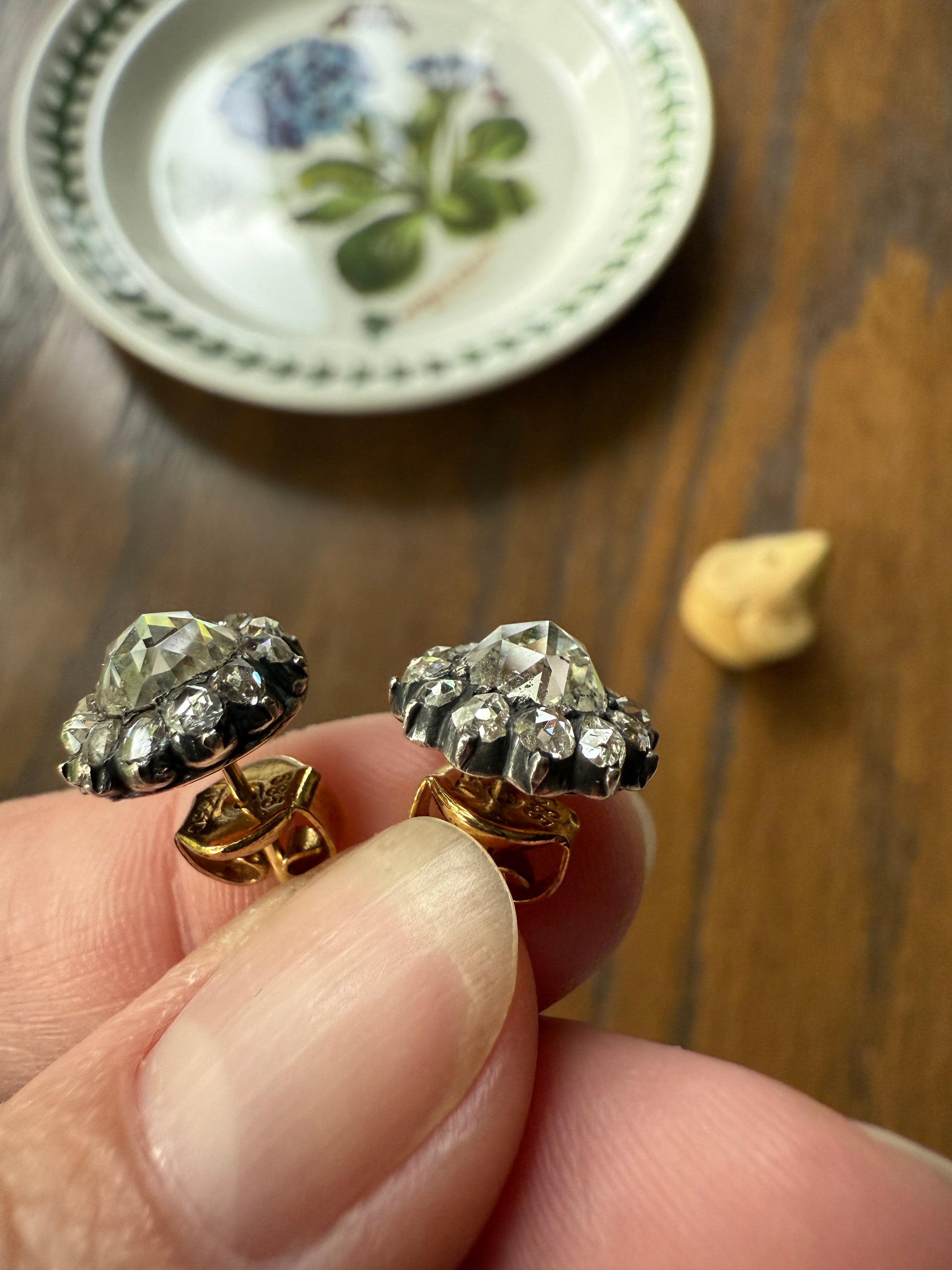 I think the push backs while still showing patina and age might not be original to the earrings as the back of the earrings are a rosier gold and the push backs are a more rich yellow gold. But this variance is not visible when wearing them. The diamonds are set in silver collet settings with little bead prongs.