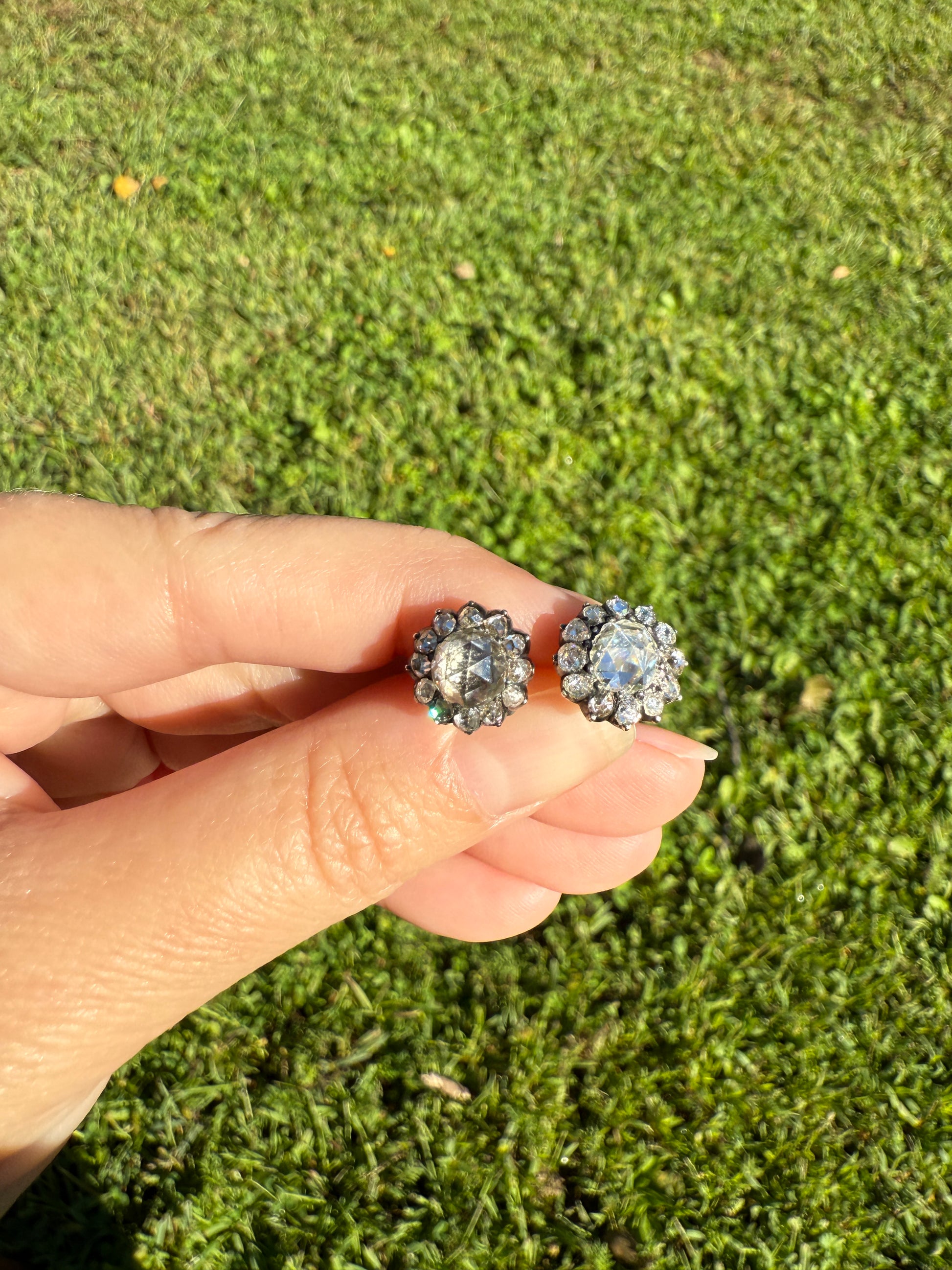 These are certainly not dull or lifeless in anyway, and not muddy overall but we see this often times due to age in closed back settings. The warmth and more muted reflectivity is more noticeable when the two are compared side by side than it would be when worn on opposite sides of the head, and the chunky stones really catch the light and emit rainbows of sparkles. We don't recommend 24/7 wear on these antique beauties because with the closed back settings they should not get wet. One of the push backs is a bit on the weaker side when it comes to having a bit less tension but it does the job. But I feel they are quite special. It is dark out now and these glitter bombs are just flashing away as I work with them. With the patina to the silver, could be dressed up or down!