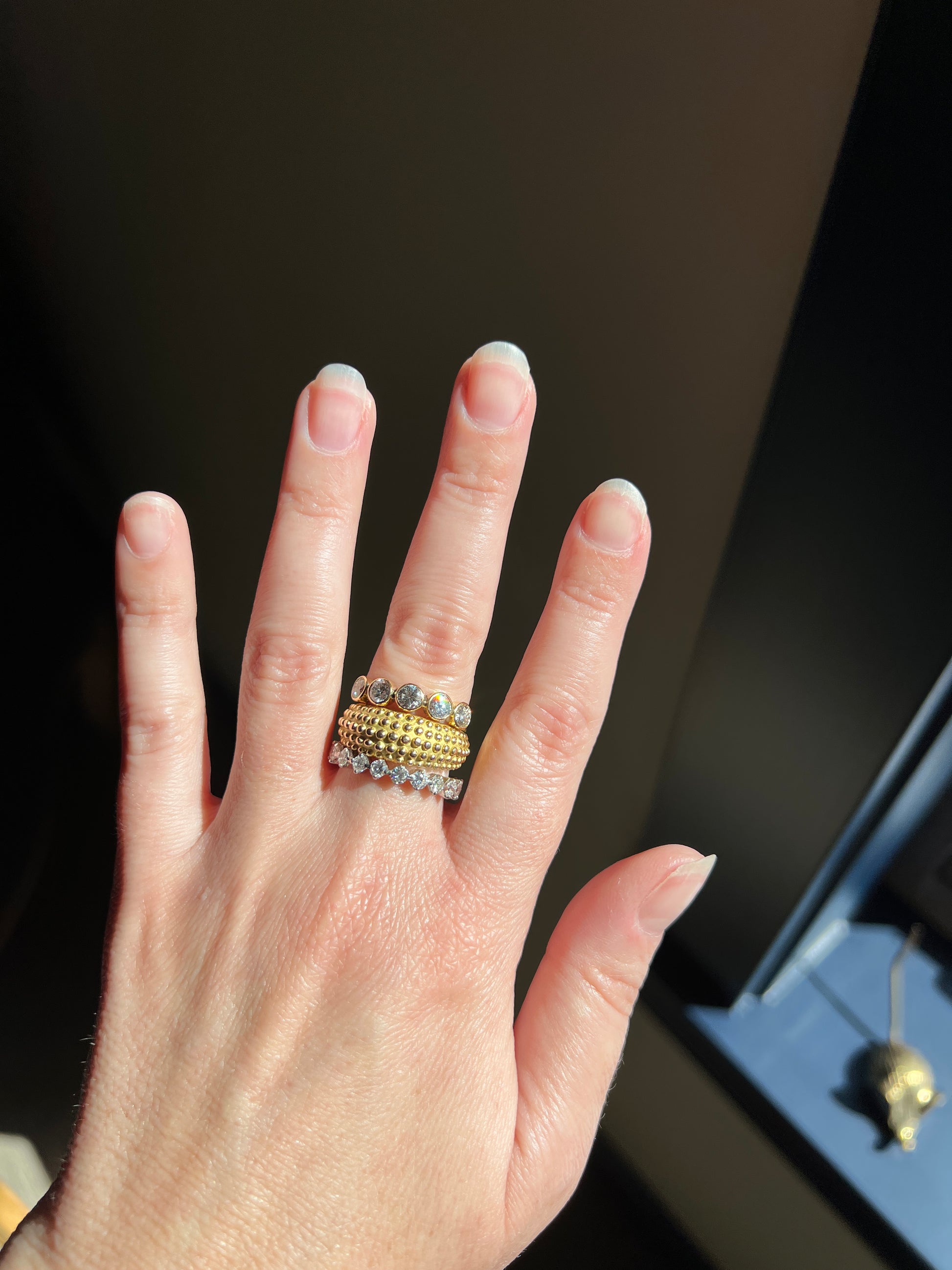 The ultimate stacker to add heft and texture to your ringstack. This French vintage piece is just so fun to layer. The substantial 18k gold setting domes off the finger and pairs well with really any other band or even a tall solitaire. Beautiful fabrication with high shine to the raised ball rivet details, and a satin / matte finish to the recesses for a two tone contrast. The beaded gold details continue all the way around the piece to the back of the shank where we find the French hallmark for 18k gold.