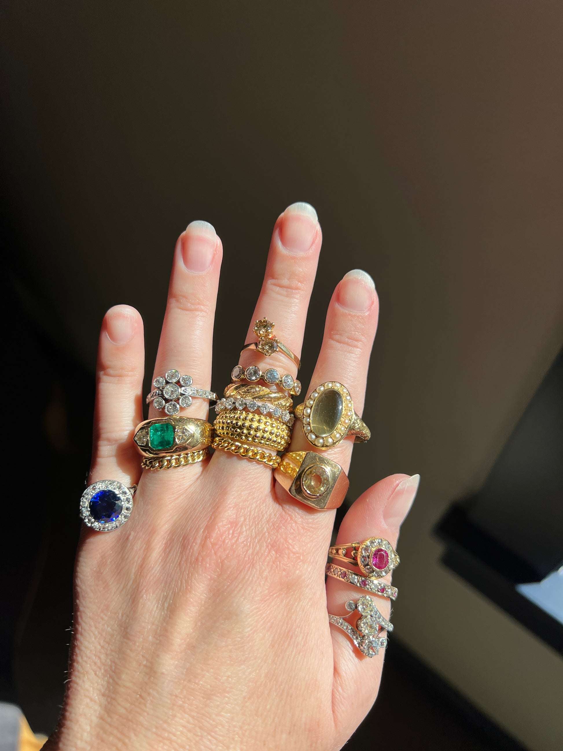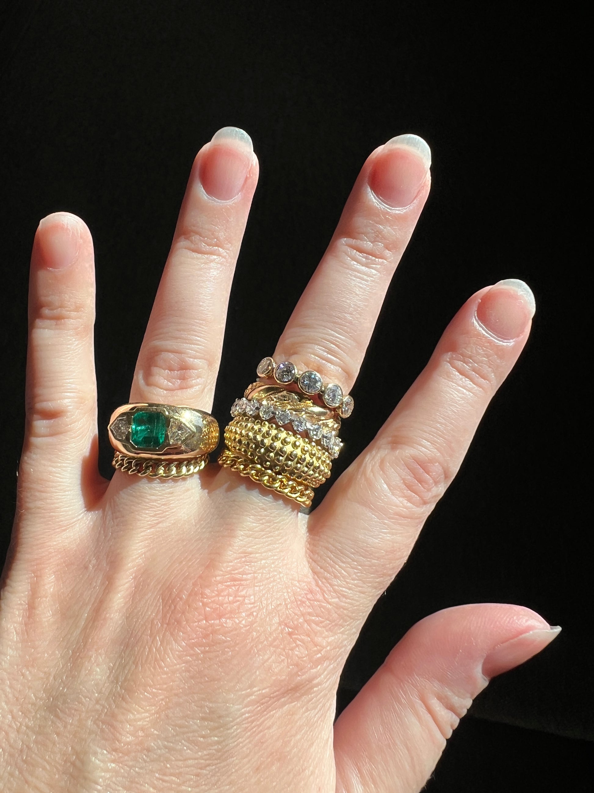 I had a lot of fun mixing and matching this one with other pieces, especially pairing it with a little sparkle. Its timeless design has a retro but still modern vibe. It seems to blend well with my old cut diamond bands, along with any other skinny or chunky vintage pieces, adding a unique detail and design, drawing the eye without being overbearing.