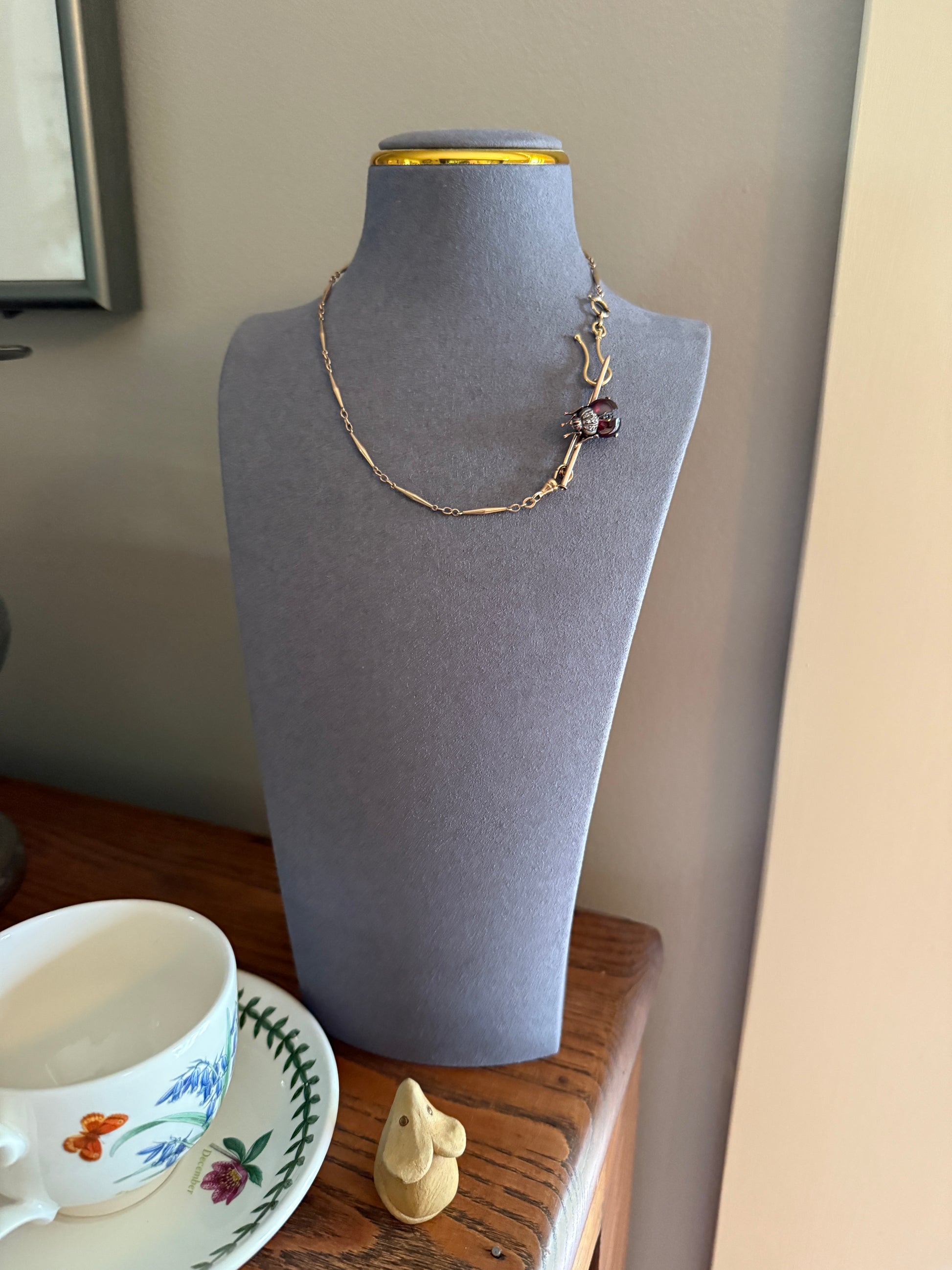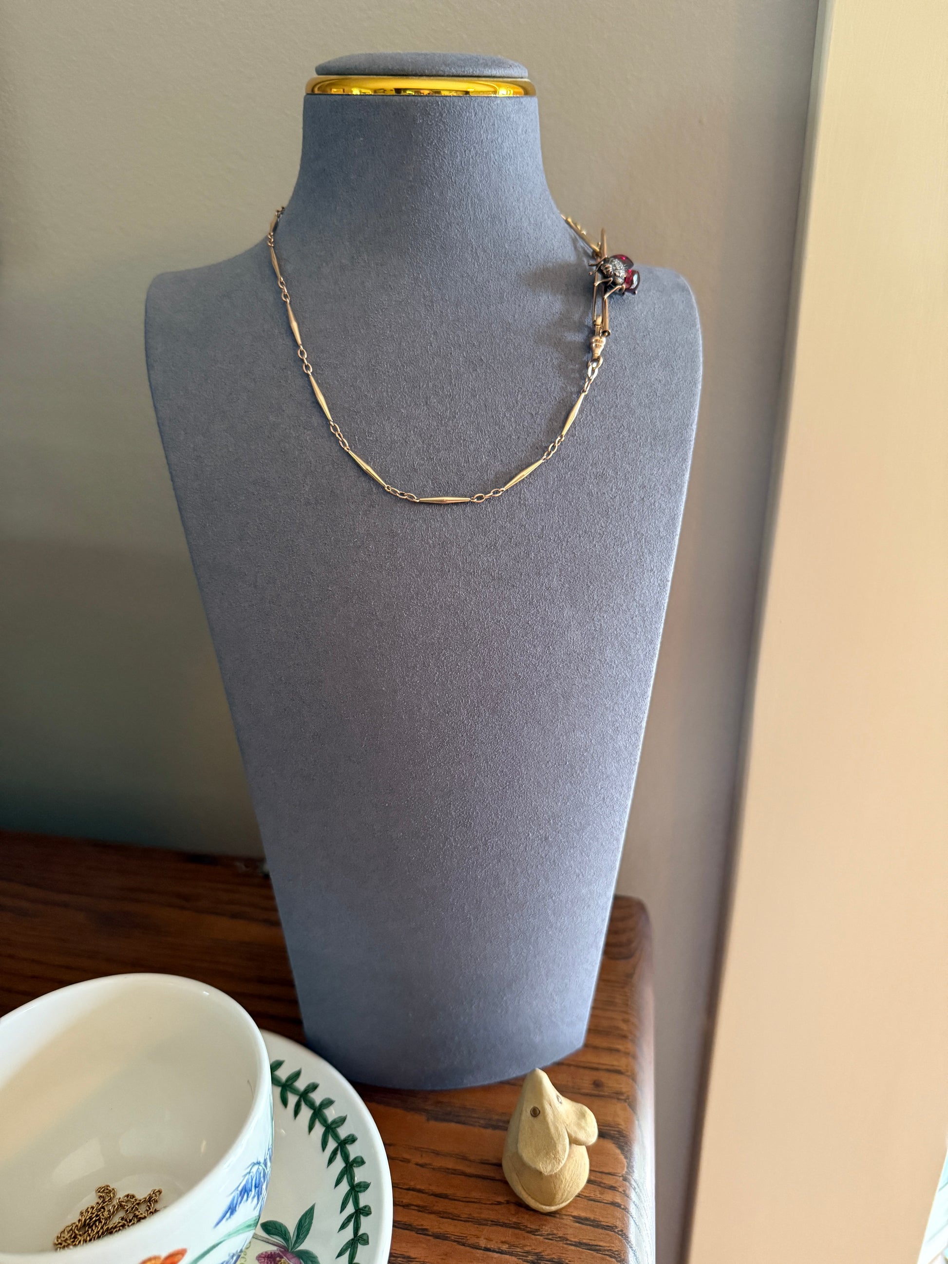 This is currently a whimsical brooch but could also be used as a connector on the ends of a chain, or converted as desired to a pendant by your local jeweler. I was able to style it with a chain in photos but it does swivel or teeter some as it doesn't want to lie perfectly flat on the decollette with the pin back - but hopefully it gives you an idea of how it would look. Chain not included.