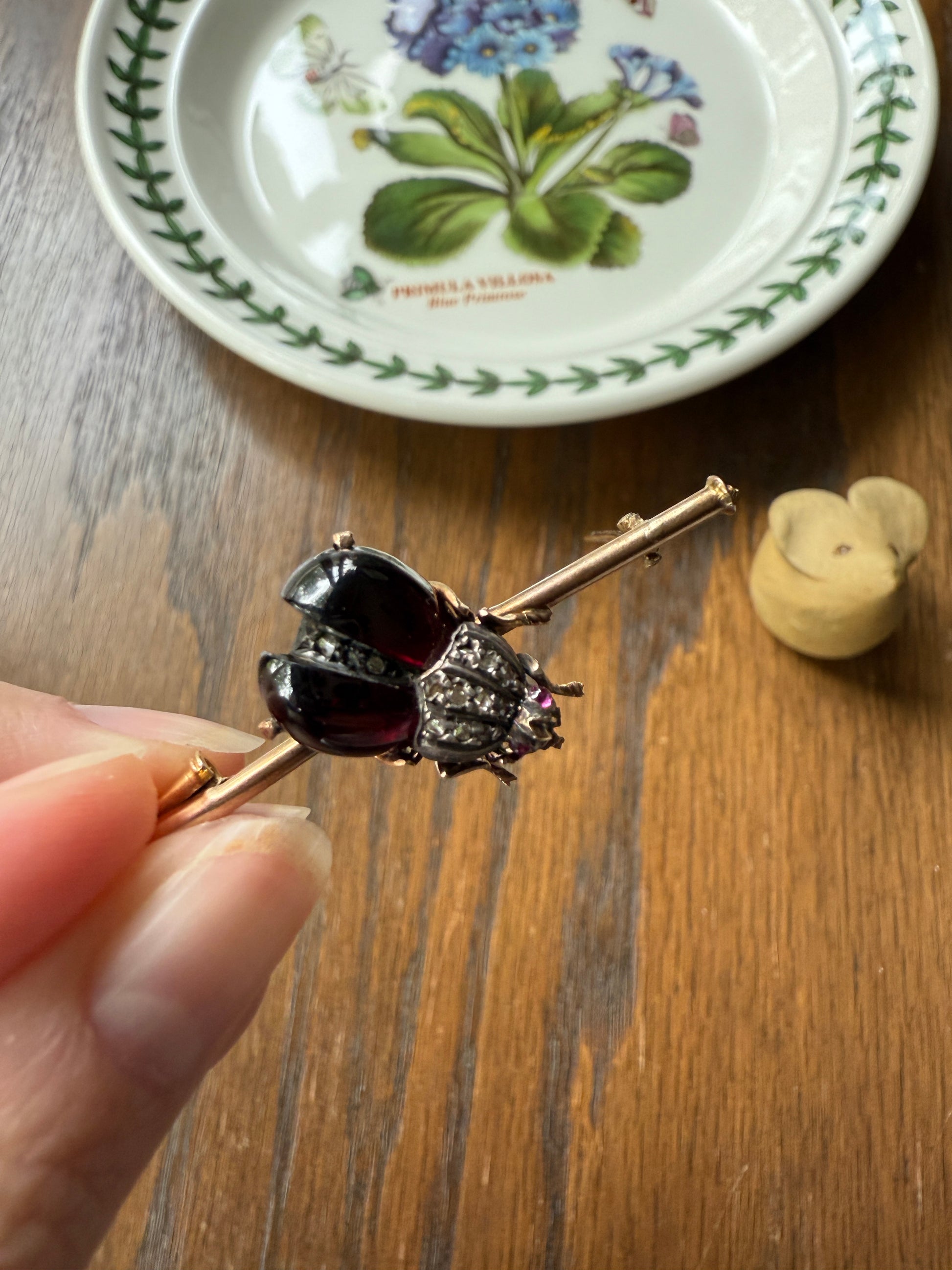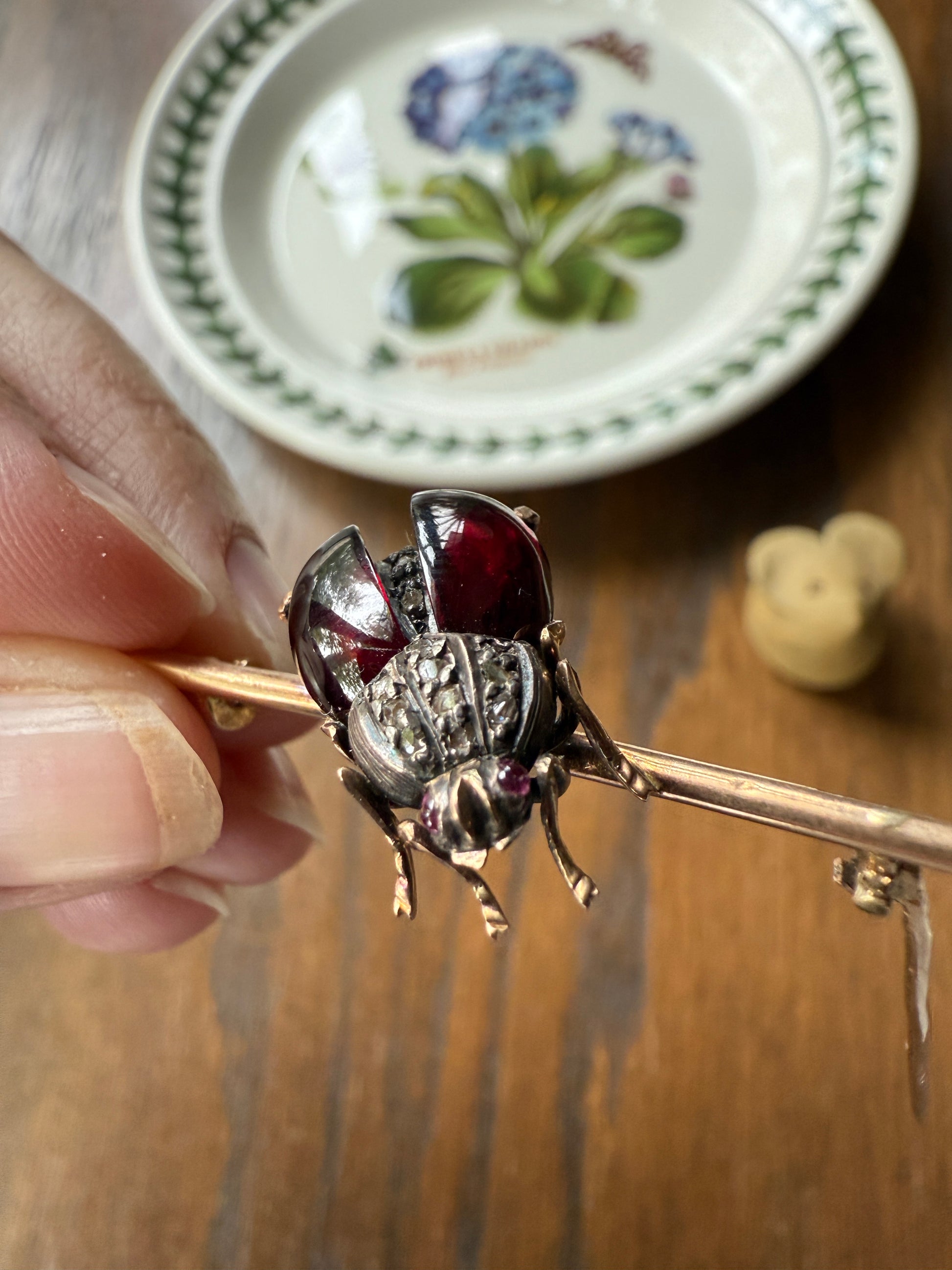 Ladybug BUG Beetle GARNET Wing Rose Cut Diamond French Antique Victorian Figural Pin Brooch for Pendant 18k Gold
