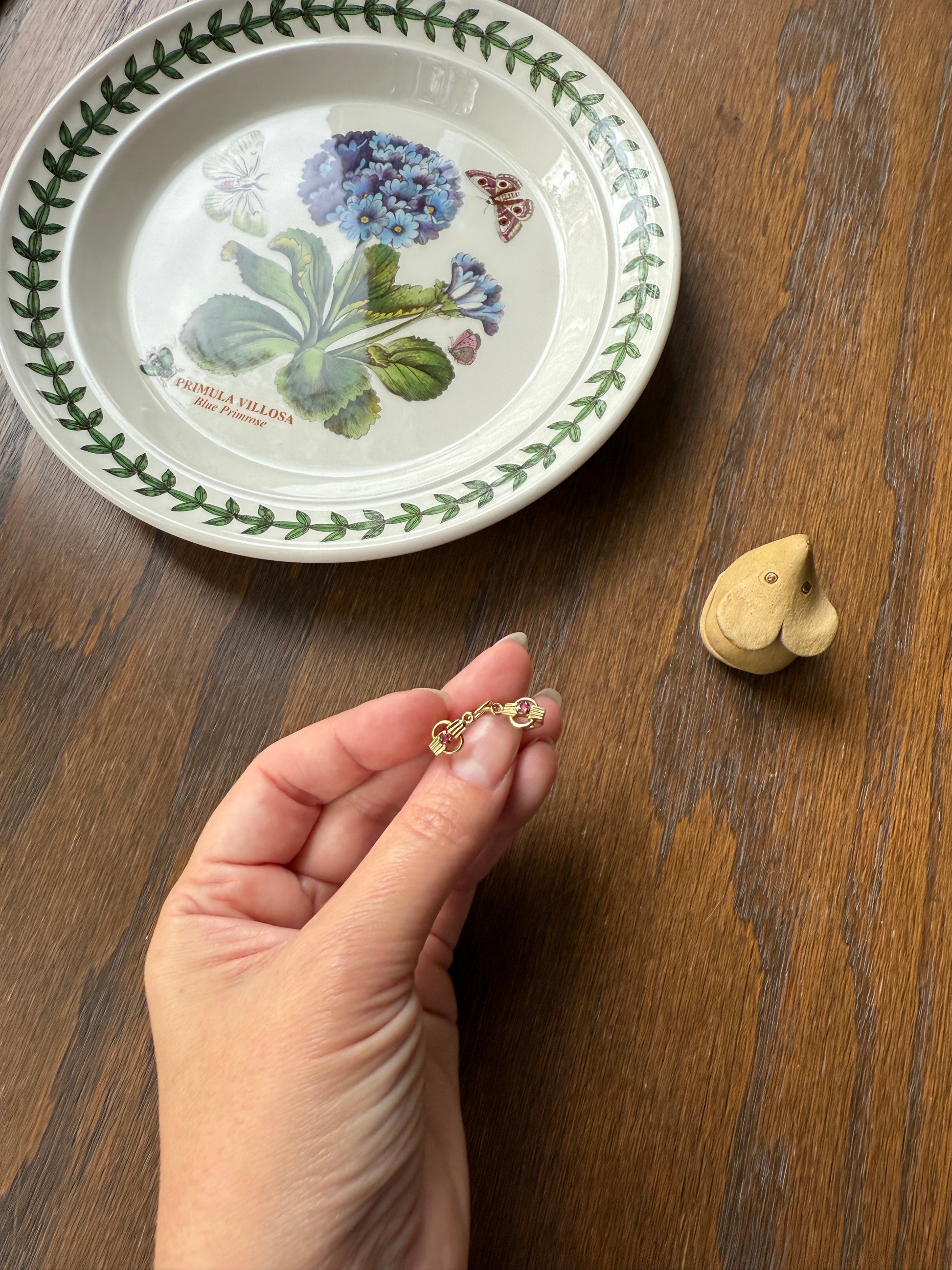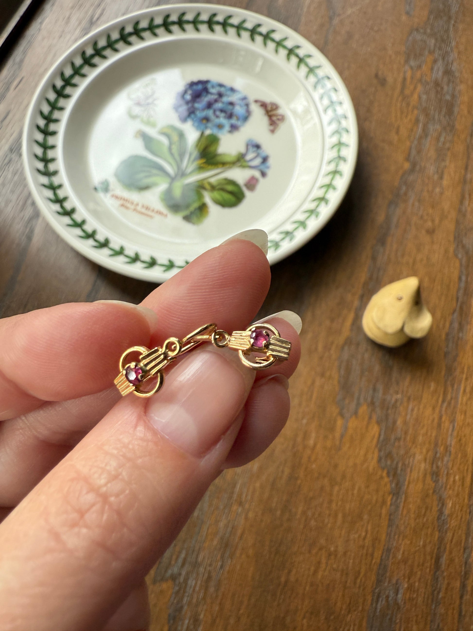 This has the French gold fill hallmark - The French were known for their high quality gold fill fabrication methods during this time. These are each set with a small ruby, I'm sure synthetic considering the fabrication of the earrings.