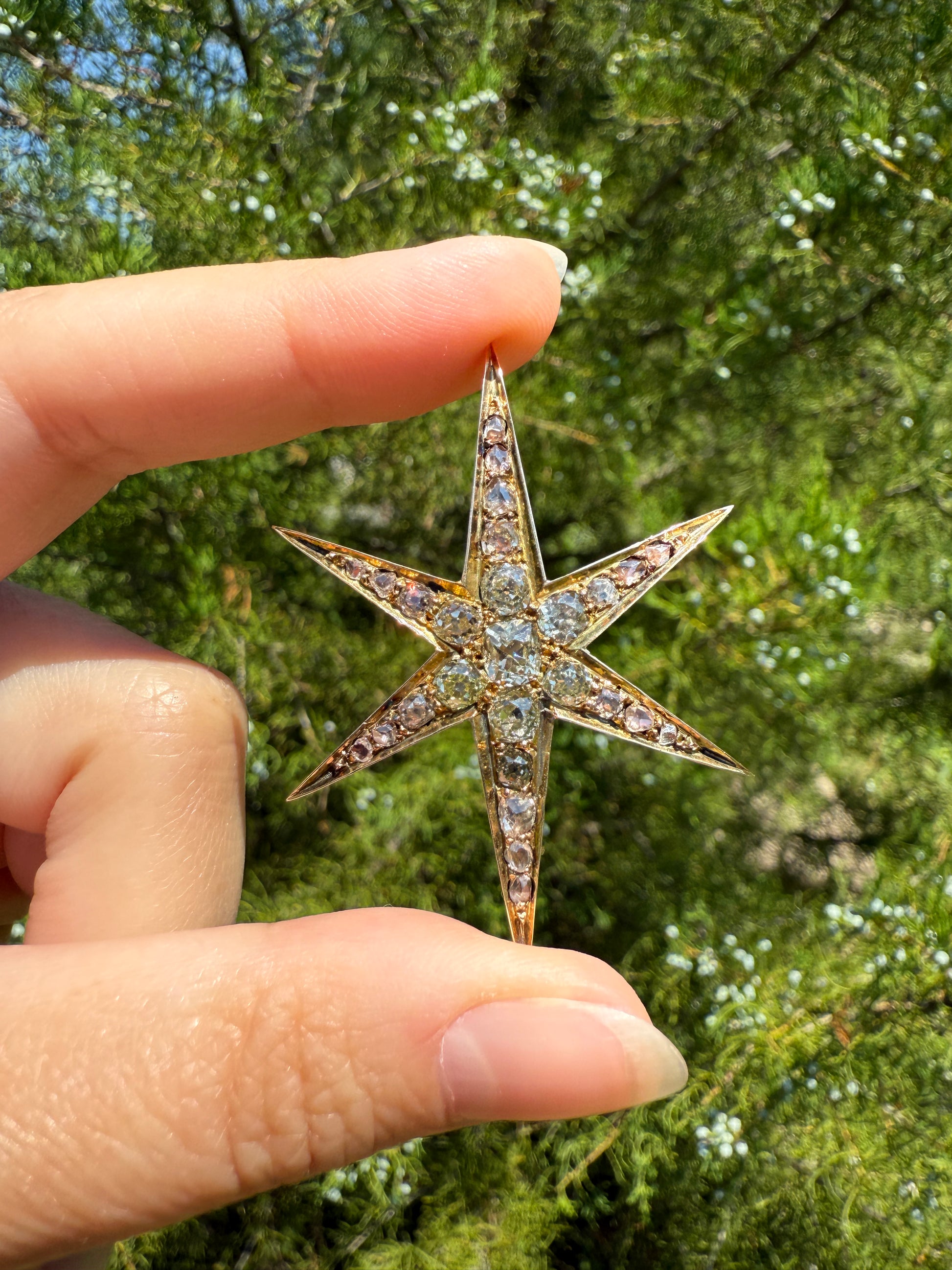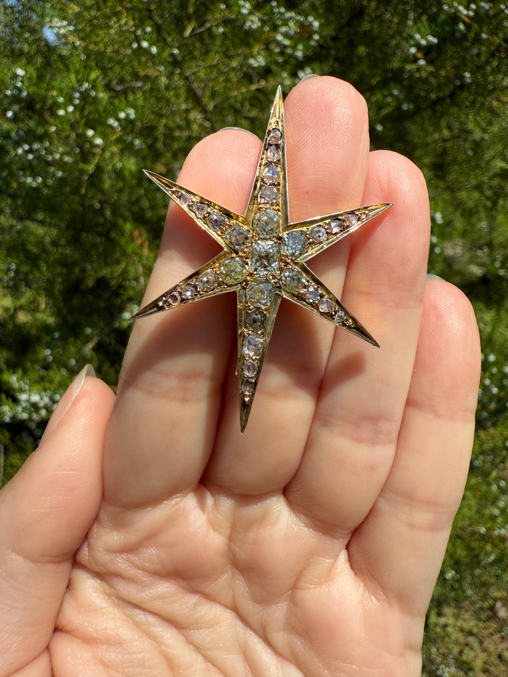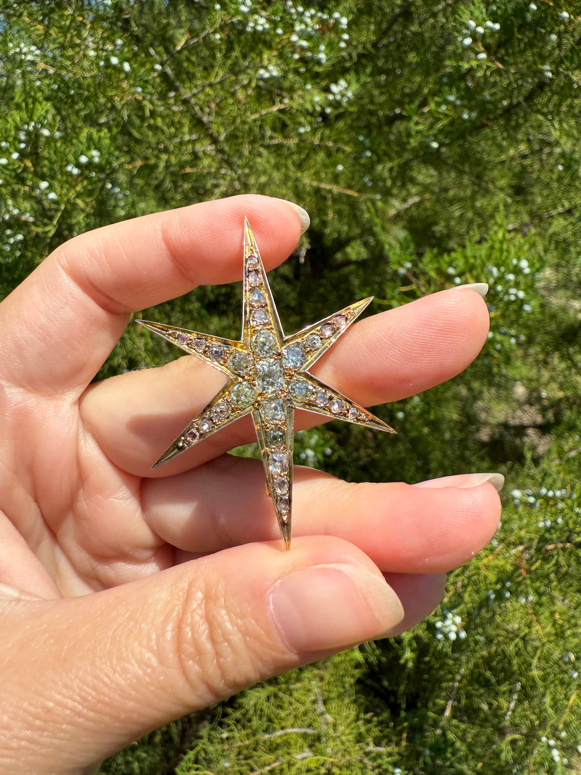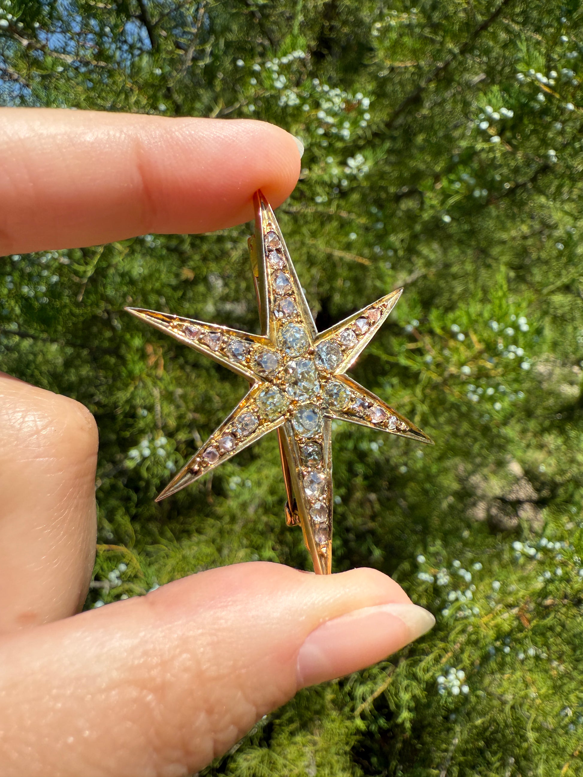 One of my best stars ever! I love this one for the gorgeous hues to the old cut diamonds. A few of the old mine cuts are pale yellow in color. And some of the old mine and rose cuts have a blush pink hue, I assume from organic age to the closed back setting. A beauty to view from side to see the high crowns of the chunky stones but wow I love the coloring.
